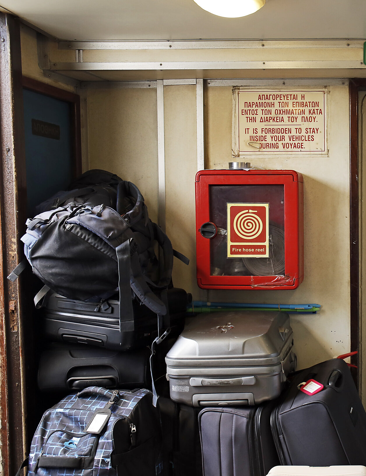Ο ήλιος είναι καυτός αυτή την μεσημεριανή ώρα και ο καταπέλτης κλείνει ακριβώς πίσω από το δίτροχό μου, σκοτεινιάζοντας το πακτωμένο από προϊόντα και οχήματα γκαράζ του. Οι εργαζόμενοι του πλοίου, ευγενείς και χαμογελαστοί, στερεώνουν καλά τα οχήματα και τα δίτροχα πριν καν αναπτυχθεί η ταχύτητα πλεύσης. Η εικόνα στο γκαράζ μοιάζει με σπαζοκεφαλιά, αφού οι προμήθειες, από τρόφιμα μέχρι ηλεκτρικές συσκευές, υλικά και ό,τι βάζει ο νους, έχουν τοποθετηθεί με τάξη στις σωστές γωνιές.