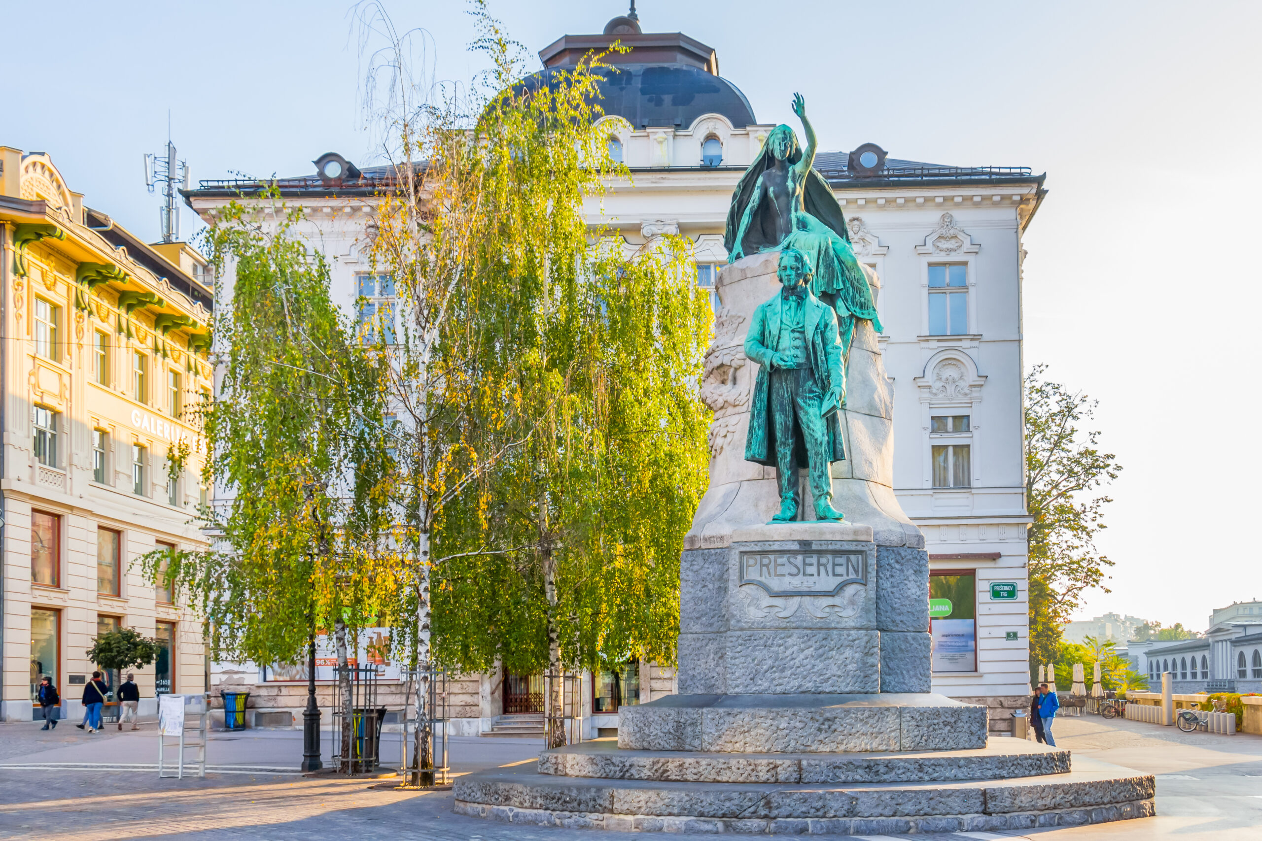 Γεννημένος στις 3 Δεκεμβρίου του 1800, στο μικρό χωριό Upper Carniolan, o Prešeren θεωρείται ηγετική μορφή των γραμμάτων στη Σλοβενία, ενώ είναι ο συγγραφέας που έγραψε το πρώτο έπος στην ιστορία της σλοβένικης λογοτεχνίας. Στην ίδια πλατεία, θα δείτε και το άγαλμα που κατασκευάστηκε προς τιμήν του, ένα μνημείο ύψους τρεισήμισι μέτρων που στέκει επιβλητικό απέναντι από τις τρεις γέφυρες τα τελευταία 117 χρόνια. Το άγαλμα του Prešeren είναι ευρέως γνωστό με την ονομασία The Prešeren Monument και είναι έργο του διάσημου Σλοβένου γλύπτη Ivan Zajec.