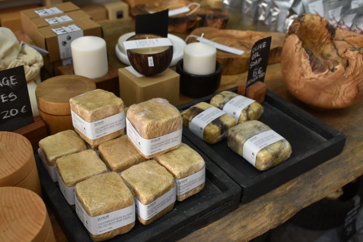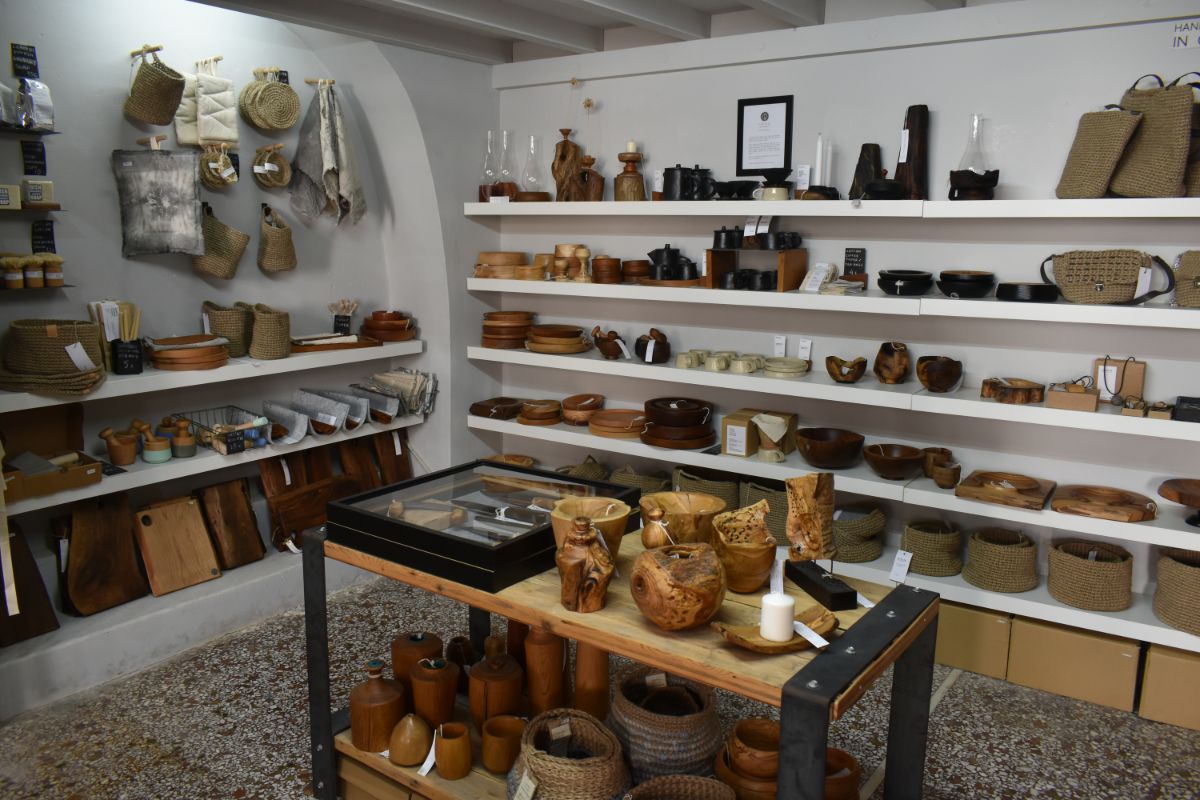 Εκείνη επιμελείται και τη σύνθεση των φυσικών καλλυντικών που παρασκευάζονται σε εγκεκριμένα εργαστήρια, πλέκει τις τσάντες και τα καλάθια που διατίθενται εντός του χώρου, ενώ τα καλαίσθητα ξύλινα αντικείμενα που θα δείτε στα ράφια είναι χειροποίητες δημιουργίες του συζύγου της. Η γκάμα των μοναδικών προϊόντων συμπληρώνεται με μια εντυπωσιακή σειρά ξυριστικών αξεσουάρ, από ιαπωνικού τύπου λεπίδες, φαλτσέτες με ξύλινες λαβές και δερμάτινες θήκες, έως πινέλα και μπολ, φτιαγμένα εξ΄ολοκλήρου στο χέρι από το έναν και μόνο τεχνίτη, το γιό της ιδιοκτήτριας.
