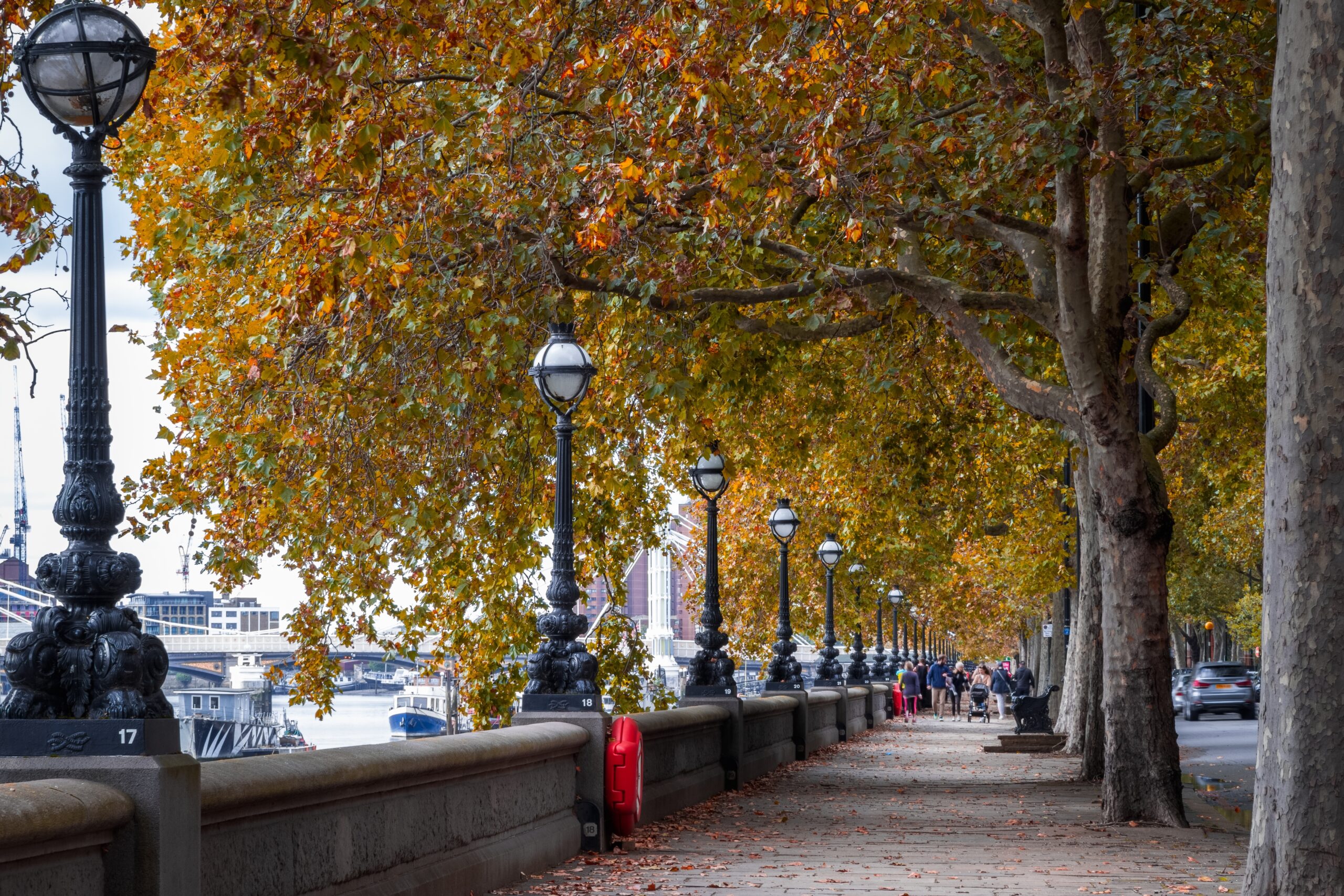 Κατηφορίζοντας δε στα γεμάτα κίνηση δρομάκια του γραφικού Chelsea και στο στολισμένο με περίτεχνους φανοστάτες Chelsea Embankment στις όχθες του ποταμού, θα απολαύσετε τη βόλτα σε μια από τις πιο φωτογενείς περιοχές της πόλης, στρωμένη με ξερά φύλλα αυτούς τους μήνες, με τα καφεκίτρινα δέντρα να σχηματίζουν αψίδες από πάνω σας και τα παγκάκια να σας καλούν να θαυμάσετε με την ησυχία σας τη ρομαντική θέα πέρα από την εντυπωσιακή Albert Bridge.