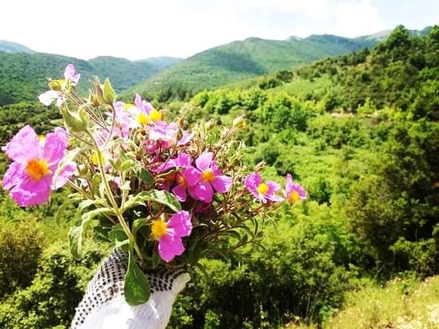 Το πρώτο βότανο του βουνού που ξεχωρίζει, είναι ο κίστος ή λαδανιά (Cistus incanus), που το συλλέγει σε δύο φάσεις. Μαζεύει τα νεαρά φύλλα και τους βλαστούς στην αρχή της άνοιξης και τα ανθισμένα μωβ λούλουδια τον Ιούνιο. Ένα από τα πιο αντιοξειδωτικά βότανα, με σπουδαία αντιική, αντιμικροβιακή και αντιβακτηριδιακή δράση. Επιπλέον, αποτοξινώνει το σώμα και αποβάλλει τα βαρέα μέταλλα. Ένας πολύ ενδιαφέρον τρόπος χρήσης που μας προτείνει, είναι ο συνδυασμός βάμματος λαδανιάς και βάμματος πρόπολης σε μείγμα σε μορφή σπρέι. Εκτός από την πόσιμη χρήση, δηλαδή, μπορούμε να πάρουμε τα οφέλη που έχει αυτός ο δυναμικός συνδυασμός, με το ψεκασμό. Ένα ακόμη εξαιρετικό βότανο που θα ξεχώριζε είναι η αχίλλεια (Αchillea millefolium), ιδανική για το δέρμα σε μορφή φυτικής κρέμας, χάρη στις περίφημες επουλωτικές της ιδιότητες. Είναι, επίσης, ένα από τα σπουδαία γυναικεία βότανα. Το γνωρίζουμε παραδοσιακά, αλλά είναι και επιστημονικά τεκμηριωμένο πλέον, μας εξηγεί η Δέσποινα, ως ένα σημαντικό ορμονορυθμιστικό. Τονώνει την έμμηνο ρύση, βοηθά στην εμμηνόπαυση και το προεμμηνορυσιακό σύνδρομο. Θεωρείται πως μαζί με τη λυγαριά και το δυνατό φασκόμηλο που θα χρησιμοποιούσαμε σε μικρότερο ποσοστό, δημιουργούν μια πολύτιμη συνέργεια.
