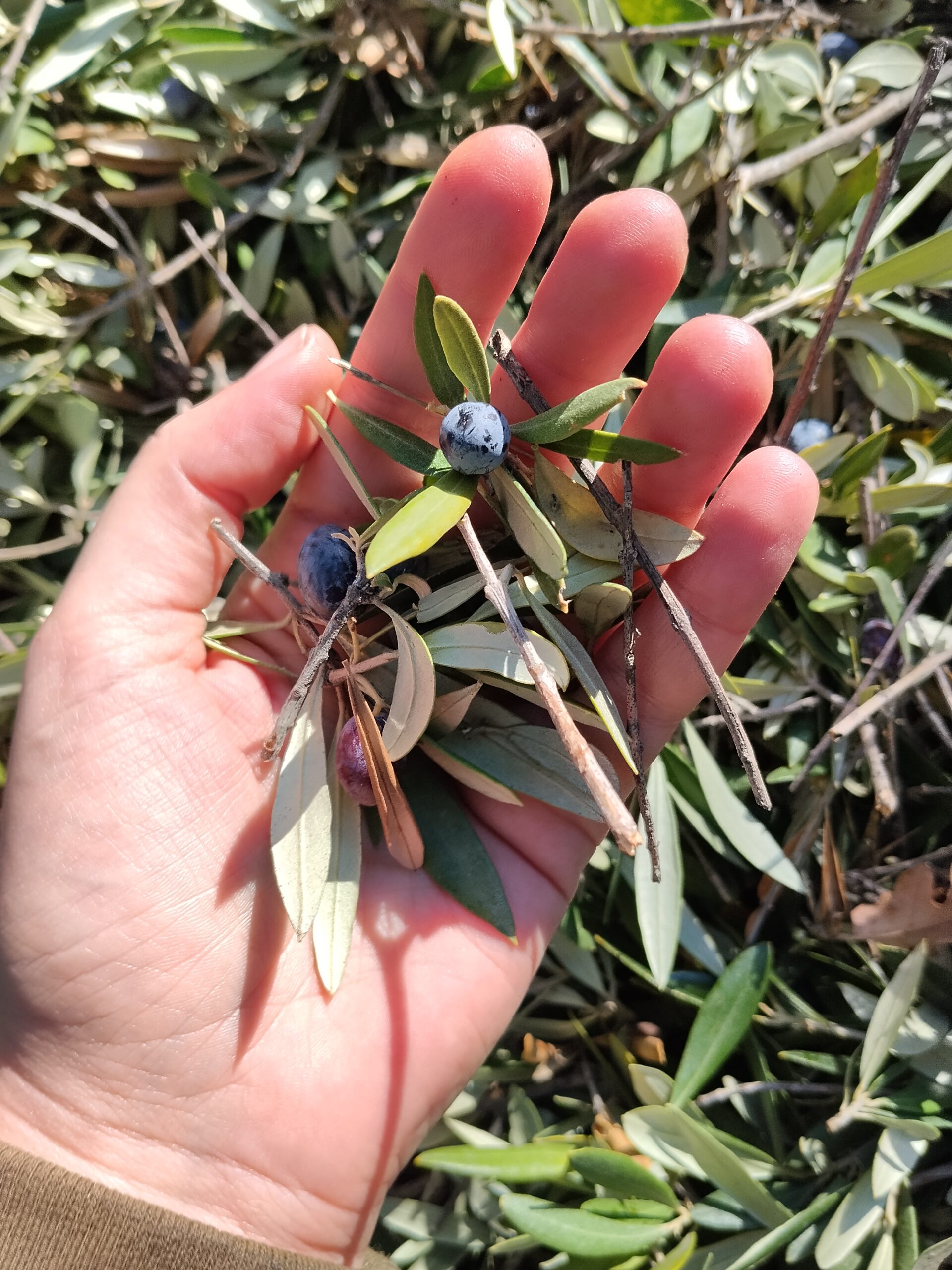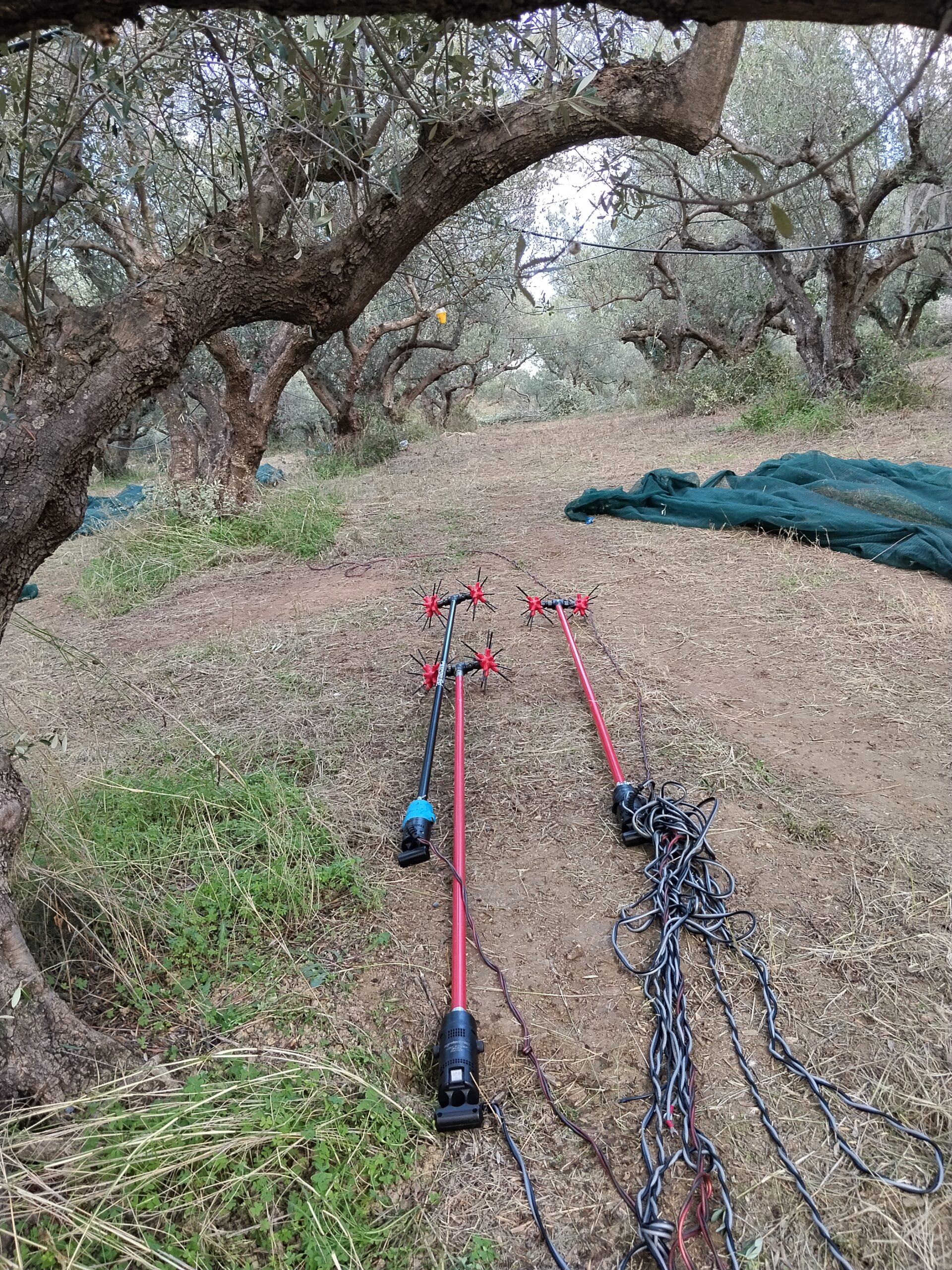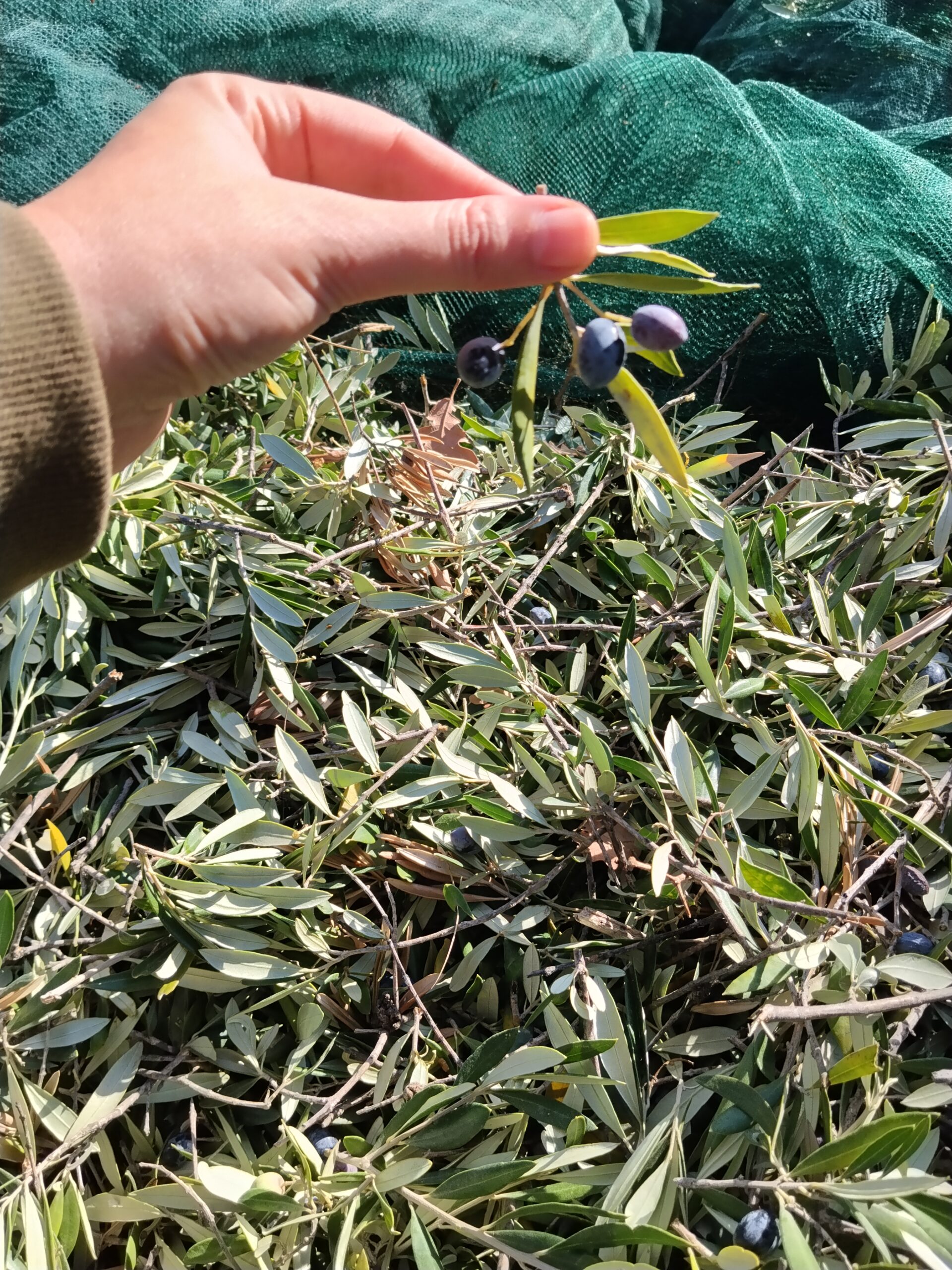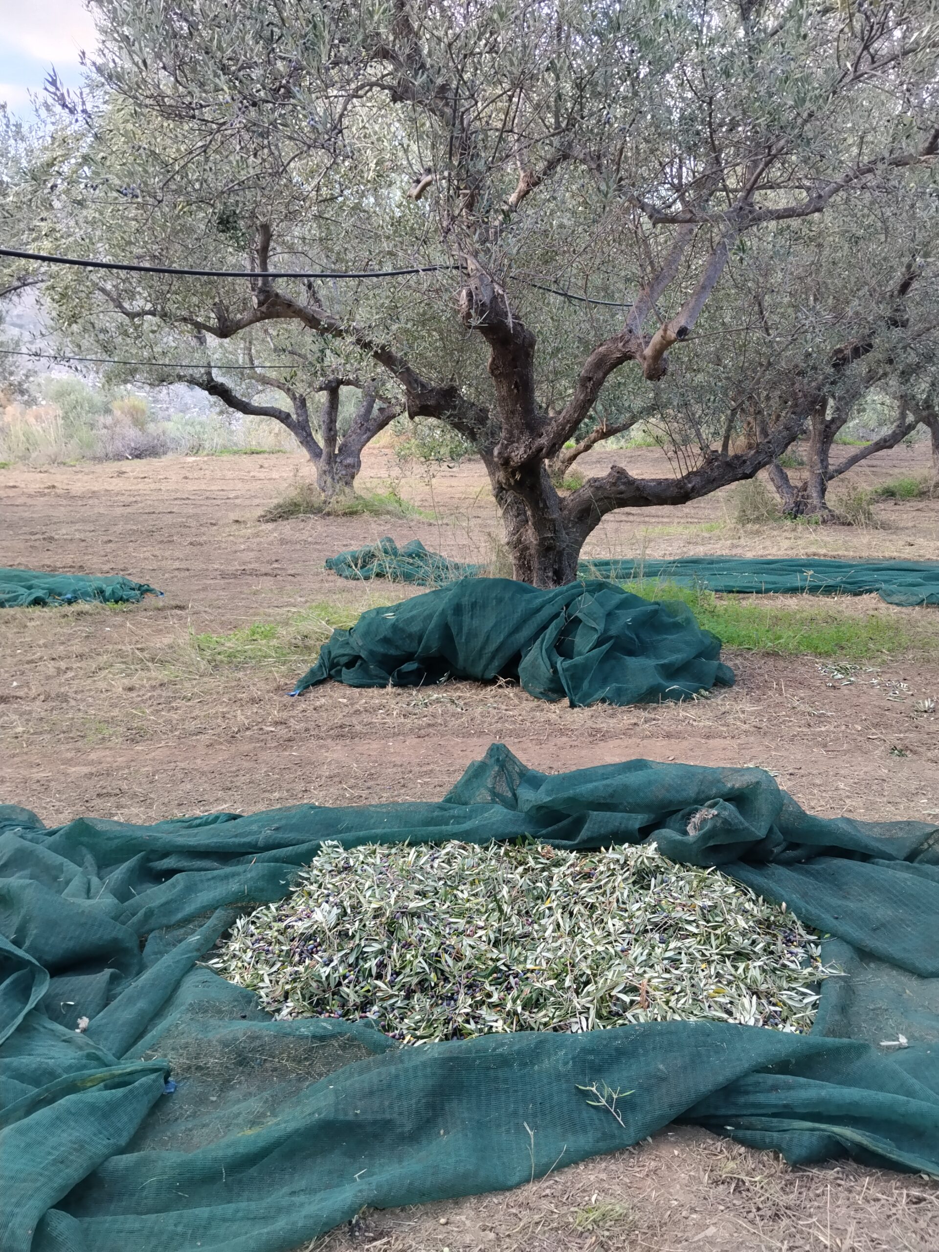 Φτάνουμε στο χωριό, η δουλειά ξεκινάει. Παίρνουμε τις γεννήτριες από την αποθήκη, κατεβαίνουμε στο χωράφι όπου είναι απλωμένα τα λιόπανα από την προηγούμενη μέρα, ψεκάζουμε με λιπαντικό τις βέργες των ραβδιών, φοράμε γάντια και γυαλιά. Τρεις στα ραβδιά, δύο στα πανιά και στο καθάρισμα. Το έδαφος έχει κλίση, τα πανιά κατά τόπους αιωρούνται πάνω στα ψηλά χόρτα και οι πατημασιές κοντά στους κορμούς ακολουθούνται από δυνατά «ωχ», που σημαίνει ότι γύρω από τις ελιές υπάρχουν αγκάθια. Πρώτο διάλειμμα για καφέ και δεκατιανό, τηλεφωνήματα για κάποιους, TikTok για κάποιους άλλους, συνέχεια με ράβδισμα και μάζεμα. Δεύτερο διάλειμμα για μεσημεριανό και ξανά δουλειά μέχρι το σχόλασμα. Αυτή η τελετουργία επαναλαμβάνεται καθημερινά.