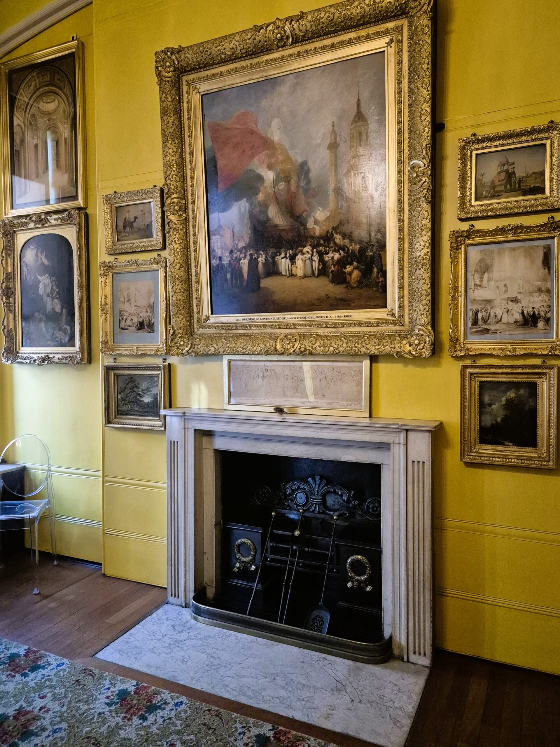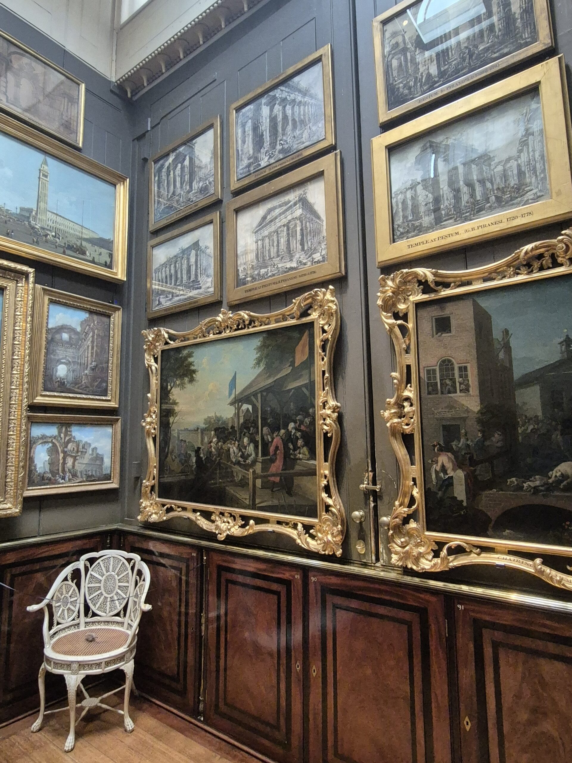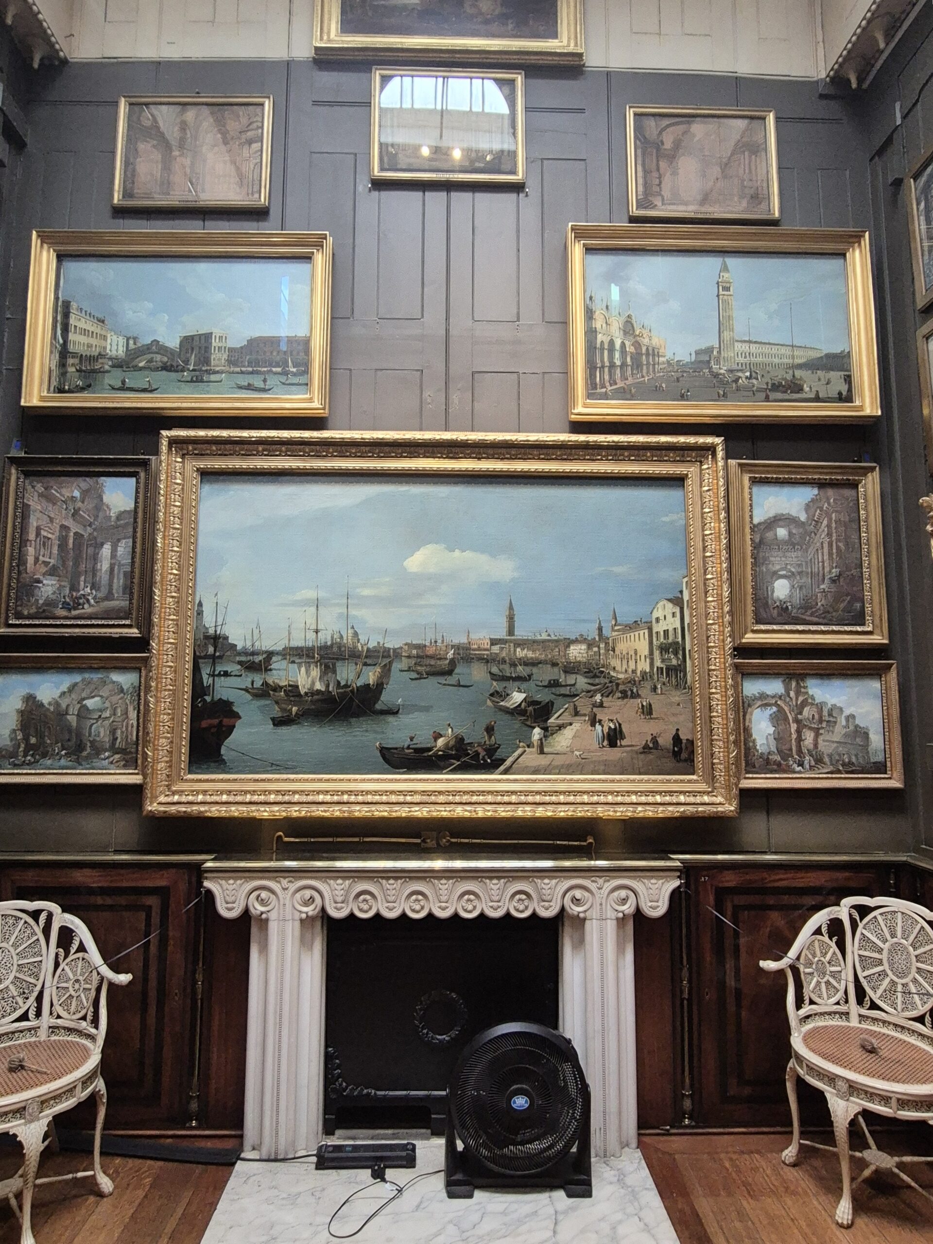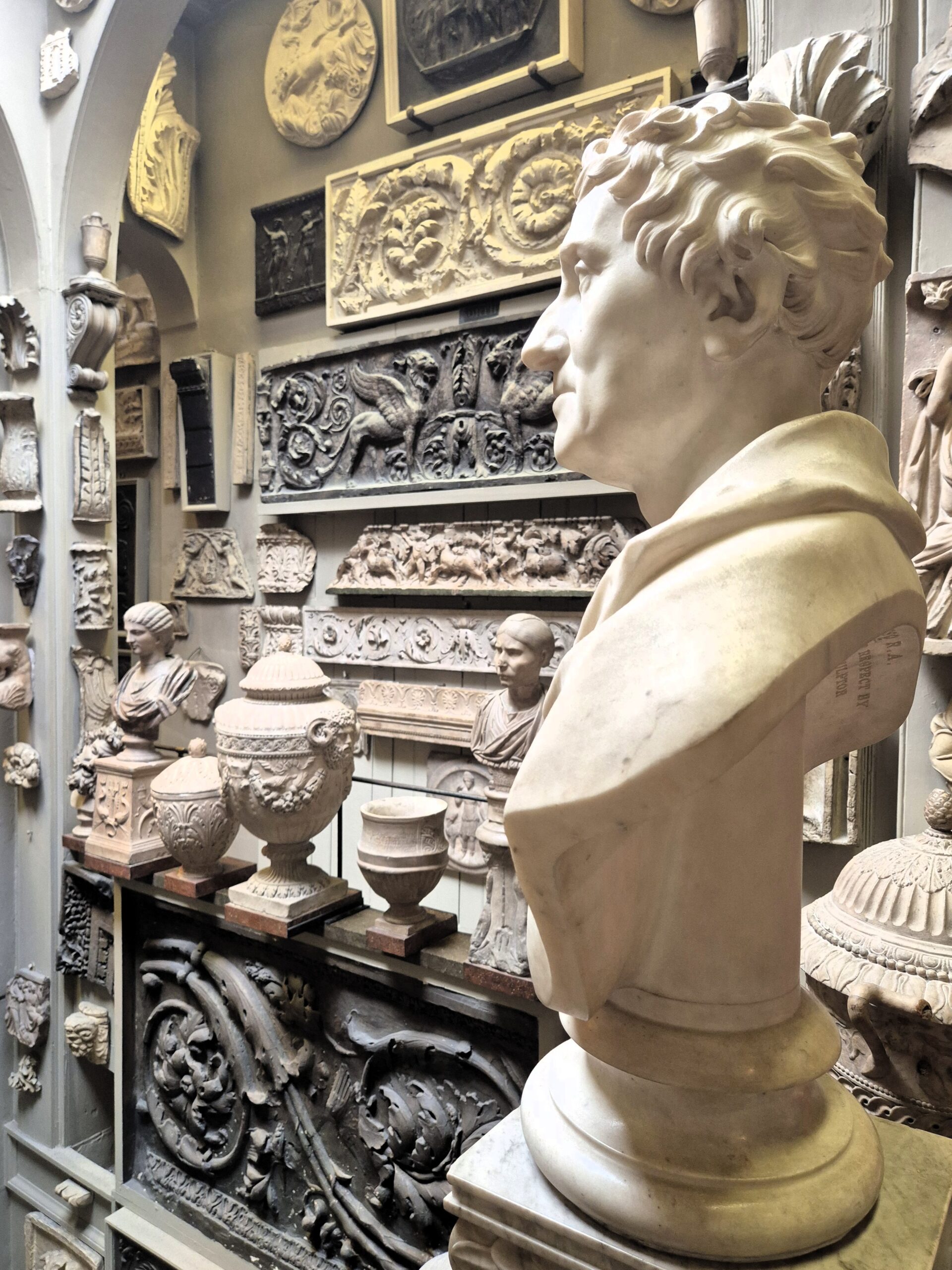 Κι ενώ σε κάθε σαλόνι διατηρούνται οι ασφυκτικά γεμάτες βιβλιοθήκες, στο δωμάτιο – πινακοθήκη, το λεγόμενο Picture Room, πέρα από 12 έργα του Hogarth, – τα 8 αποτελούν τη σειρά A Rakes’ Progress- θαυμάζουμε απόψεις της Βενετίας του Canaletto, πίνακες του J.M.W Turner τον οποίο συνέδεε βαθιά φιλία με τον Sloane, μια μεγάλη συλλογή έργων του Piranesi, αλλά κι ένα πορτρέτο του φιλότεχνου αρχιτέκτονα. Οι γύρω διάδρομοι οδηγούν σε δωμάτια, αίθρια και θολωτούς χώρους, ασφυκτικά γεμάτους αρχαία μαρμάρινα θραύσματα, αγαλματίδια, προτομές, γύψινα εκμαγεία και το εντυπωσιακό, μικρής κλίμακας αντίγραφο της περίφημης Αρτέμιδος της Εφέσου. Ιδιαίτερο ενδιαφέρον παρουσιάζει και το δωμάτιο με τα υπό κλίμακα μοντέλα ναών και μνημείων της αρχαίας Ρώμης και της Πομπηίας – κάποια μάλιστα είναι φτιαγμένα από φελλό.