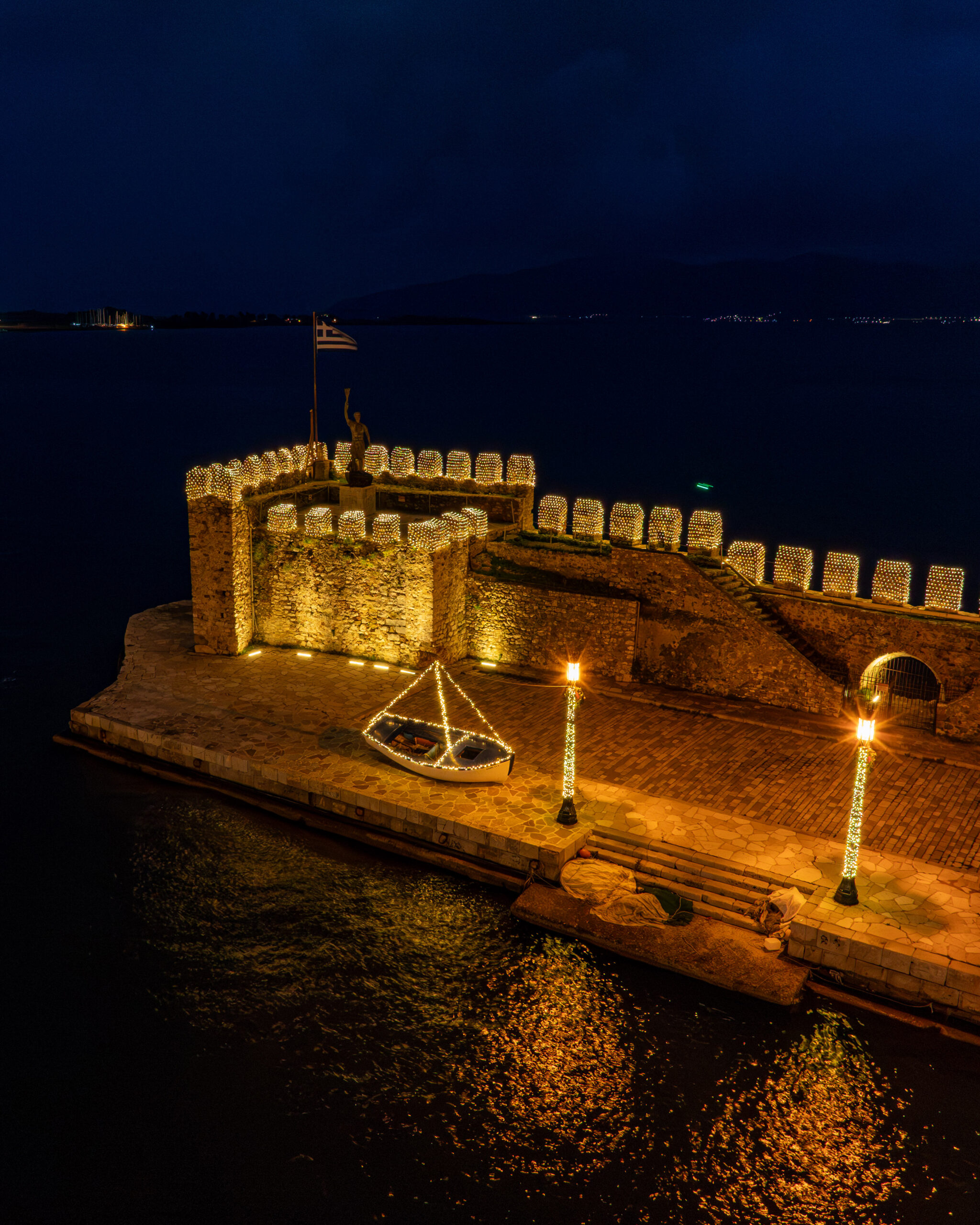 Το κάστρο, ένα από τα πιο καλοδιατηρημένα της Ελλάδας, μοιάζει να αιωρείται φωταγωγημένο πάνω από την πόλη. Στο βάθος, η Γέφυρα Ρίου-Αντιρρίου λάμπει, δημιουργώντας μια εντυπωσιακή σύνθεση μεσαιωνικής αρχιτεκτονικής και σύγχρονης μηχανικής.