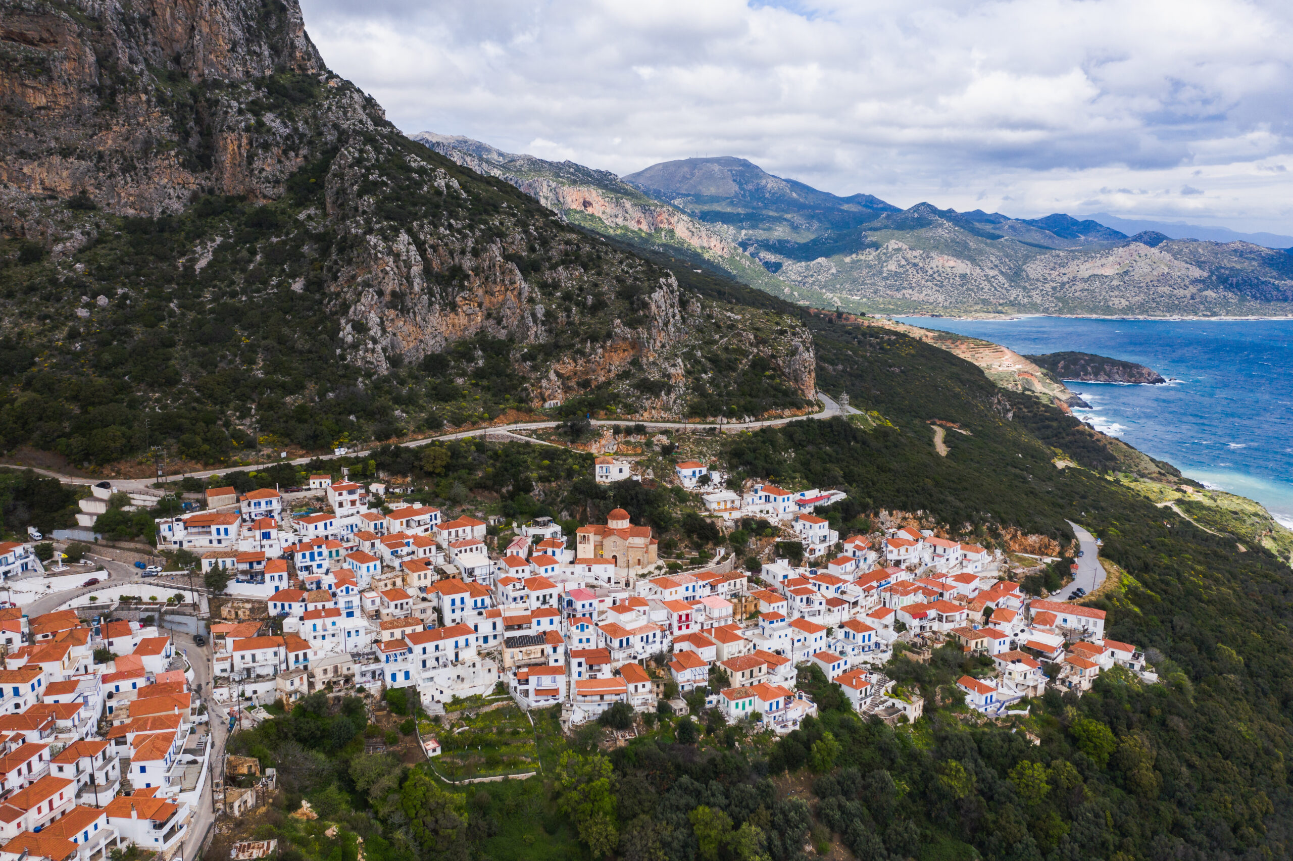 Κατεβαίνοντας, θα βρεθείτε σε έναν οικισμό που μοιάζει αιγαιοπελαγίτικος, με τους πεντακάθαρους δρόμους, τις ασπρισμένες αυλές και τα κεραμόσκεπα σπιτάκια να στήνουν το σκηνικό. Παράλληλα, οι δύο μεγάλες παραλίες που απλώνονται μπροστά στο χωριό μετατρέπουν τον τόπο σε ένα μικρό ησυχαστήριο.