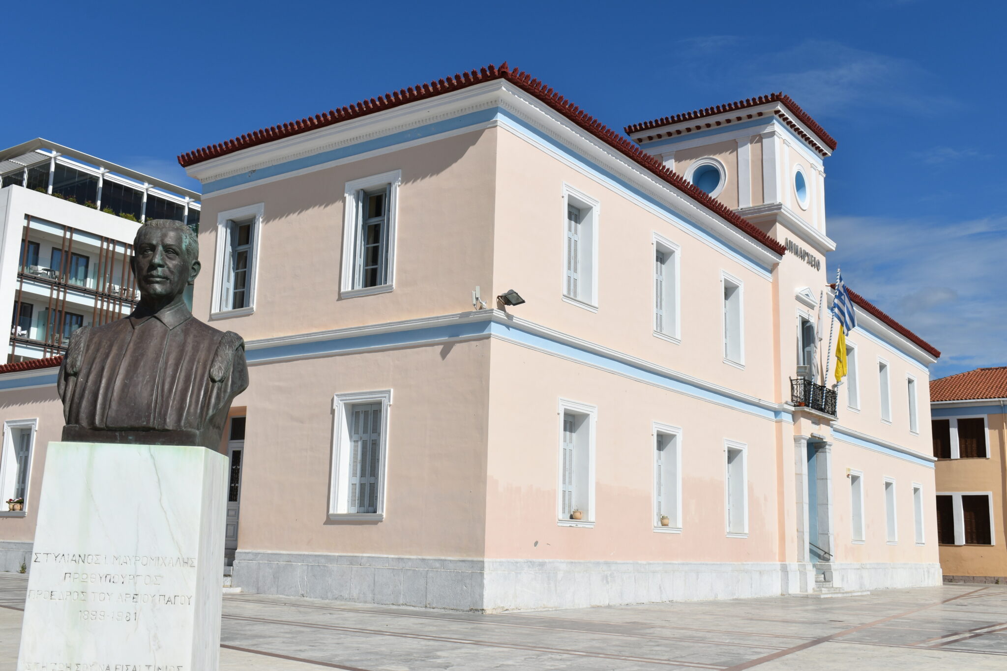 Προχωρώντας παρακάτω ξεπροβάλει όλο και περισσότερο η εικόνα του καταπράσινου λόφου του Ακούμαρου, με τα πολύχρωμα σπίτια να ατενίζουν τον Λακωνικό κόλπο. Ξεχωρίζει αμέσως η πλατεία με το κτήριο του Δημαρχείου, ένα έξοχο δείγμα νεοκλασικής αρχιτεκτονικής του τέλους του 19ου αιώνα. Το διατηρητέο πλέον μνημείο έχει σχεδιαστεί από τον σπουδαίο Βαυαρό αρχιτέκτονα Έρνεστ Τσίλλερ και αποτελεί μια κομψή κατασκευή με έναν τετράγωνο πυργίσκο να προεξέχει στην πρόσοψη και διακοσμητικά γείσα, ενώ στο παρελθόν στέγαζε τη Μέση Εμπορική Σχολή, το Πρωτοδικείο και το Νυκτερινό Γυμνάσιο.