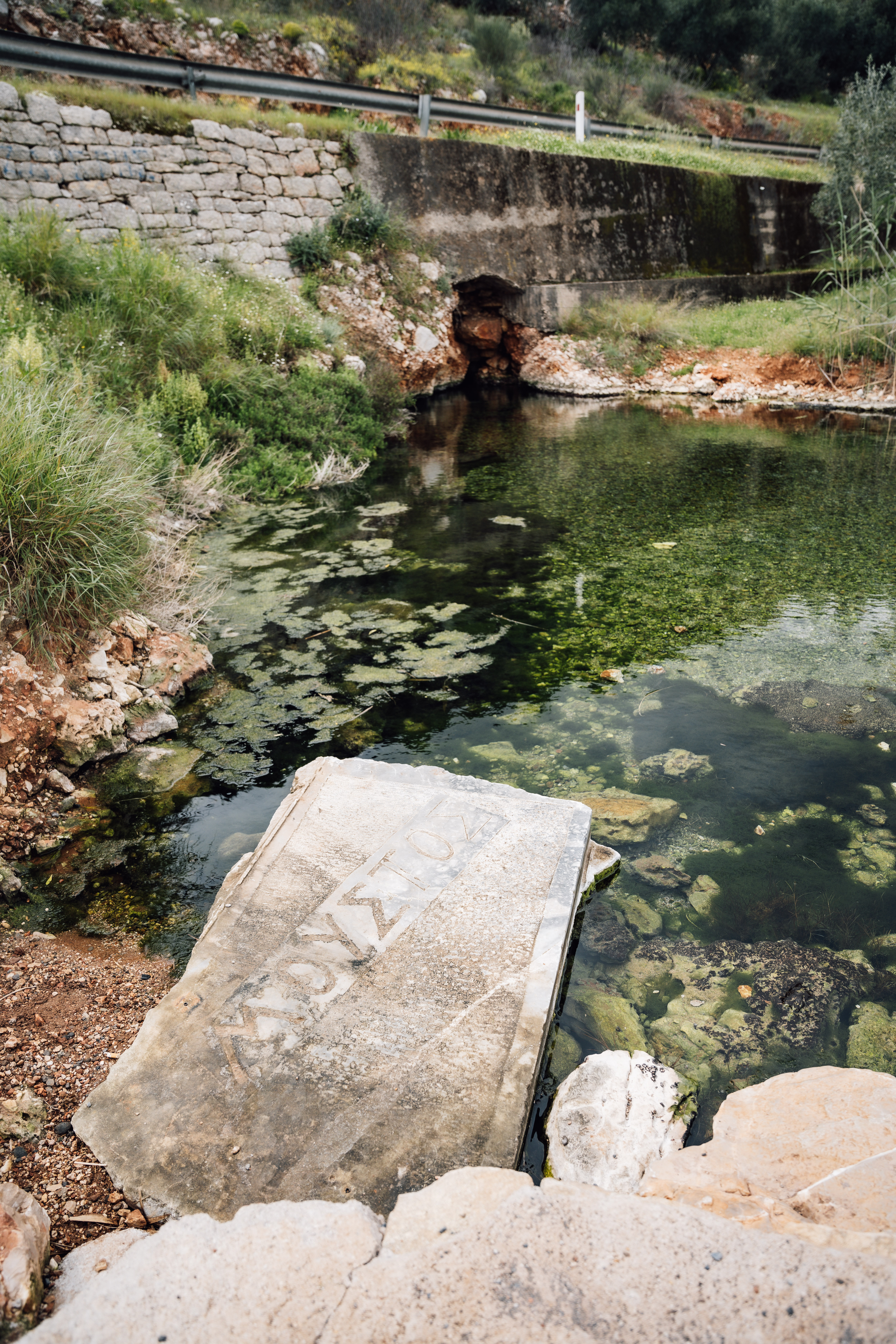 Μία ανάσα από το parking, σε ένα κατηφορικό τσιμεντένιο δρόμο, λίγων μέτρων, ακριβώς κάτω από τον ασφάλτινο δρόμο. Βλέπεις το νερό να αναβλύζει γάργαρο και, παρόλο που είναι ακόμα Μάρτιος, έχει αρκετή ζέστη και αφρικανική σκόνη που σε κάνουν να θες να βουτήξεις. Μία πινακίδα σε προειδοποιεί ότι δεν πρέπει να μπεις στο νερό χωρίς παπούτσια, μάλλον για να αποφύγεις τον κίνδυνο κάποιου τραυματισμού στα κοφτερά βράχια που περιβάλλουν το ημικύκλιο των πηγών. Και μόνο που ακουμπάω το νερό με το χέρι, καταλαβαίνω πόσο κρύο είναι.