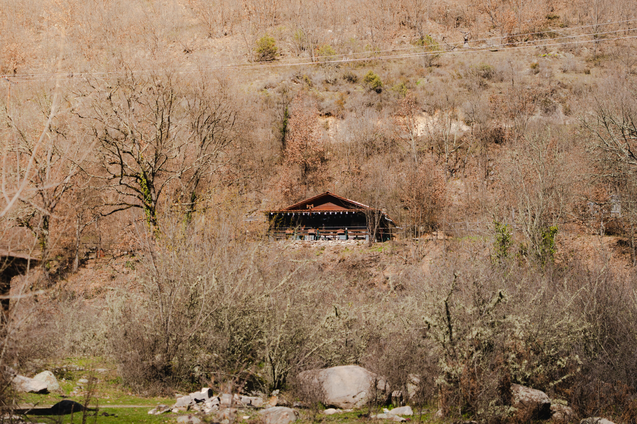 Κι εκεί που δεν το περιμένεις, βρίσκεις ένα καφενείο πλήρως εναρμονισμένο με το τοπίο, φτιαγμένο από έναν άνθρωπο που σέβεται και αγαπά το βουνό. Στο καφενείο Αρκουδόρεμα, μερικά χιλιόμετρα πιο κάτω, ο κύριος Δημήτρης με υποδέχτηκε με τον τρόπο που μόνο τα ορεινά καφενεία ξέρουν. Ένας ελληνικός καφές, λίγη κουβέντα και ιστορίες για το δάσος που βρίσκεται γύρω μας. Είναι ανοιχτό πλέον μόνο Σαββατοκύριακα και αργίες, τουλάχιστον την περίοδο που το επισκέφθηκα, αλλά αξίζει ένα τηλέφωνο τις καθημερινές, γιατί μπορεί να είστε τυχεροί και να τον πετύχετε να κάνει δουλειές. Εκεί κοντά βρίσκεται και ο καταρράκτης της Αγίας Βαρβάρας, ο πρώτος καταρράκτης της περιοχής των Διποτάμων, με ύψος περίπου 15 μέτρα. Τα νερά του σχηματίζουν μια μικρή λίμνη (βάθρα) και ο χώρος γύρω του έχει διαμορφωθεί ως σημείο αναψυχής, μια όαση το καλοκαίρι. Τη ημέρα που βρέθηκα εκεί, όμως, η γέφυρα είχε αφαιρεθεί για λόγους ασφαλείας και το ποτάμι ήταν φουσκωμένο, οπότε έμεινα στην απέναντι πλευρά, παίρνοντας μόνο εναέρια πλάνα και αφήνοντας τον καταρράκτη στην απόσταση που επέβαλαν οι συνθήκες.