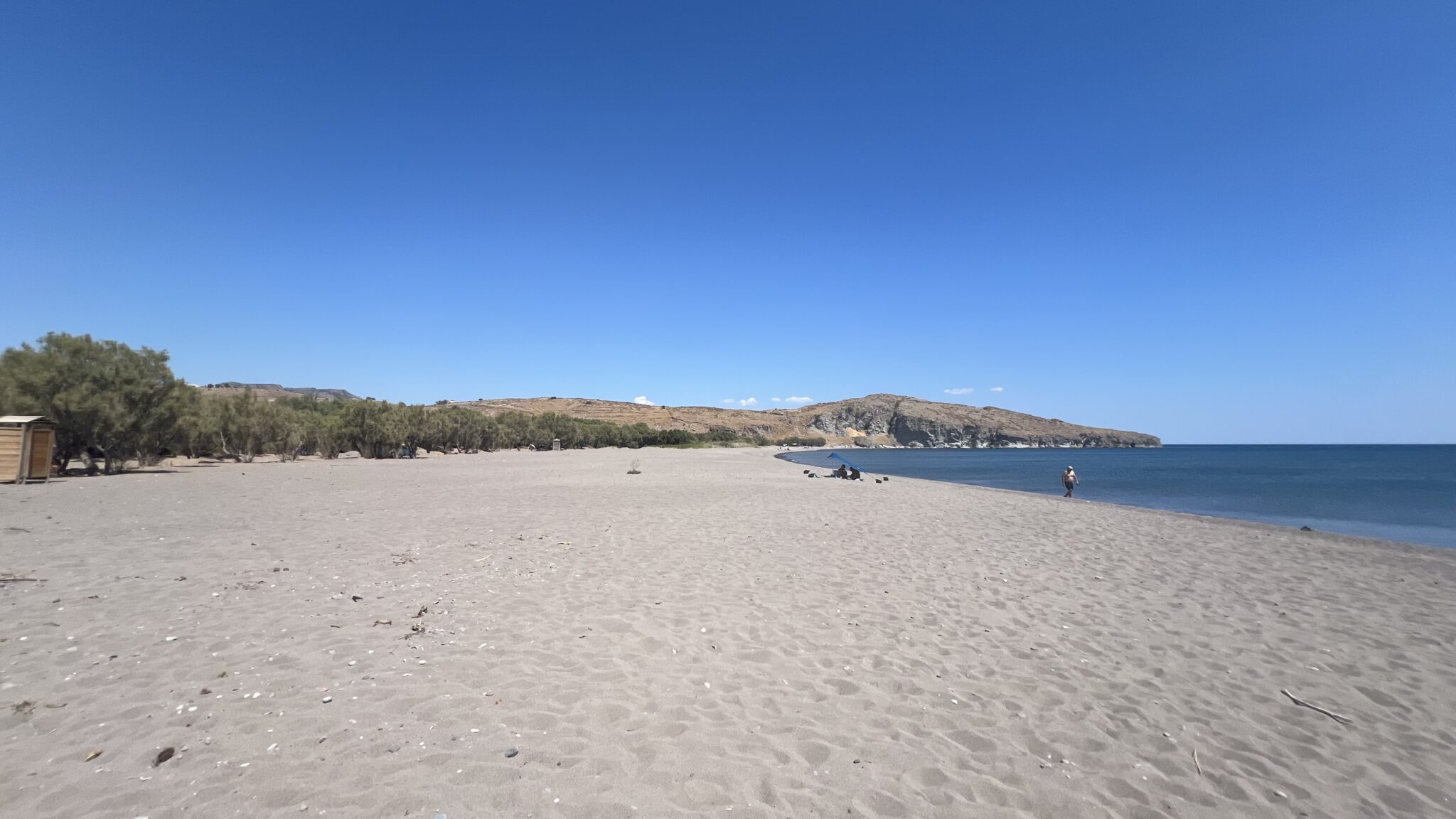 Η άμμος στον Χρούσο είναι παχιά και το καταλαβαίνει κανείς από την πρώτη στιγμή που θα την περπατήσει και θα νιώσει το πόδι του να χάνεται μέσα της. Τα νερά της θάλασσας είναι τόσο δροσερά όσο πρέπει, και βαθαίνουν με φυσιολογικό ρυθμό. Είναι επίσης σκουρόχρωμα, όπως σε πολλά σημεία της Λέσβου, πιθανότατα λόγω της σκούρας άμμου. Μην σας ξεγελά το χρώμα τους· είναι πεντακάθαρα. Ωστόσο, αυτό που ξεχωρίσαμε στον Χρούσο είναι το φως, ο τρόπος που ο ήλιος πέφτει πάνω στην παραλία. Σε συνδυασμό με τον κάμπο και τα πολλά αρμυρίκια (όπου συχνά καταφεύγουν και κατασκηνωτές), δημιουργείται μια εξωτική αίσθηση. Όχι «Καραϊβικής», όπως συχνά λέγεται για άλλες «εξωτικές» ελληνικές παραλίες, αλλά μάλλον σαν να βρίσκεσαι σε όαση, σε κάποια χώρα της ερήμου. Μόνο που εδώ, η όαση είναι παραθαλάσσια.