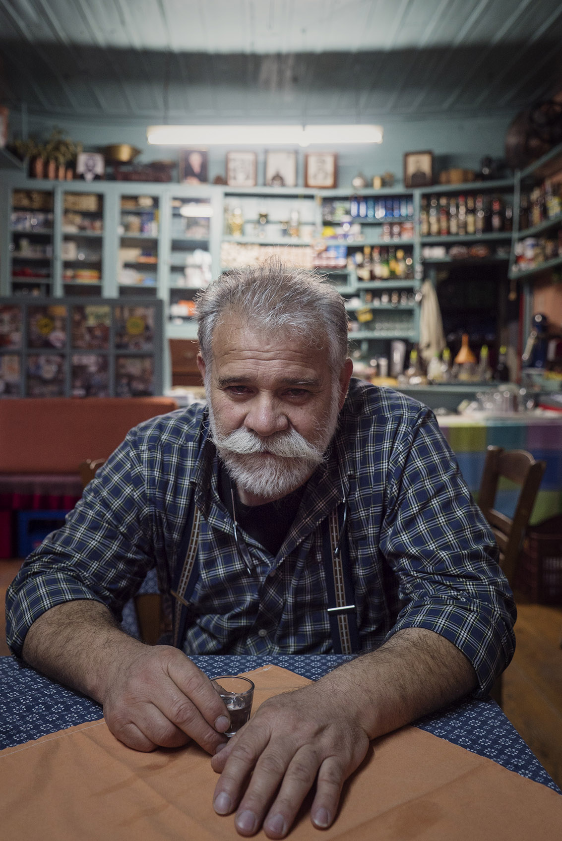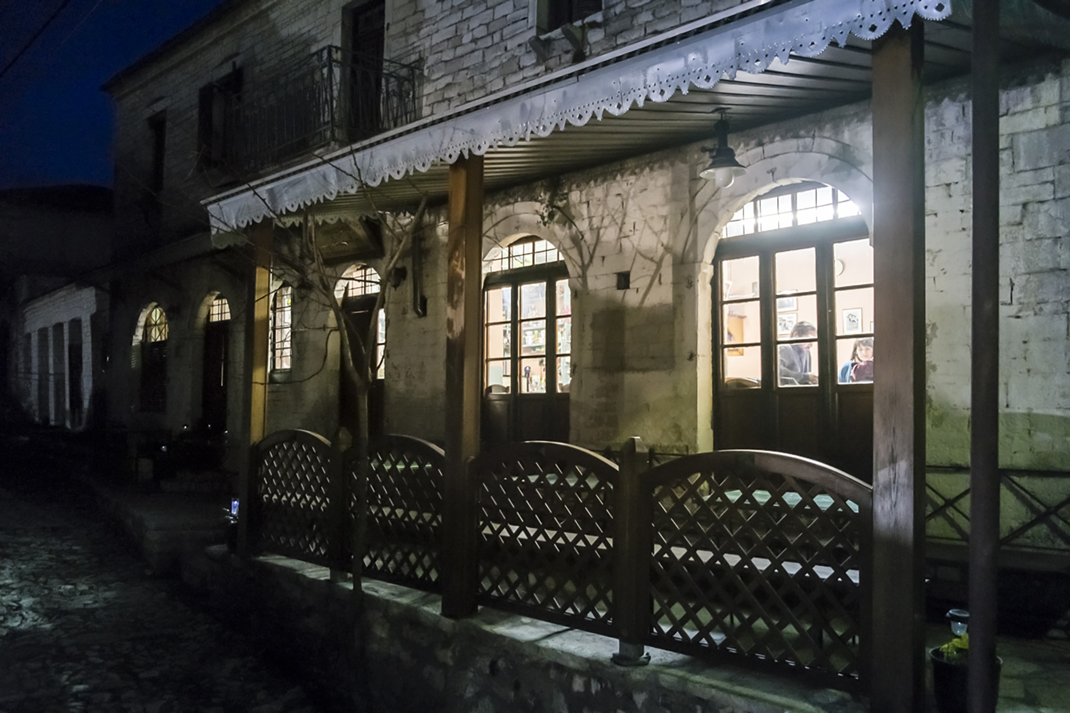 Εντός του χώρου, ο χρόνος μοιάζει να έχει σταματήσει μερικές δεκαετίες πριν. Πρωταγωνιστούν παλιά αλλά κομψά ράφια και λιγοστά είδη μπακαλικής, μικρά τραπεζάκια και καρέκλες. Όλα μοιάζουν στριμωγμένα και ταυτόχρονα τίποτα δεν περισσεύει. Το καφενείο-ταβέρνα είναι από εκείνα τα μέρη που δημιουργούν οικειότητα στον επισκέπτη χωρίς να χρειαστεί να το προσπαθήσουν. Eνώ μια πόρτα μέσα απ’ την κουζίνα μας οδηγεί στην «Μπίμσα», έναν χώρο μικροσκοπικό, θολοσκέπαστο, με εξαίρετη τοιχοποιία και ωραία χρώματα για όσους θέλουν να απομονωθούν.