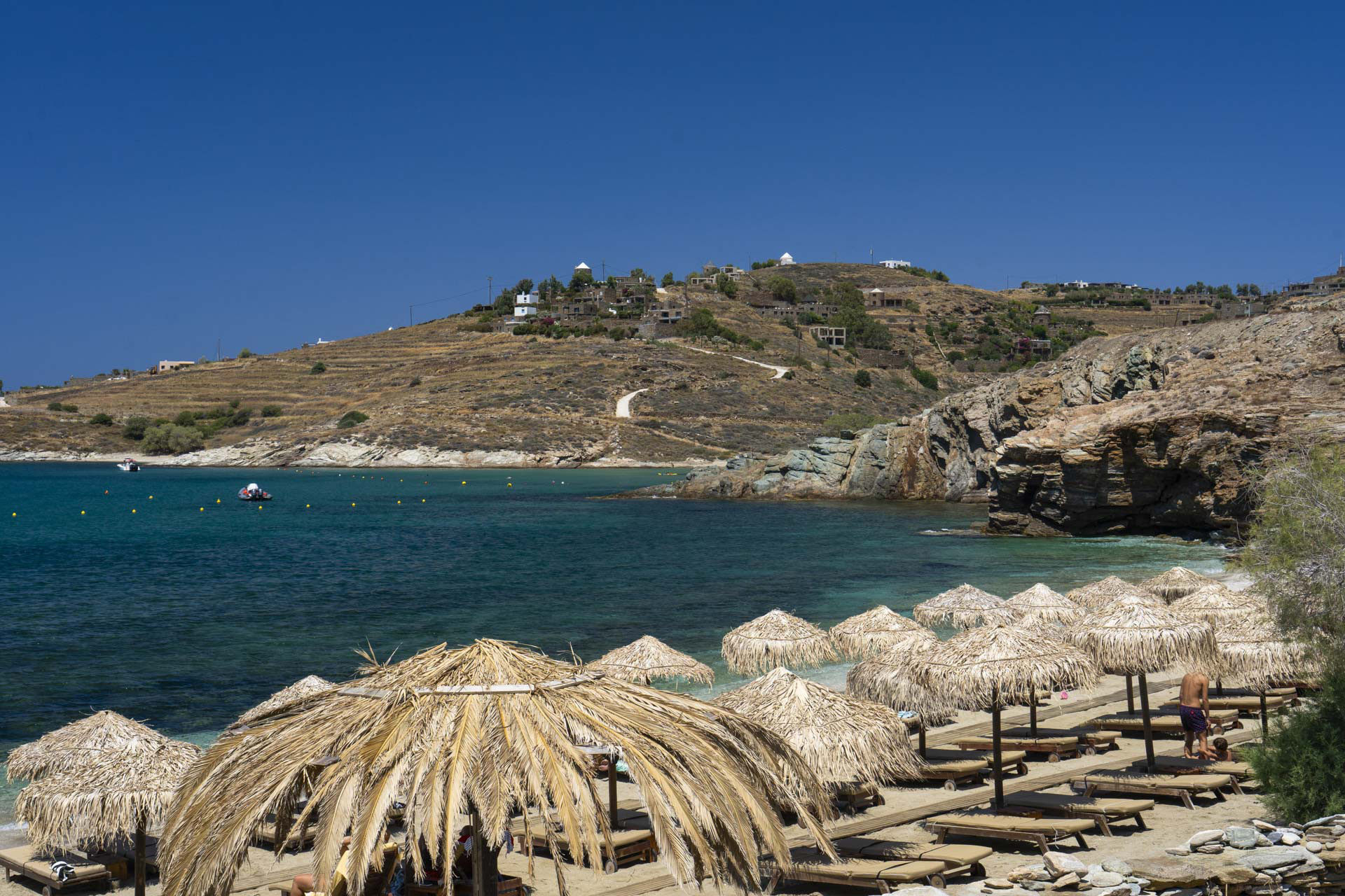 Κύριος πόλος έλξης των παραθεριστών, βέβαια, είναι τα υπέροχα πρασινογάλαζα νερά του Κούνδουρου, που βαθαίνουν σταδιακά και δημιουργούν μια γοητευτική σύνθεση έτσι όπως συνδυάζονται με τις «χρυσαφένιες» λωρίδες της άμμου και με τη γενικότερη αίσθηση ότι κολυμπάς κάτω από τα φτερά των πετρόχτιστων, παραδοσιακών ανεμόμυλων των Κυκλάδων. Επιπλέον, το βραχώδες του γύρω τοπίου δημιουργεί και πολύ ωραίο βυθό, ο οποίος προσφέρεται για εξερεύνηση από τους φίλους των καταδύσεων και του snorkeling. Αν αγαπάτε λοιπόν τα υποθαλάσσια τοπία, φροντίστε να έρθετε φέρνοντας μάσκα και αναπνευστήρα.