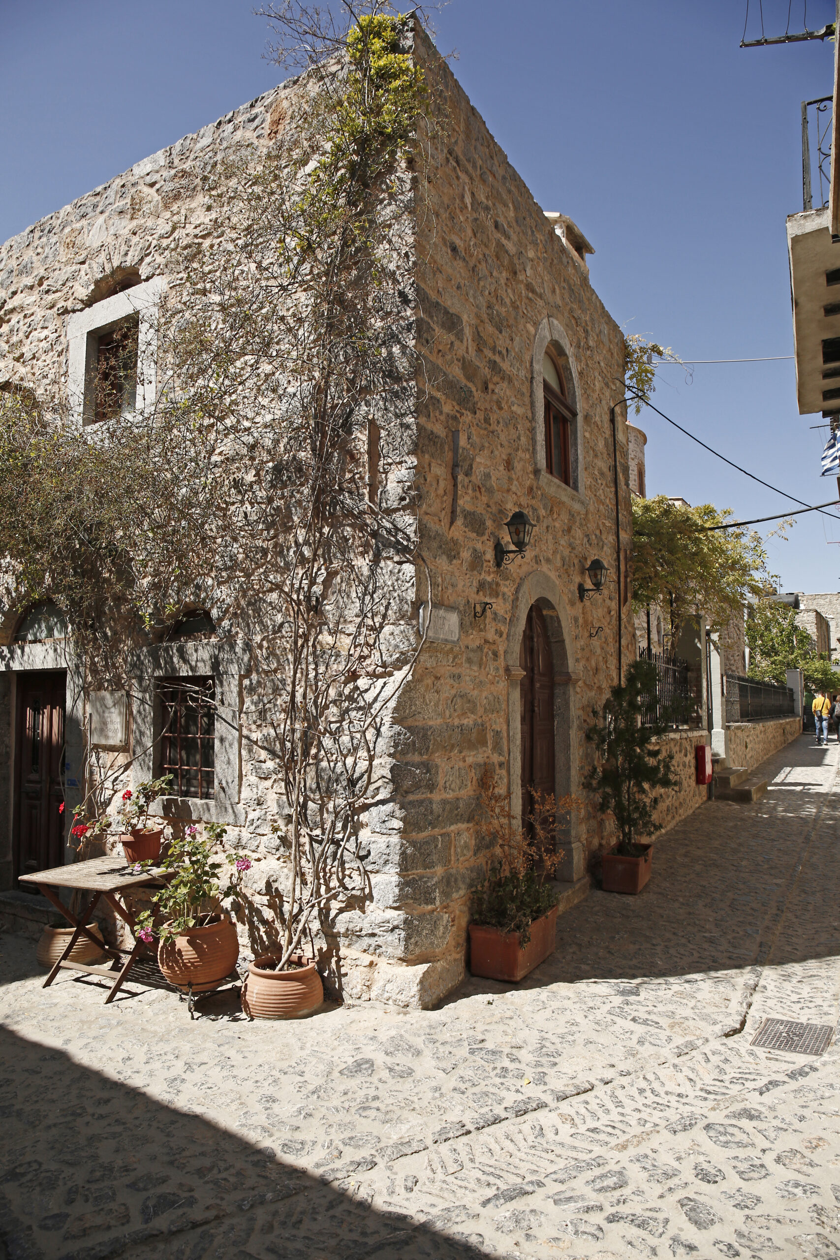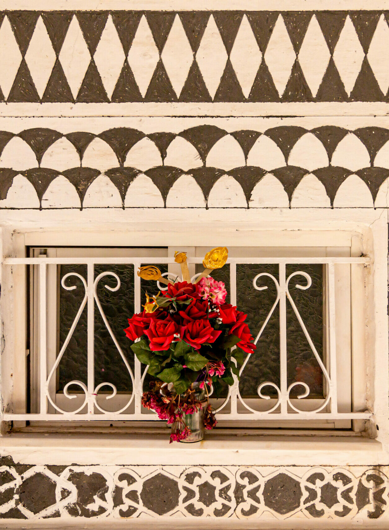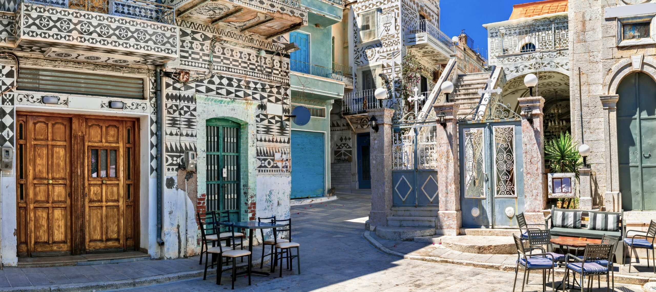 Η αρχιτεκτονική τεχνοτροπία γνωστή στην τοπική διάλεκτο ως ξυστή, γεμίζει ασφυκτικά -ο εφιάλτης ενός ψυχαναγκαστικού- κάθε τοίχο και κάθε λευκή επιφάνεια με μαύρα επαναλαμβανόμενα μοτίβα αφήνοντας μια νότα ενός απροσδιόριστου μοντερνισμού στο μεταίχμιο Ανατολής και Δύσης.