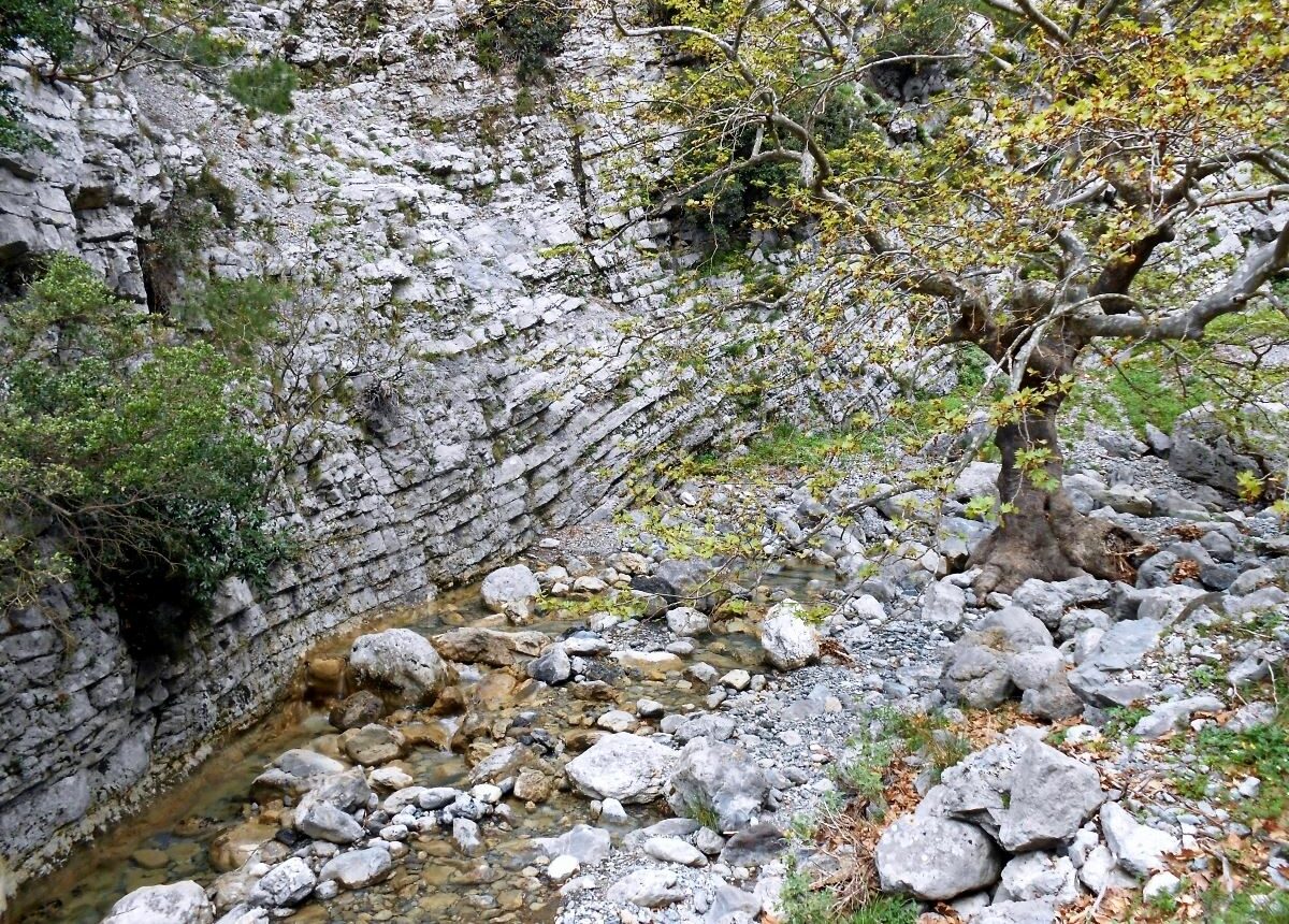 Λίγο μετά την είσοδό σας στο φαράγγι, αυτό στενεύει και τα βράχια ψηλώνουν. Τραχιά και απότομα τα πανύψηλα βράχια φιλοξενούν μερικές τούφες θάμνων και κάποια λίγα δέντρα, γενικά σε αυτό το σημείο της διαδρομής το τοπίο εντυπωσιάζει για το άγριο πέτρινο ύφος του. Δεν είναι ότι του λείπει το πράσινο, απλά τα απότομα βράχια κλέβουν την παράσταση.