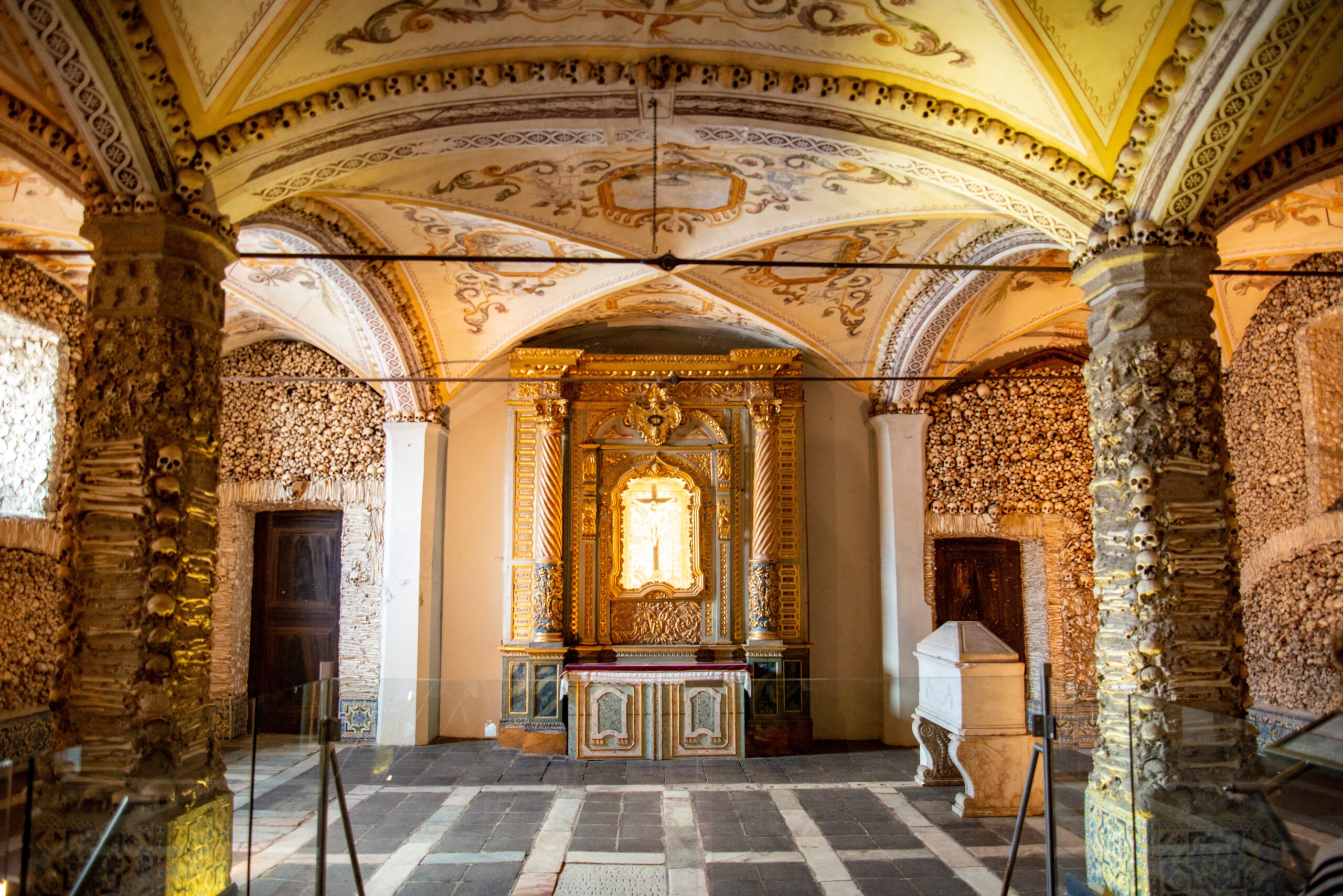 Χτίστηκε από Φραγκισκανούς μοναχούς και υπολογίζεται πως για τη διακόσμηση των τοίχων του έγινε εκταφή 5.000 σκελετών. Όλη η πόλη είναι μια ομορφιά, περπατήστε στην αγορά της και στα μαυριτανικού στυλ σοκάκια της, επισκεφθείτε το Μουσείο της Évora, που στεγάζεται σε ένα παλιό κτίριο παλατιού το οποίο χρονολογείται πίσω στον 16ο αιώνα, και απολαύστε έναν καφέ στην πλατεία Giraldo περιτριγυρισμένοι από υπέροχα κτίρια.
