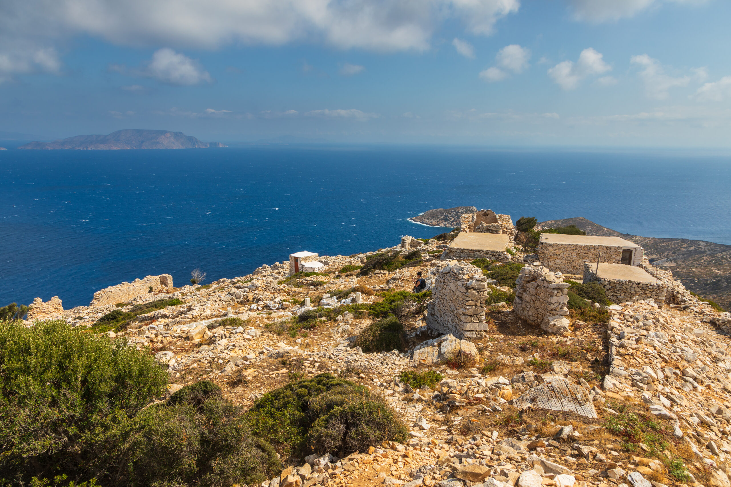 Στην ανατολική πλευρά του νησιού, μεταξύ Αγίας Θεοδότης και Ψάθης, το ύψωμα με τα ερείπια του Παλαιόκαστρου είναι από τα ωραιότερα σημεία στην Ίο για να αγναντέψετε το πέλαγος και τα γειτονικά νησιά όπως η Νάξος, η Αμοργός, η Πάρος. Θεωρείται ότι το κάστρο κτίστηκε στη θέση προϋπάρχοντος βυζαντινού από τον Ενετό Μάρκο Κρίσπο το 1397 ώστε να επιτηρεί τους θαλάσσιους δρόμους προς το Αιγαίο και την Κρήτη. Διατηρείται τμήμα των τειχών και η εκκλησία της Παλαιοκαστρίτισσας. Το περπάτημα ως εκεί στο χείλος του γκρεμού είναι μια πολύ ενδιαφέρουσα εμπειρία.