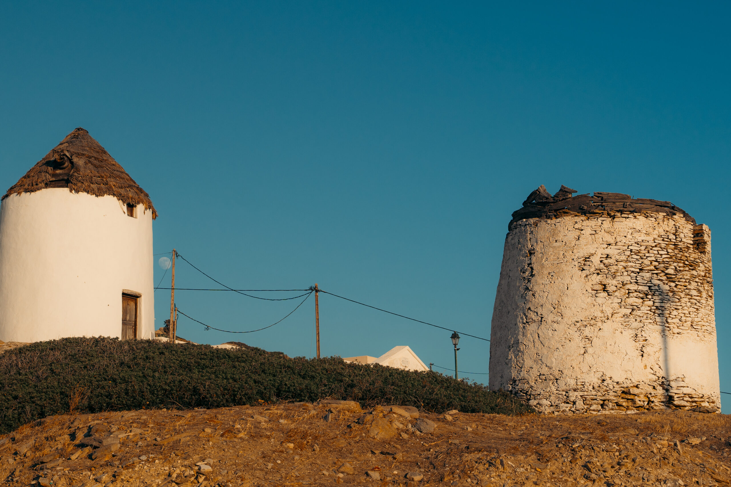 Την ώρα του ηλιοβασιλέματος οι επισκέπτες σπεύδουν στην «πλατεία της άνοιξης», ή των μύλων και δικαίως: οι 12 εναπομείναντες πυργόμυλοι, άλλοι αποκατεστημένοι ή πιο συντηρημένοι και άλλοι λιγότερο, αποτελούν ένα πολύ ωραίο φόντο για φωτογραφίες και βίντεο. Από το σημείο αυτό η θέα προς τον λόφο της Χώρας και όλη τη γύρω περιοχή είναι εντυπωσιακή. Οι μύλοι ήταν σε λειτουργία μέχρι το 1960. Με κινητήρια δύναμη τον αέρα, οι φτερωτές και τα πανιά κινούσαν μέσω αξόνων και τροχών τις μεγάλες μυλόπετρες που συνέθλιβαν σιτάρι, κριθάρι, καλαμπόκι για να τροφοδοτήσουν με αλεύρι τους κατοίκους του νησιού και άλλων γειτονικών.
