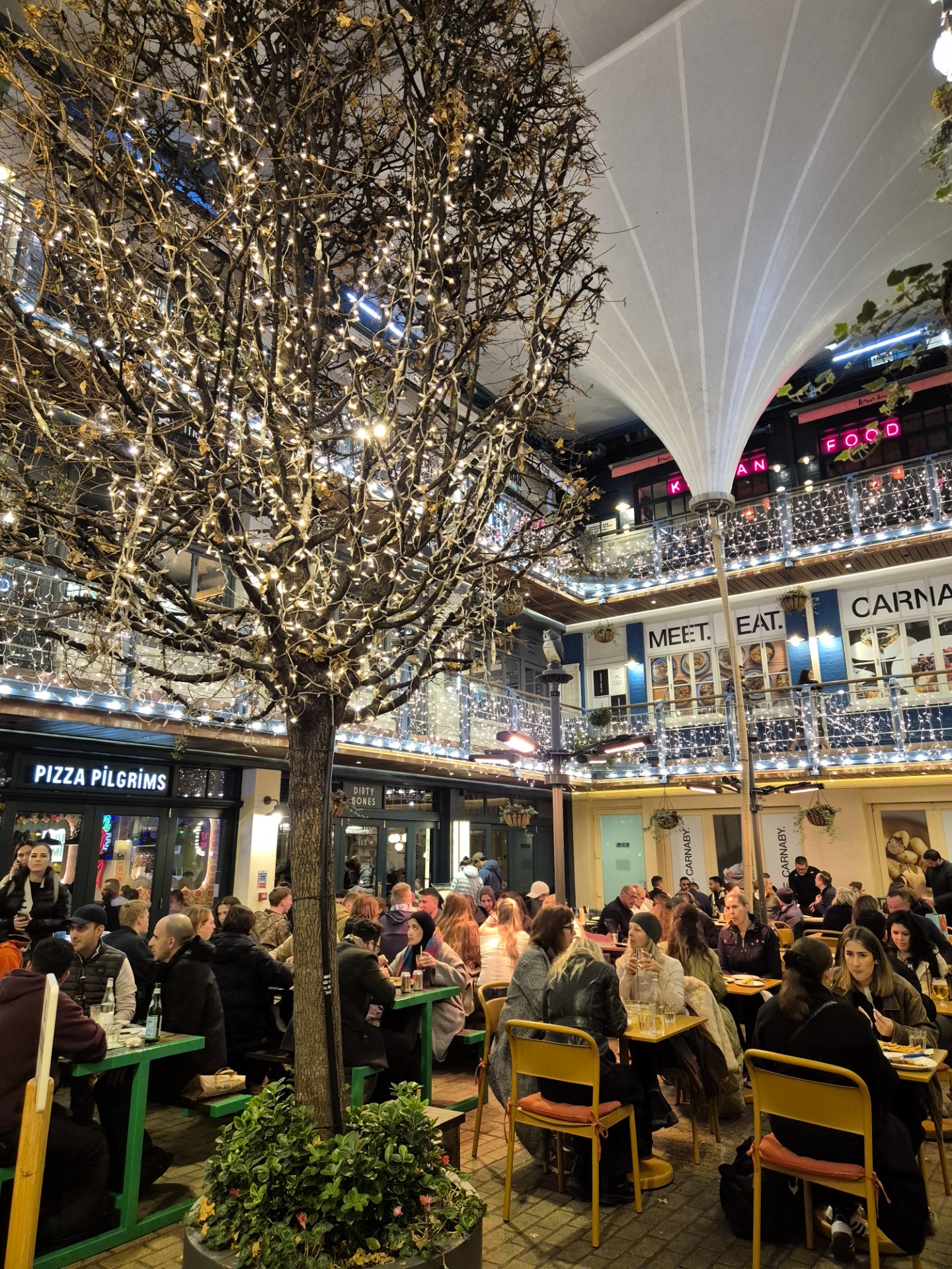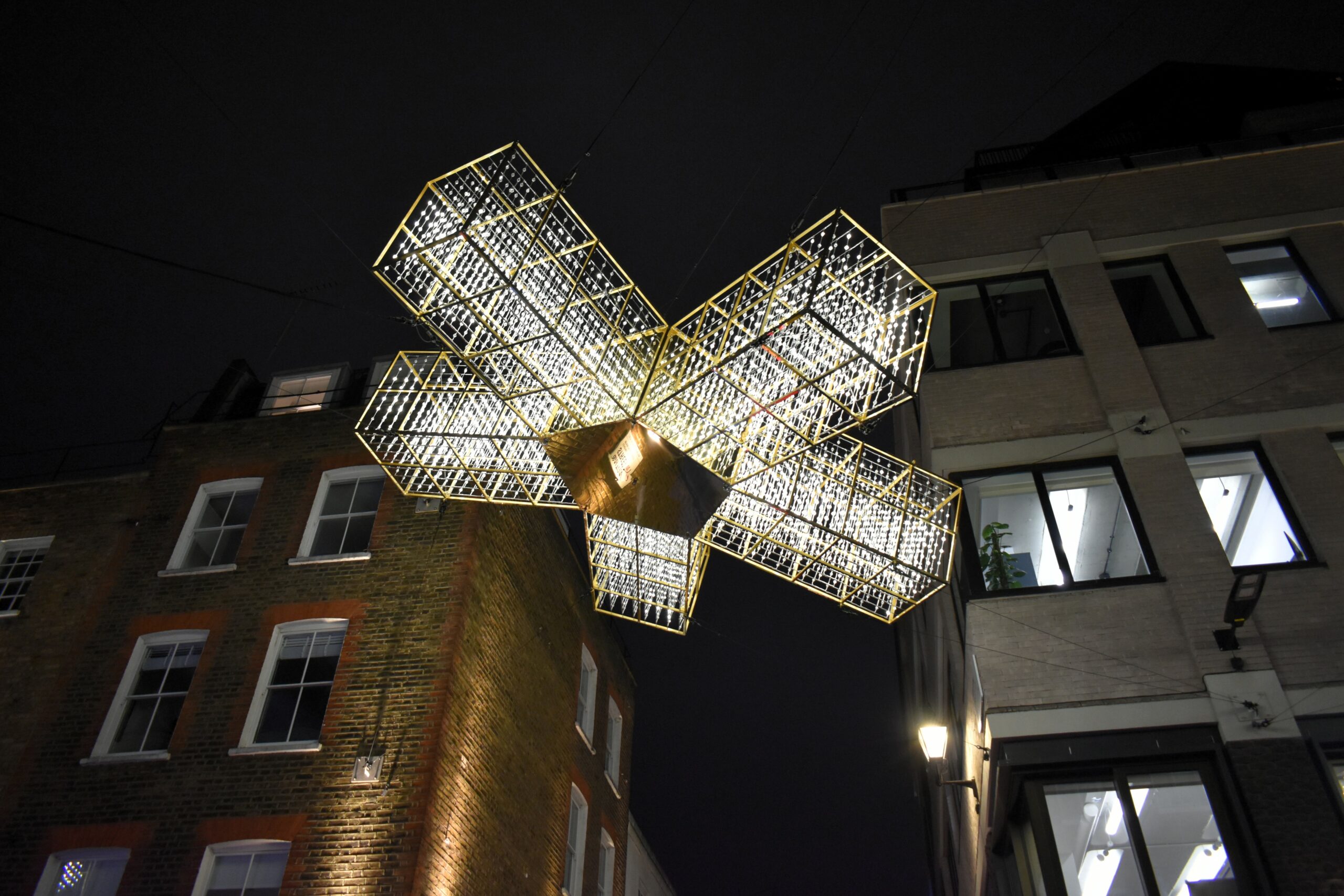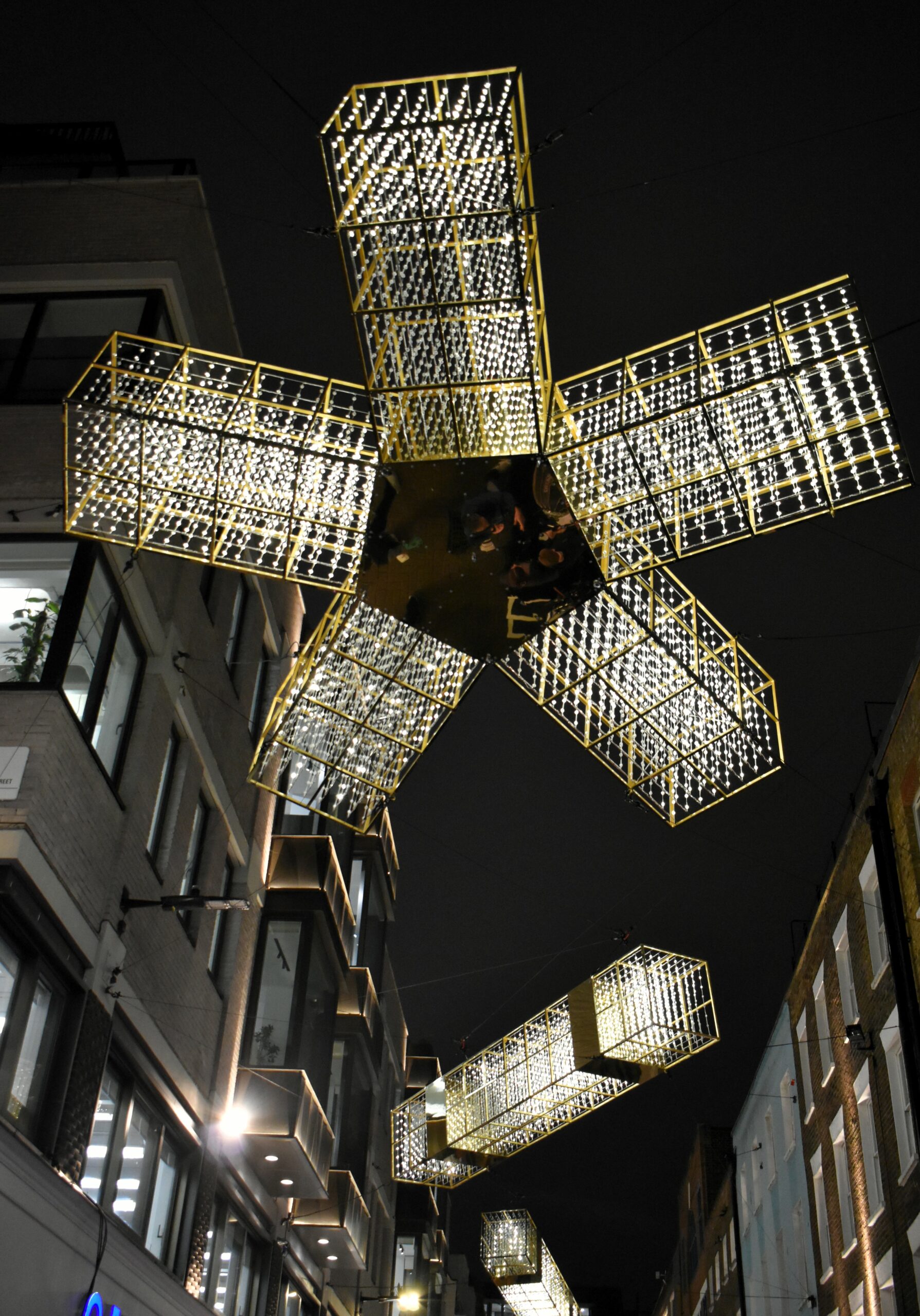 Άλλοι βρήκαν την ευκαιρία να συνδυάσουν τον περίπατο κατά μήκος της γεμάτης λάμψης πλέον από τους φτερωτούς της φύλακες Regent St, με τις πρώτες γιορτινές αγορές στα καλαίσθητά καταστήματά της, απαθανατίζοντας συνέχεια σε φωτογραφίες και βίντεο το χρυσαφένιο ανοιγόκλειμα των τεράστιων, 17 μέτρων φτερών, που καλύπτει όλο το μήκος του δρόμου. Και δεν υπήρχε κατάστημα που να μη μετέχει στο γιορτινό κλίμα, αποκαλύπτοντας χριστουγεννιάτικες βιτρίνες, προσφέροντας κεράσματα, δωράκια και ειδικές προσφορές σε αγοραστές και περαστικούς. Οι υπόλοιποι δε, που θέλαμε ακόμη περισσότερη μαγεία και μια νεωτεριστική πινελιά που θα ολοκλήρωνε –ή μάλλον όπως αποδείχθηκε, θα απογείωνε τη βραδιά- στρίψαμε στην πάντα καινοτόμα Carnaby Street.