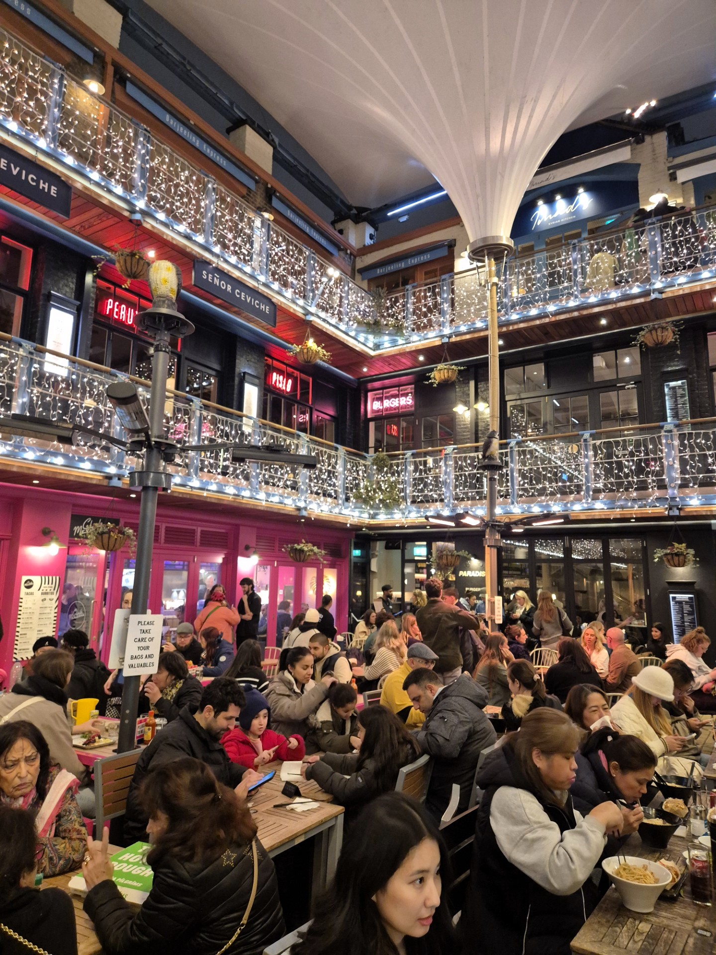Από το σημείο αυτό, το πλήθος διαχωρίστηκε. Μια μεγάλη μερίδα κόσμου κατευθύνθηκε στην περιοχή μεταξύ Leicester Square και Covent Garden, καθώς εχθές συνέπεφτε και ο σχετικά νέος θεσμός του χριστουγεννιάτικου φωτισμού κάποιων από τους πλέον πολυσύχναστους δρόμους της περιοχής: η ιστορική και γεμάτη θέατρα St Martin’s Lane και οι μικρότερες οδοί Coventry, Cranbourn, Irving και Bear Street απέκτησαν τη δική τους δόση χριστουγεννιάτικης λάμψης, με ατέλειωτες σειρές φώτων που σχημάτιζαν τα ονόματα των δρόμων, εισιτήρια θεάτρου και θεατρικές μάσκες, υπογραμμίζοντας το διαχρονικό ρόλο του West End ως επίκεντρο των λονδρέζικων θεατρικών σκηνών.