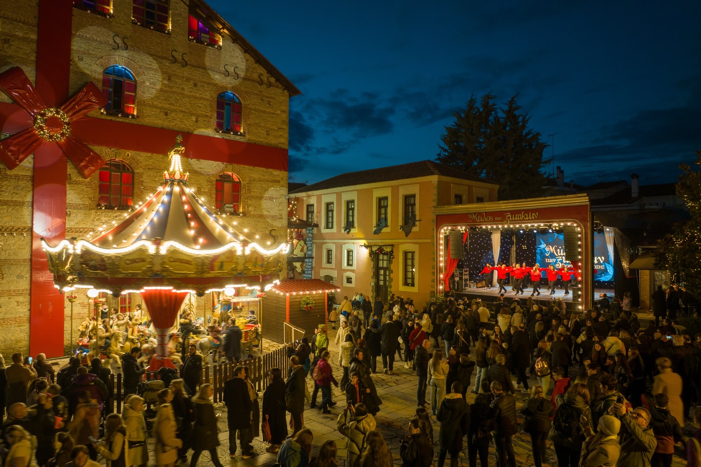 Γύρω από τις βασικές δράσεις, μικρές υπαίθριες αγορές με στολισμένα περίπτερα συμπληρώνουν την εμπειρία, προσφέροντας γλυκίσματα, ζεστά ροφήματα, τοπικά προϊόντα και χειροποίητες χριστουγεννιάτικες δημιουργίες. Η αισθητική τους, πάλι, δένει αρμονικά με το σύνολο: ξύλο, κόκκινο, πράσινο, ζεστό φως και χαρούμενη μουσική που πλημμυρίζει τον χώρο.