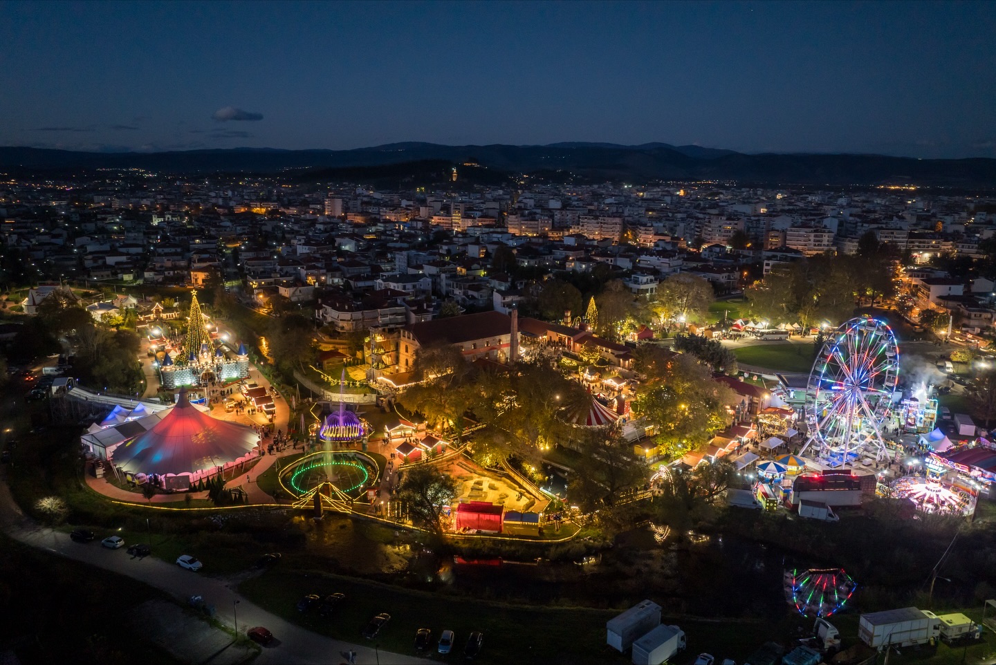 Το επίκεντρο, φυσικά, είναι το επιβλητικό χριστουγεννιάτικο δέντρο που δεσπόζει σε μία από τις κεντρικές πλατείες. Στολισμένο με εκατοντάδες λαμπιόνια, στολίδια και λαμπερές φιγούρες, συνθέτει ένα σκηνικό που θυμίζει χριστουγεννιάτικες αγορές της Κεντρικής Ευρώπης. Τις βραδινές ώρες, ο στολισμός μετατρέπεται σε ένα παιχνίδι φωτός που αντανακλάται στα νερά του Ληθαίου και χαρίζει σε ολόκληρο τον χώρο μια αίσθηση ζωντανής, γιορτινής κινητικότητας.