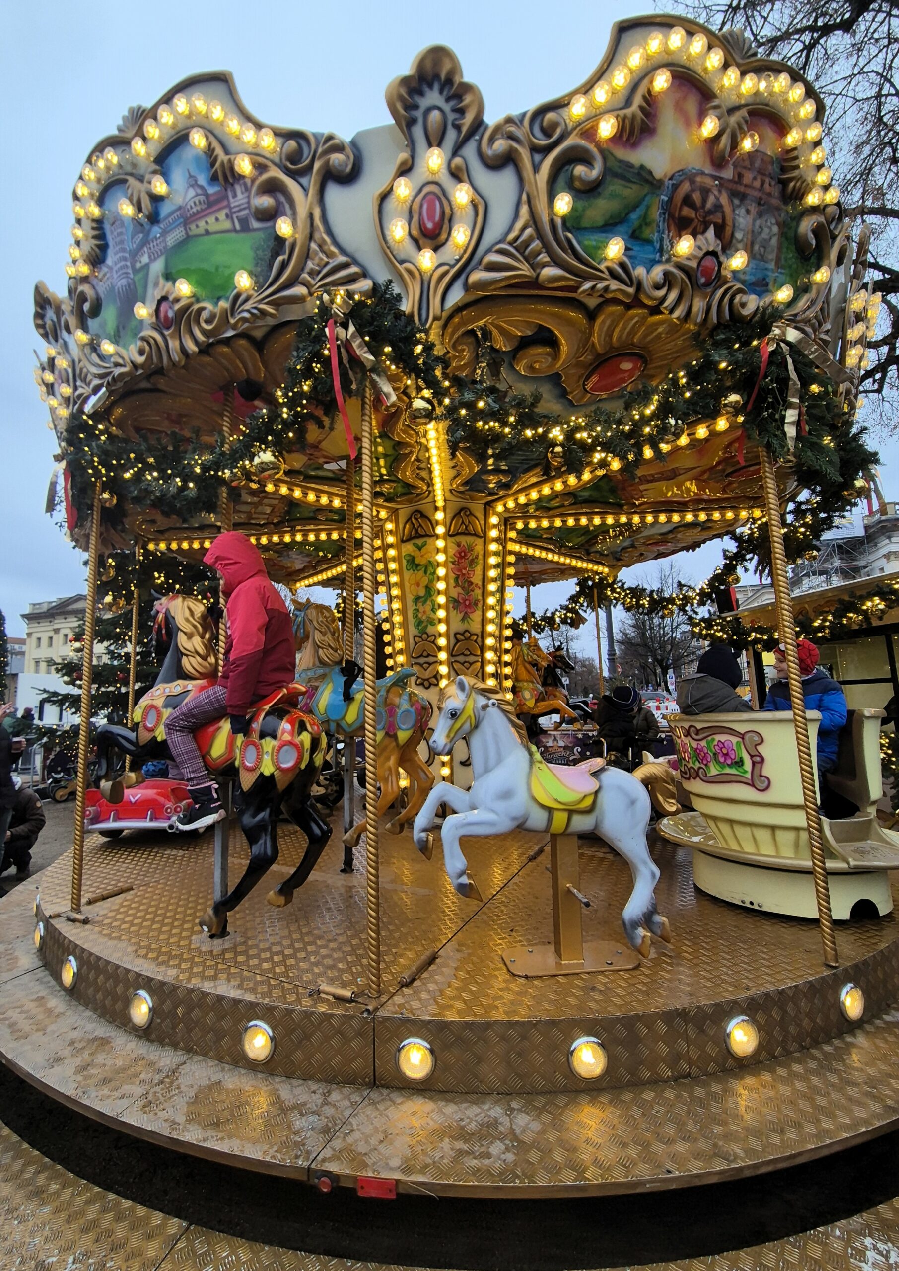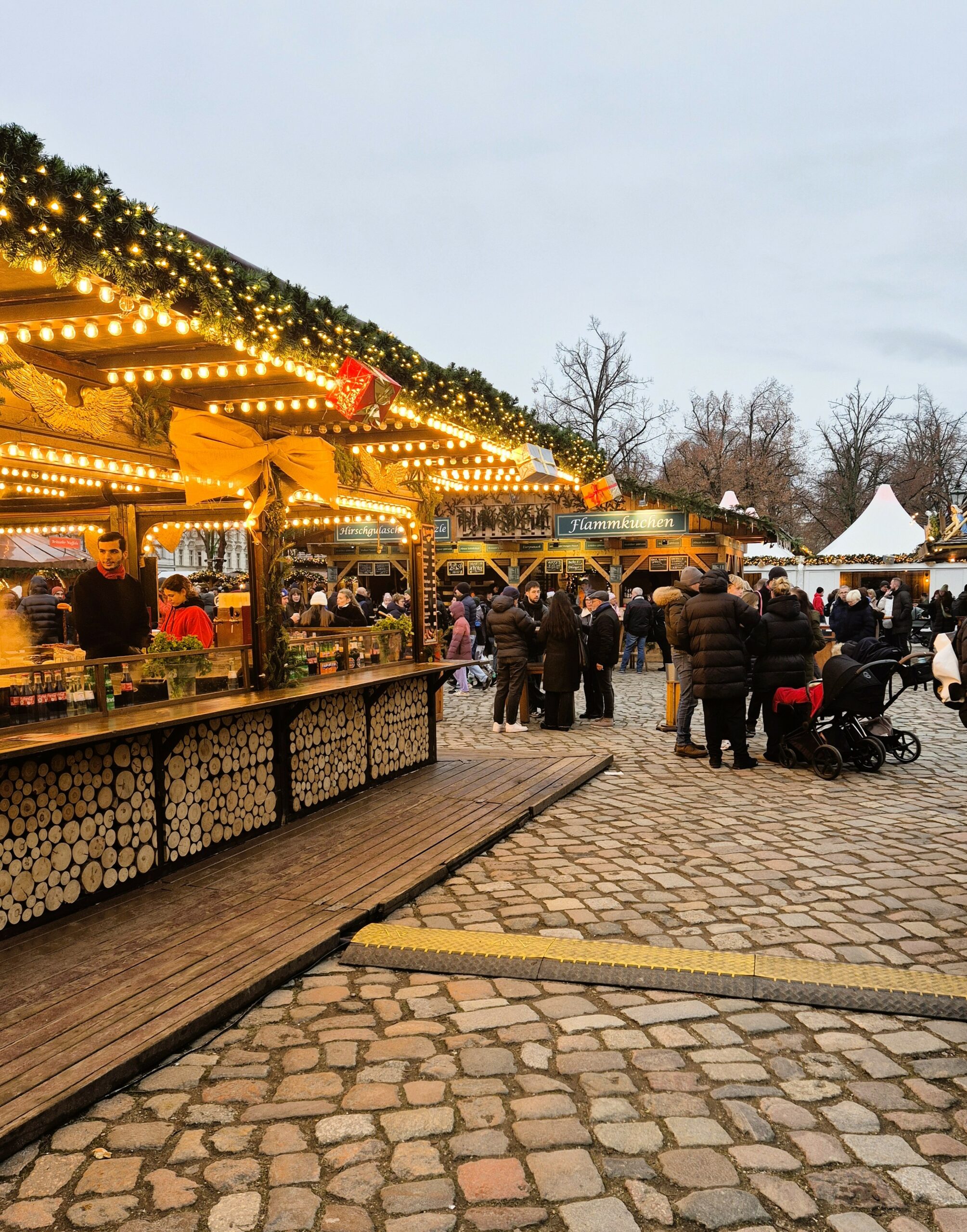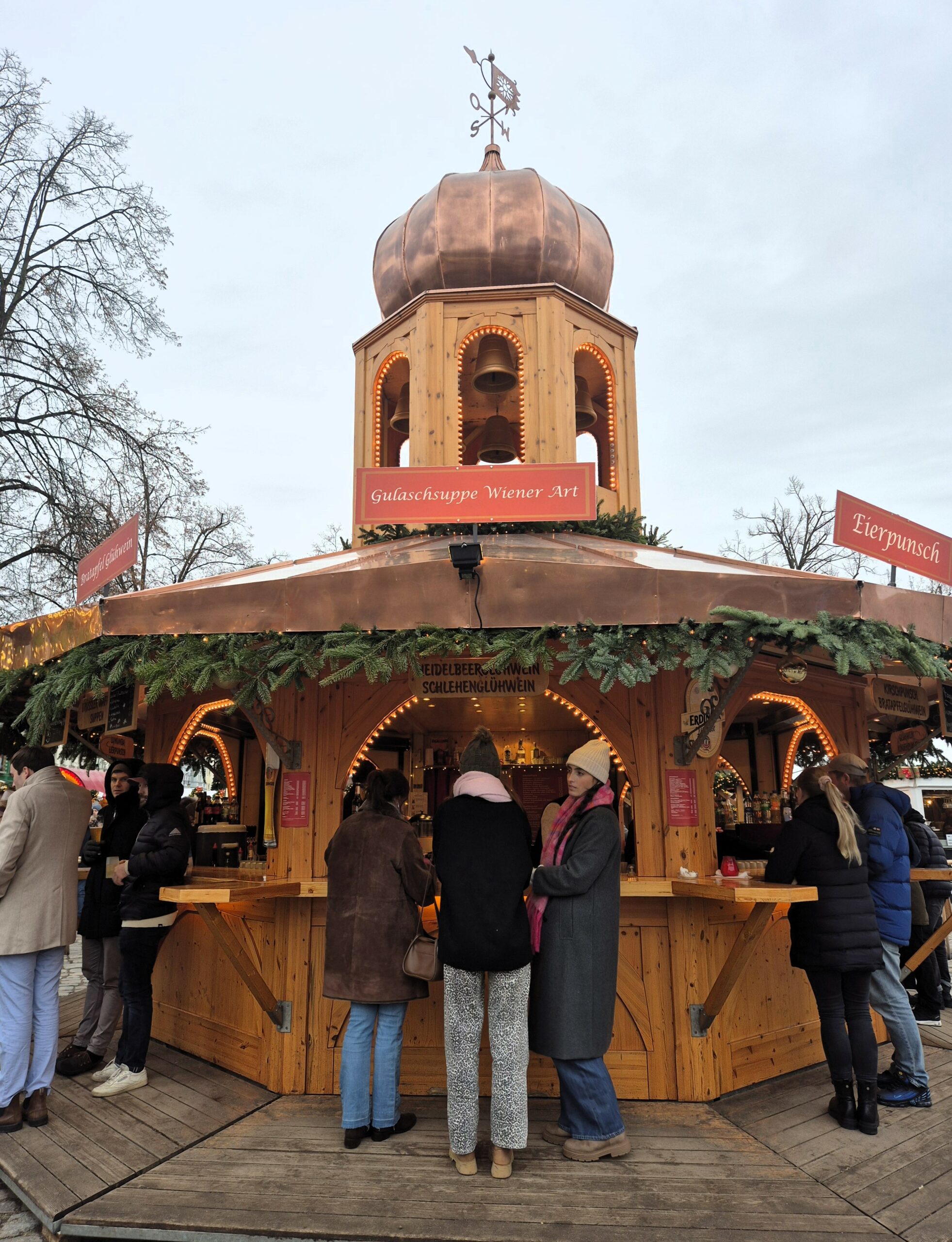 Εν μέσω της μαγευτικής ατμόσφαιρας που δημιουργούν light installations όπως γιγάντιες μπάλες μέσα στις οποίες μπορείτε να φωτογραφηθείτε, και ζωηρόχρωμοι άγγελοι-μουσικοί, αληθινοί μουσικοί διασκεδάζουν με παραδοσιακά κάλαντα και χριστουγεννιάτικα τραγούδια το πλήθος, που όταν δεν αναζητά στους πάγκους ξεχωριστά στολίδια και μοναδικά δώρα, απολαμβάνει παραδοσιακά εδέσματα και τοπικές σπεσιαλιτέ από διάφορες περιοχές της Γερμανίας, από τα πανταχού παρόντα λουκάνικα ως μεγάλα φιλέτα σολομού που ψήνονται σε ανοιχτές φωτιές, πάντα συνοδευόμενα από ζεστό αρωματικό κρασί Gluwain και παραδοσιακό Eggnog.