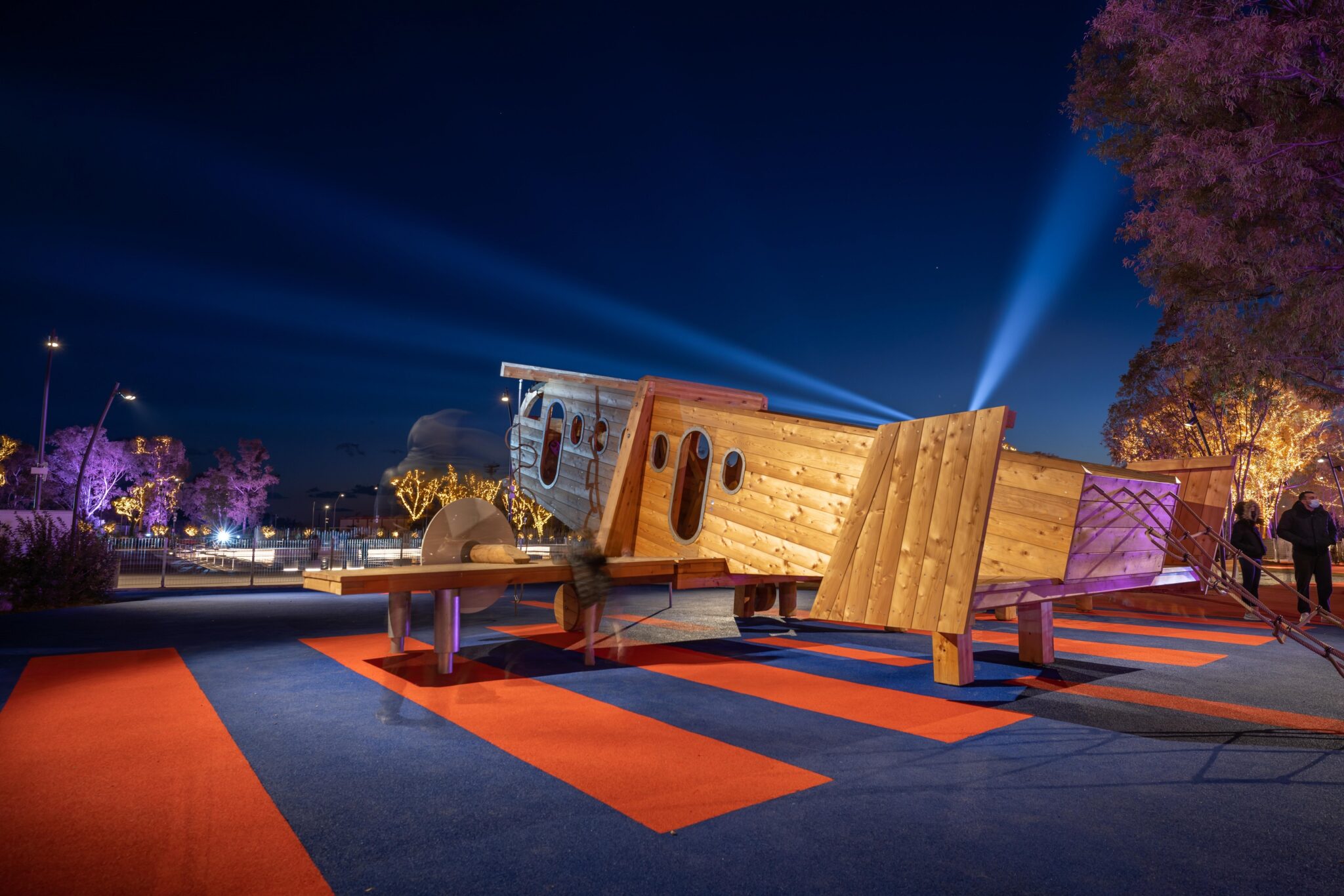 Η παιδική χαρά περιλαμβάνει συνολικά 35 ξύλινα παιχνίδια και κατασκευές που ενθαρρύνουν τα παιδιά να συνδεθούν με τη φύση και να καλλιεργήσουν τη δημιουργικότητά τους. Tα παιδιά συναντούν μοναδικά διαδραστικά παιχνίδια όπως τα τραμπολίνο, μουσικές κατασκευές και το μαγικό «τηλέφωνο», τα δενδρόσπιτα αναρρίχησης και τις κούνιες. Αφού σκαρφαλώσουν στο χρωματιστό λόφο, μπορούν να ανέβουν στον Πύργο και να ξανακατέβουν με την τσουλήθρα τούνελ. Ακόμη, μπορούν να ανακαλύψουν το παιχνίδι του νερού με την άμμο. Η περιήγησή τους συνεχίζεται στο διάδρομο απογείωσης, όπου ένα μικρό τελεφερίκ τους «απογειώνει» και τους «ταξιδεύει» μέχρι το ξύλινο αεροπλάνο. Όλα τα παιδιά μπορούν να ζήσουν διασκεδαστικές στιγμές στο Παιδικό Δάσος, καθώς περιλαμβάνει και παιχνίδια, φιλικά προς Α.Μ.Ε.Α.