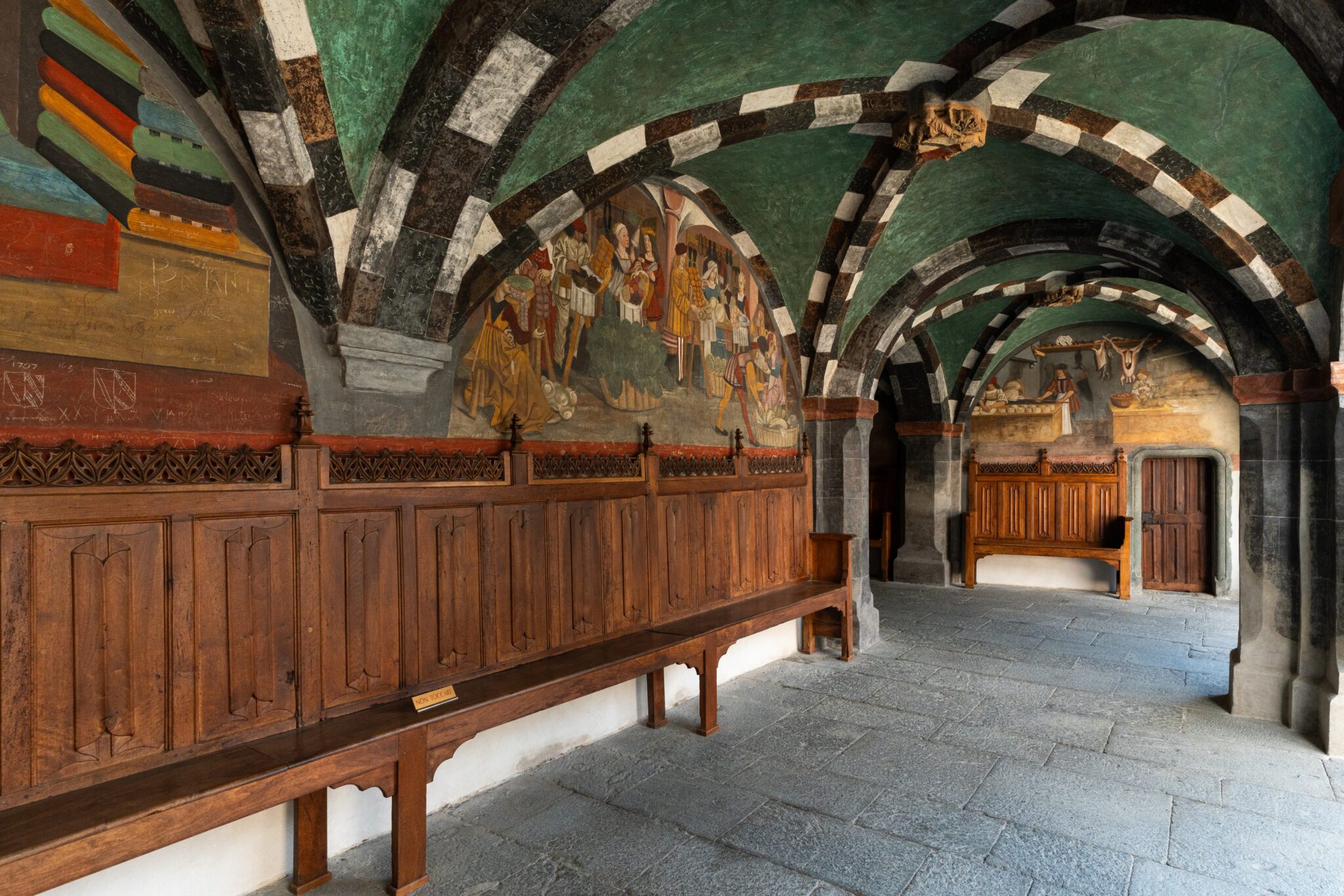 Η μεγάλη αναγεννησιακή τοιχογραφία που ακολουθεί απεικονίζει την καθημερινή ζωή στο χωριό, με τους φρουρούς, τον κρεοπώλη, τον αρτοποιό και τον μανάβη, αλλά κι ένα εργαστήριο ραπτικής, το φαρμακείο και τον παντοπώλη, μεταφέροντάς μας στο επίκεντρο της ζωής πέντε αιώνες πριν. Στα πλούσια διακοσμημένα διαμερίσματα, από την τραπεζαρία ως την κουζίνα, εκτίθενται μερικά από τα αυθεντικά έπιπλα και αντικείμενα οικιακής χρήσης: ένα λιοντάρι και ένας γρύπας στο πέτρινο τζάκι της αίθουσας του Βαρώνου, ζωγραφισμένα ξύλινα δοκάρια στην οροφή, τοιχογραφίες που απεικονίζουν τοπία και σκηνές κυνηγιού.