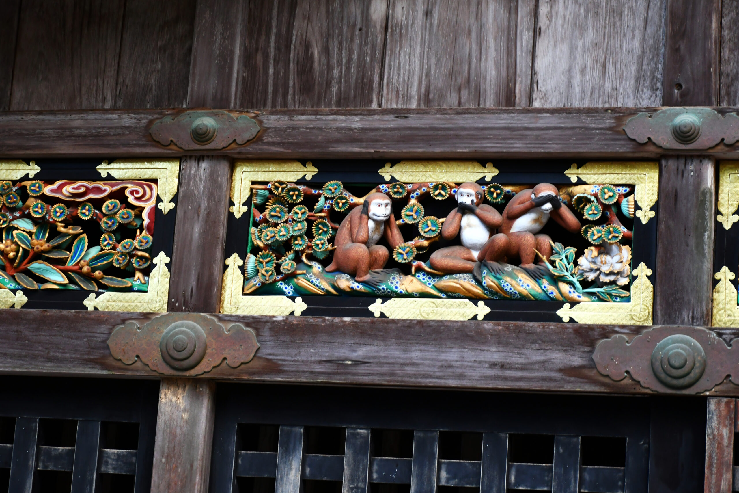 Στον στάβλο των Ιερών Αλόγων εντυπωσιάζει το ανάγλυφο των τριών σοφών πιθήκων που «δεν βλέπουν, δεν ακούν και δεν λένε τίποτα κακό», μια ρήση που παραπέμπει στην ηθική φιλοσοφία του σογκουνάτου. Το μικρό, διάσημο γλυπτό Nemuri Neko, η «Κοιμισμένη Γάτα», θεωρείται σύμβολο ειρήνης και ηρεμίας. Η πύλη Κάραμον, διακοσμημένη σε κινέζικο στυλ, οδηγεί στην αίθουσα προσευχής και στην κύρια αίθουσα του Τοσόγκου. Στο εσωτερικό των περισσότερων κτηρίων δεν επιτρέπεται η φωτογράφηση.