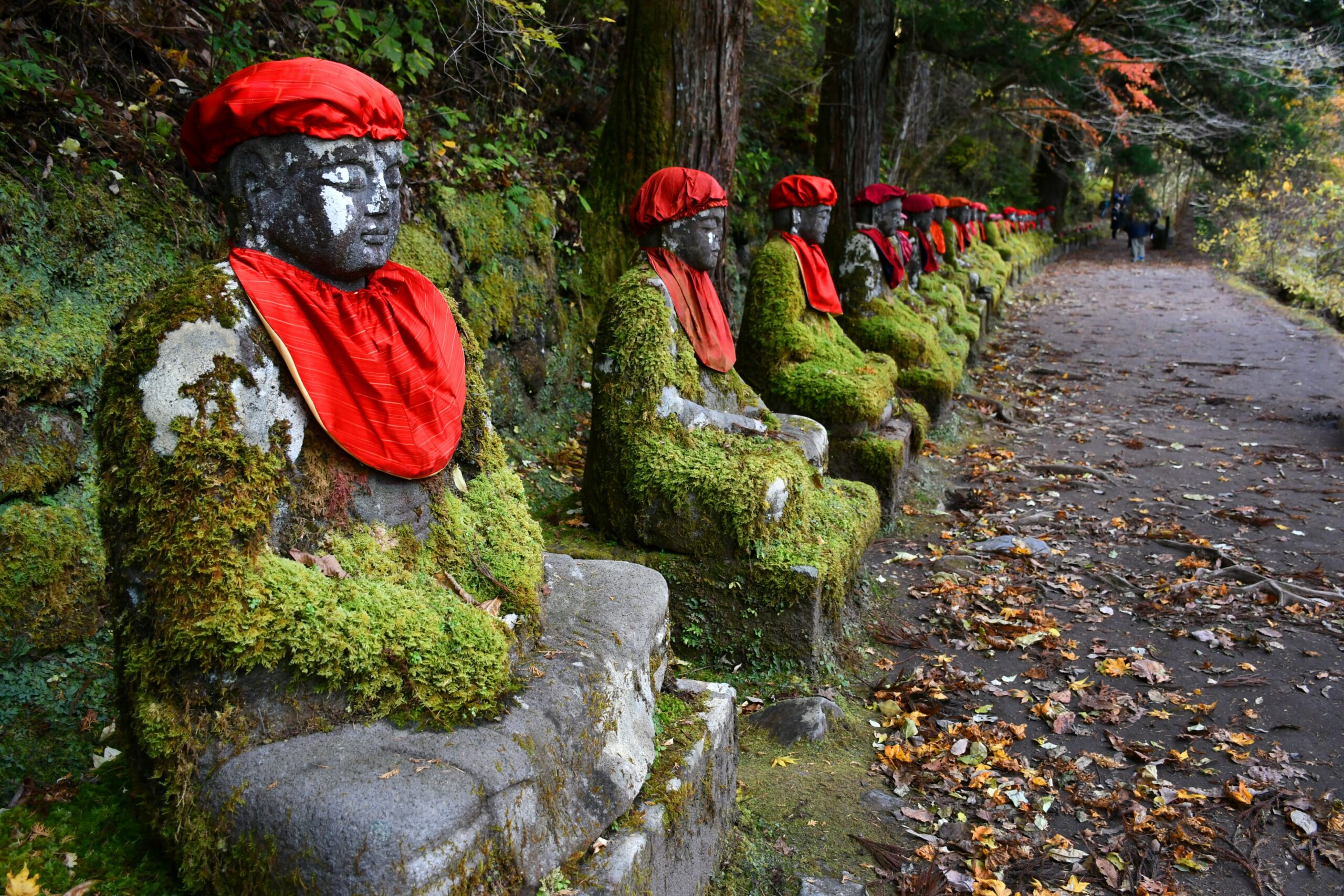 Βράχοι, βρύα, νερό έσμιγαν σιωπηλά κάτω από τον καταπράσινο θόλο. Το φαράγγι Kanmangafuchi, σχηματίστηκε από την λάβα του κοντινού όρους Ναντάι. Τρέχει παράλληλα με τον ποταμό Οτάνι και παρόλο που η ονομασία του παραπέμπει σε άβυσσο, είναι ένας τόπος με αθέατη ομορφιά όπου οι ντόπιοι εγκατέστησαν μια σειρά από αγάλματα Τζίζο. Τα μικρά Μποντισάτβα, είναι προστάτες των παιδιών, των εγκύων γυναικών, των εμβρύων και των πασχόντων. Με τα ζωηρά κόκκινα σκουφάκια τους και τα μαντήλια που κρέμονται από το λαιμό είναι μια πρόσθετη ζωηρή πινελιά στη χρωματική παλέτα που ξετυλίγει η φύση του Νίκκο. Το φαράγγι φιλοξενεί περισσότερα από 70 αγάλματα. Κάθε Τζίζο έχει την δική του έκφραση και όλα στέκονται σιωπηλά αποπνέοντας μια απέραντη γαλήνη. Το Νίκκο απέχει 150 χλμ. από το Τόκιο κι εκτός από τις φυσικές του ομορφιές είναι διάσημο για τα ιερά και τους ιστορικούς χώρους του.