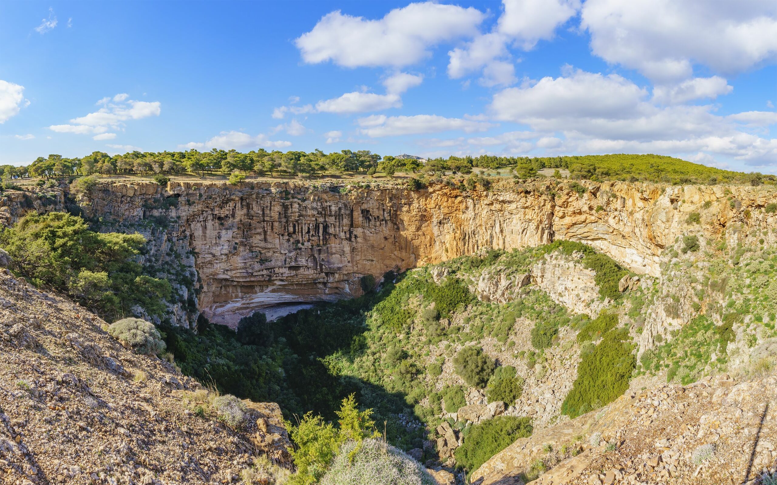 Μετά από ένα «γεμάτο» πρωινό στο Λαύριο αποφασίσαμε να δούμε από κοντά και τον Εθνικό Δρυμό Λαυρίου-Σουνίου. Αν και η περιοχή χτυπήθηκε φέτος από τις πυρκαγιές, ο Εθνικός Δρυμός διασώθηκε. Εντός του εθνικού Δρυμού Λαυρίου- Σουνίου βρίσκεται και ένα πολύ εντυπωσιακό γεωλογικό δημιούργημα το οποίο δεν είναι γνωστό στους περισσότερους κατοίκους του Λεκανοπεδίου. Ένα βάραθρο με βάθος λίγο παραπάνω από 50 μέτρα και διάμετρο περίπου 150 μέτρα. Λέγεται βάραθρο του Έγκοιλου Χάους, ένα όνομα που σίγουρα αντανακλάται στην εντυπωσιακή εικόνα που αντικρίσαμε.