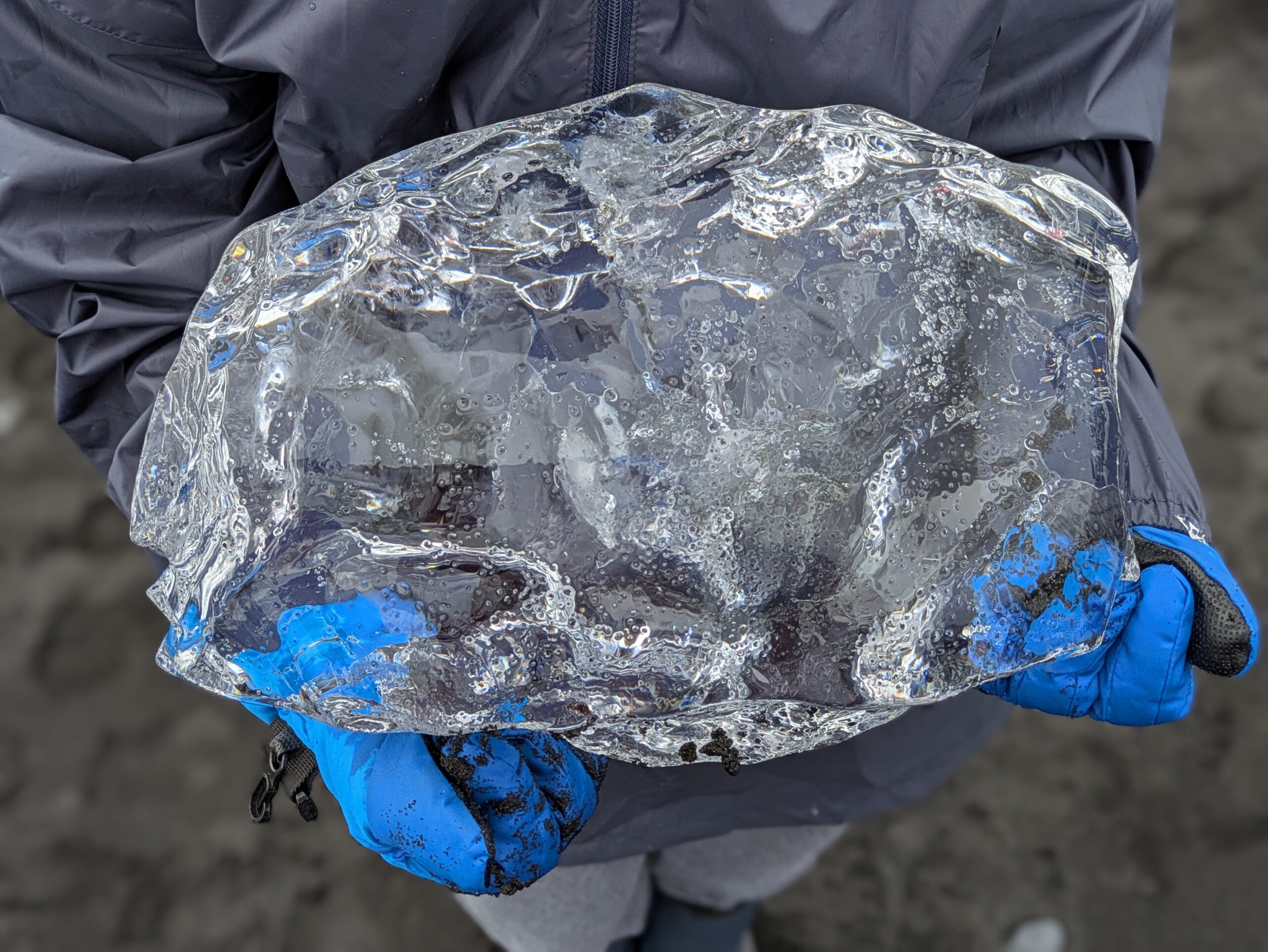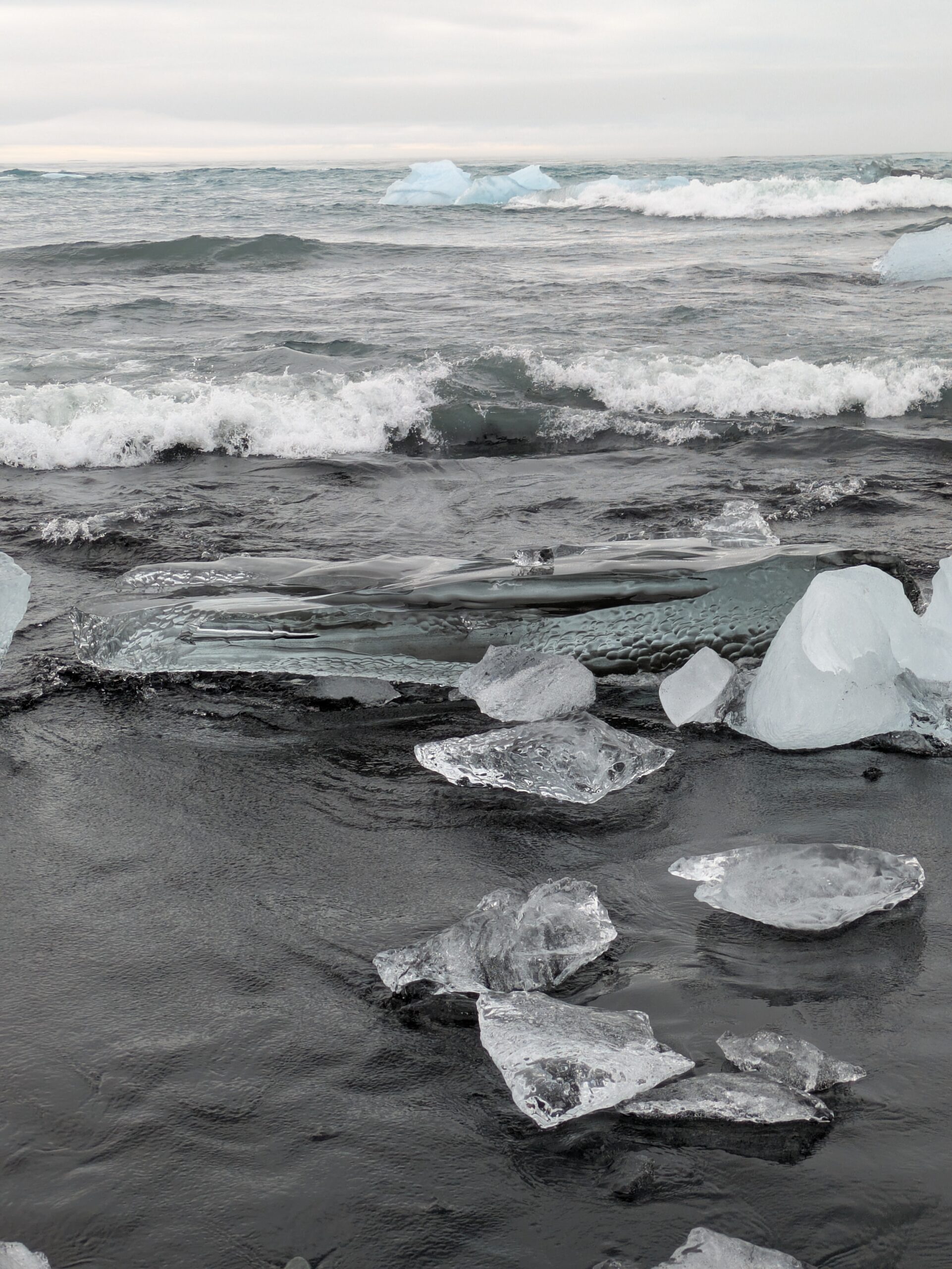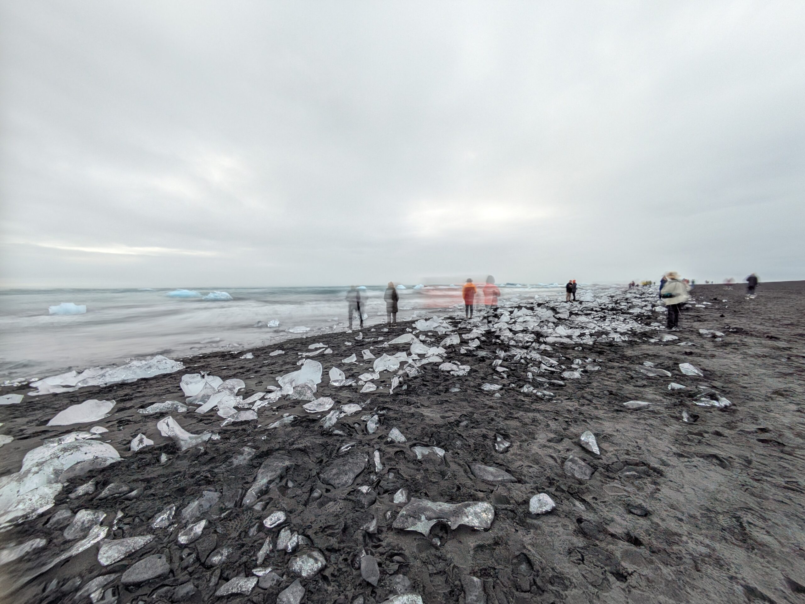 Η Breiðamerkursandur είναι πιο γνωστή ως Diamond Beach, αν και στην πραγματικότητα δεν είναι διάσπαρτη με διαμάντια, αλλά με κομμάτια πάγου που αστράφτουν σαν πολύτιμοι λίθοι πάνω στη μαύρη άμμο. Καθώς τα παγόβουνα διαλύονται στον ωκεανό -μερικά μετά από χίλια χρόνια ζωής- τα απομεινάρια τους ξεβράζονται στην ακτή σαν άγνωστα είδη ψαριών που αναδύθηκαν από την παγωμένη άβυσσο. Περνάμε πάνω από μία ώρα παρατηρώντας, για πρώτη φορά στη ζωή μας, την εκπληκτική ποικιλομορφία του πάγου: ορισμένα «διαμάντια» αυτής της παραλίας είναι διάφανα σαν γυαλί, άλλα γαλακτερά λευκά και άλλα διάστικτα με φερτά υλικά που έχουν παγιδευτεί στο εσωτερικό τους.