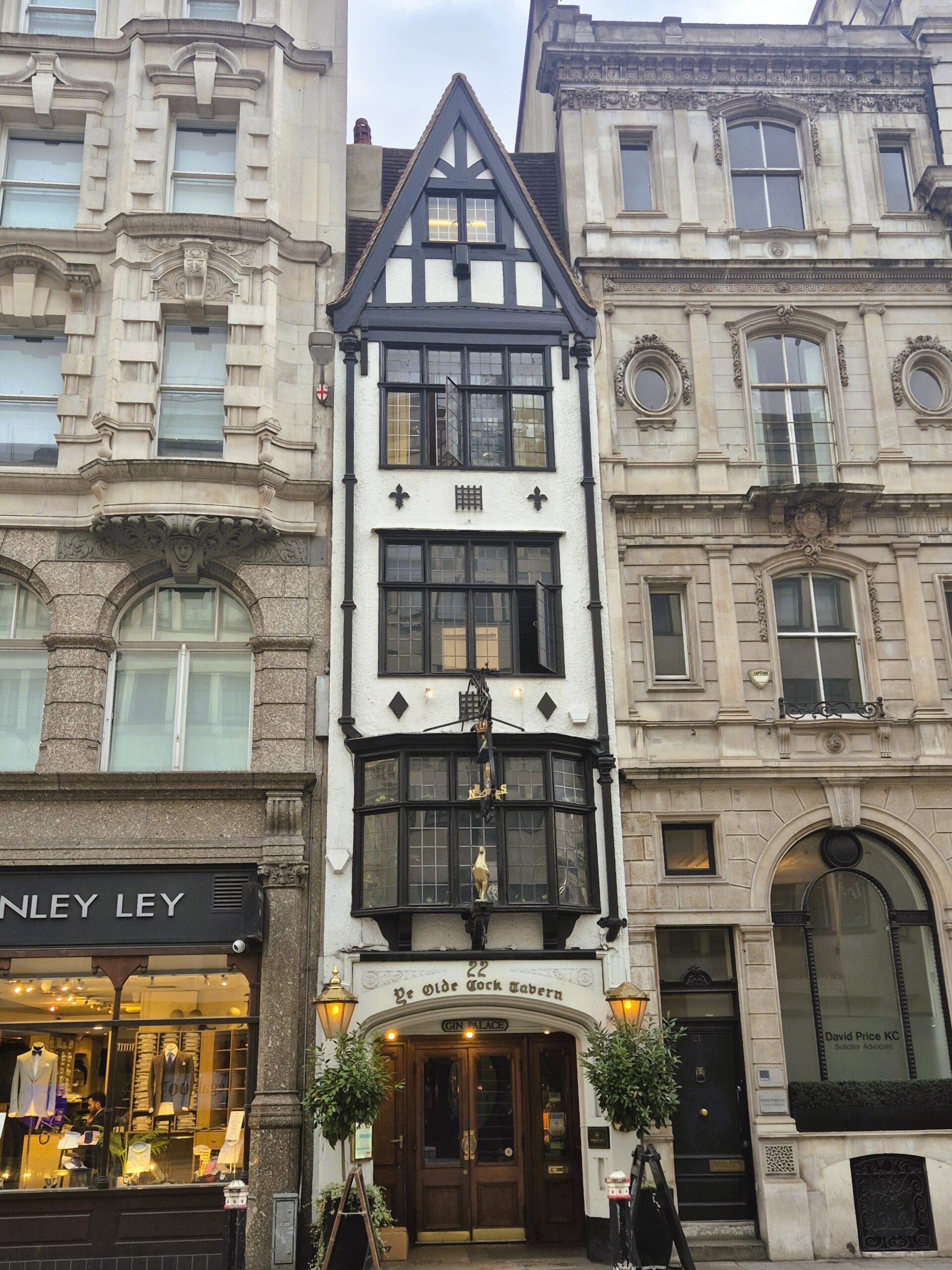 Ye Olde Cock Tavern: Λίγα βήματα ανατολικότερα, η οδός Strand μετονομάζεται σε Fleet St και η φιγούρα ενός χρυσού κόκορα υποδεικνύει την επόμενη στάση σας: είναι η παραδοσιακή pub Ye Olde Cock Tavern, εν λειτουργία στο σημείο αυτό από το 1887 αλλά με ιστορία που ξεκινά το 1549 και με την ιδιαιτερότητα της pub με τη στενότερη πρόσοψη σε όλο το Λονδίνο. Θαμώνες της έχουν υπάρξει διάσημες προσωπικότητες όπως οι Charles Dickens, Alfred Tennyson, Samuel Pepys, και Dr Johnson, αλλά στις μέρες μας, στο ζεστό εσωτερικό με τη φιλική ατμόσφαιρα, θα βρείτε την κλασσική ποικιλία από μπύρα και μηλίτη, όπως επίσης ένα μενού με πλούσιες σαλάτες, χορταστικά burgers, παραδοσιακά fish n’ chips και γλυκές πουτίγκες.