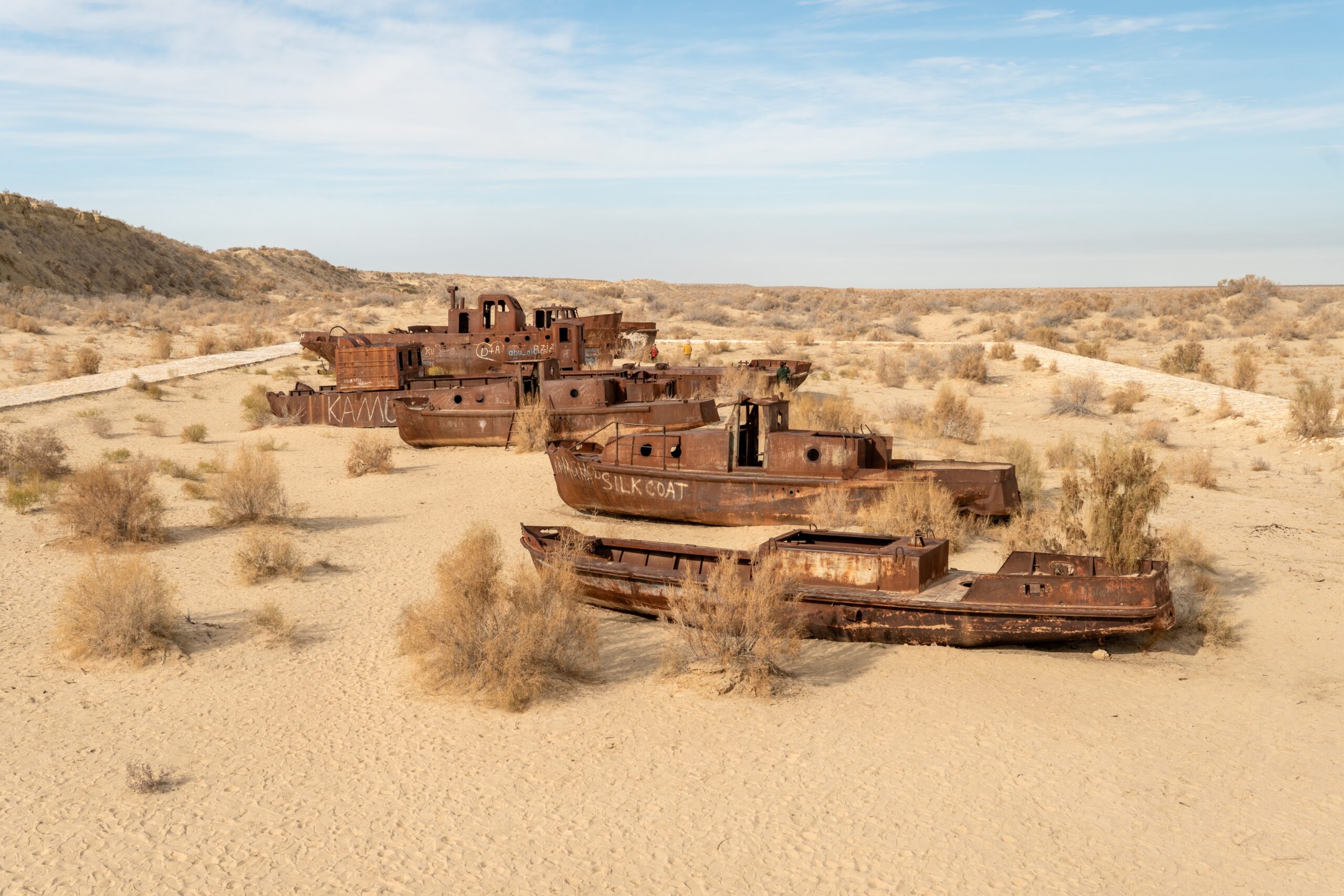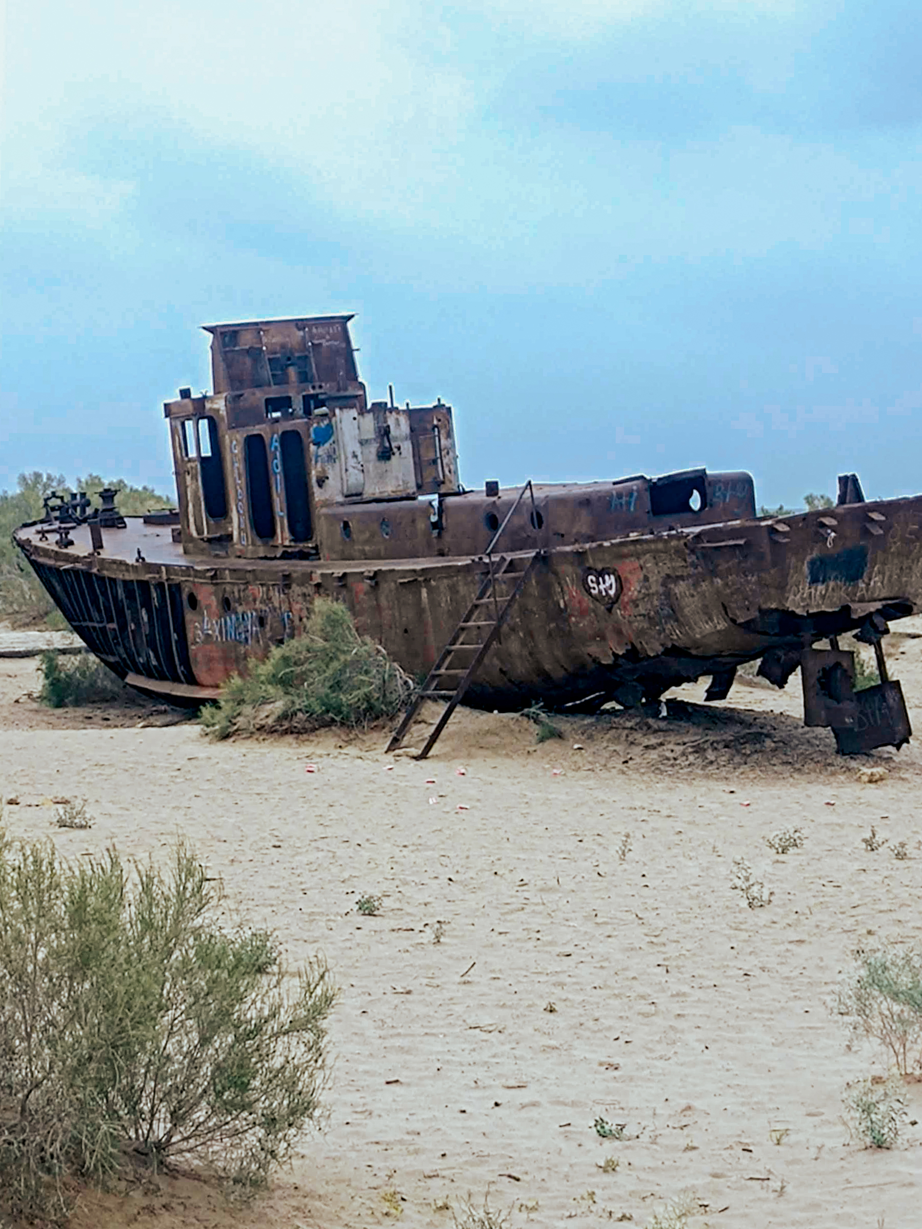 Φθάνοντας στο Muynak, διαπιστώνω ότι πρόκειται για μια πόλη-μουσείο ή για να το θέσω καλύτερα, για νεκροταφείο πλοίων. Επισκεπτόμαστε πρώτα το μικρό μουσείο για να μάθουμε την τραγική ιστορία της παραλίμνιας πόλης μέσα από παλιές φωτογραφίες, πίνακες σοβιετικών καλλιτεχνών, κονσερβοποιημένα προϊόντα που αλιεύονταν από τη λίμνη Αράλη και συσκευαζόταν από τις τοπικές κονσερβοποιίες. Βγαίνοντας από το μουσείο βλέπουμε σε μια αποξηραμένη περιοχή, που κάποτε ήταν λιμάνι, καμήλες να βόσκουν αμέριμνες δίπλα στα κουφάρια πλοίων. Για πολλές μέρες, αυτή η εικόνα με τα πλοία-φαντάσματα ερχόταν συνέχεια στο μυαλό μου.