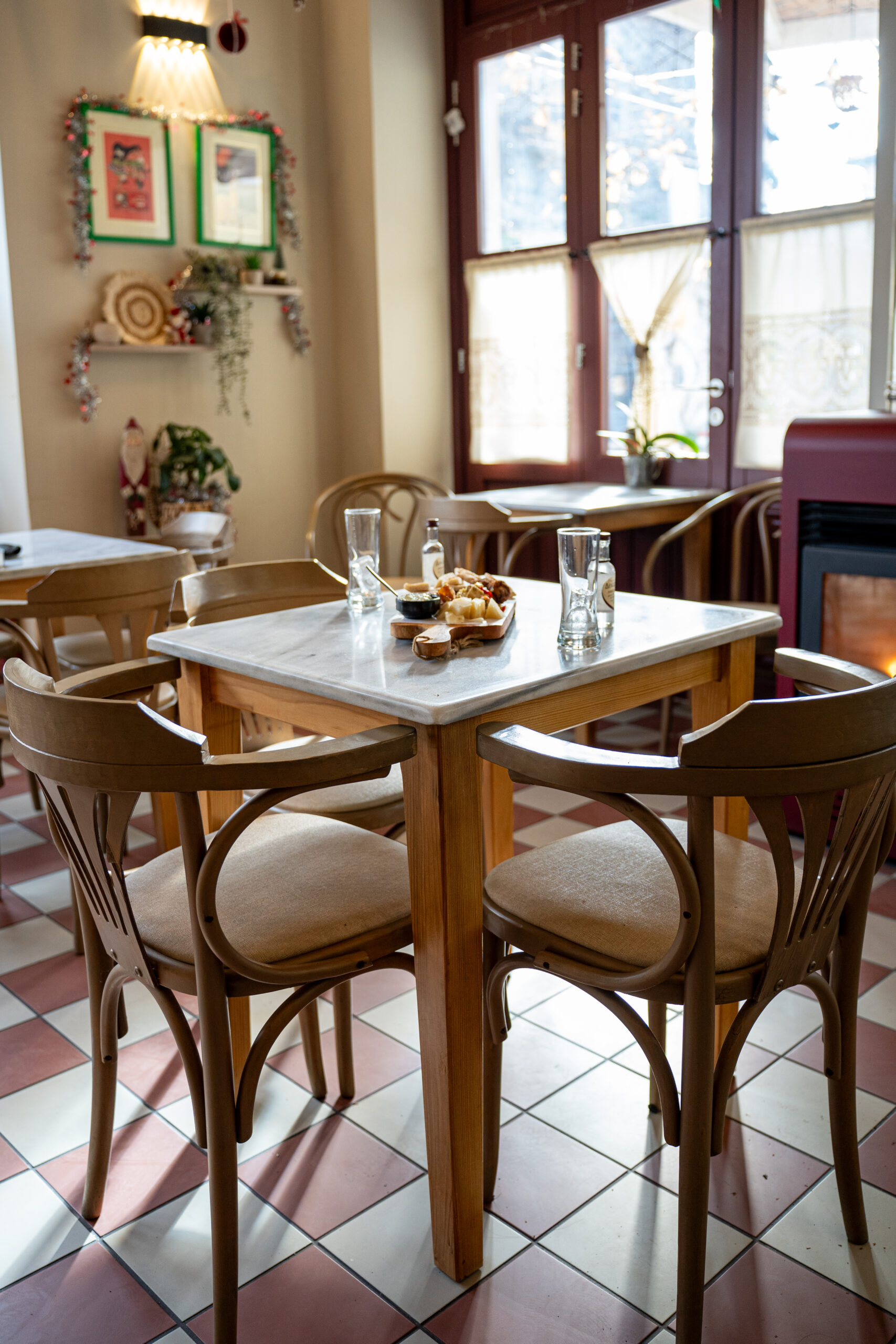 Στο διπλανό τραπέζι, μια άλλη παρέα, έχει ήδη ξεκινήσει το πρωινό τελετουργικό του τσίπουρου. Τα πιατάκια με τους μεζέδες – παραδοσιακά τυριά, ελιές και χωριάτικο ψωμί – στολίζουν το τραπέζι τους, ενώ οι συζητήσεις τους γεμίζουν τον χώρο με ζωντάνια. Σημειώνουμε νοερά να επιστρέψουμε αργότερα για την ίδια εμπειρία.