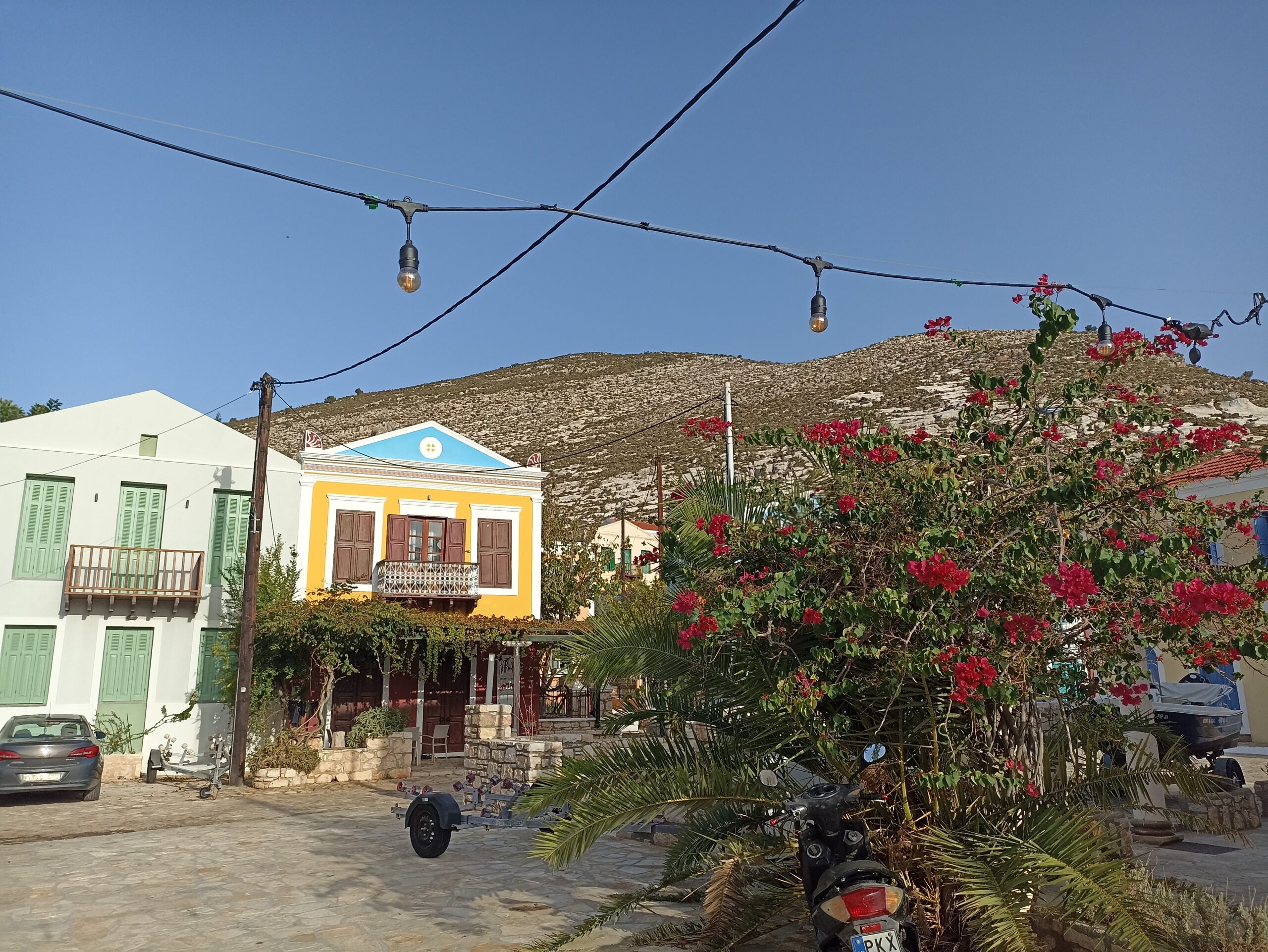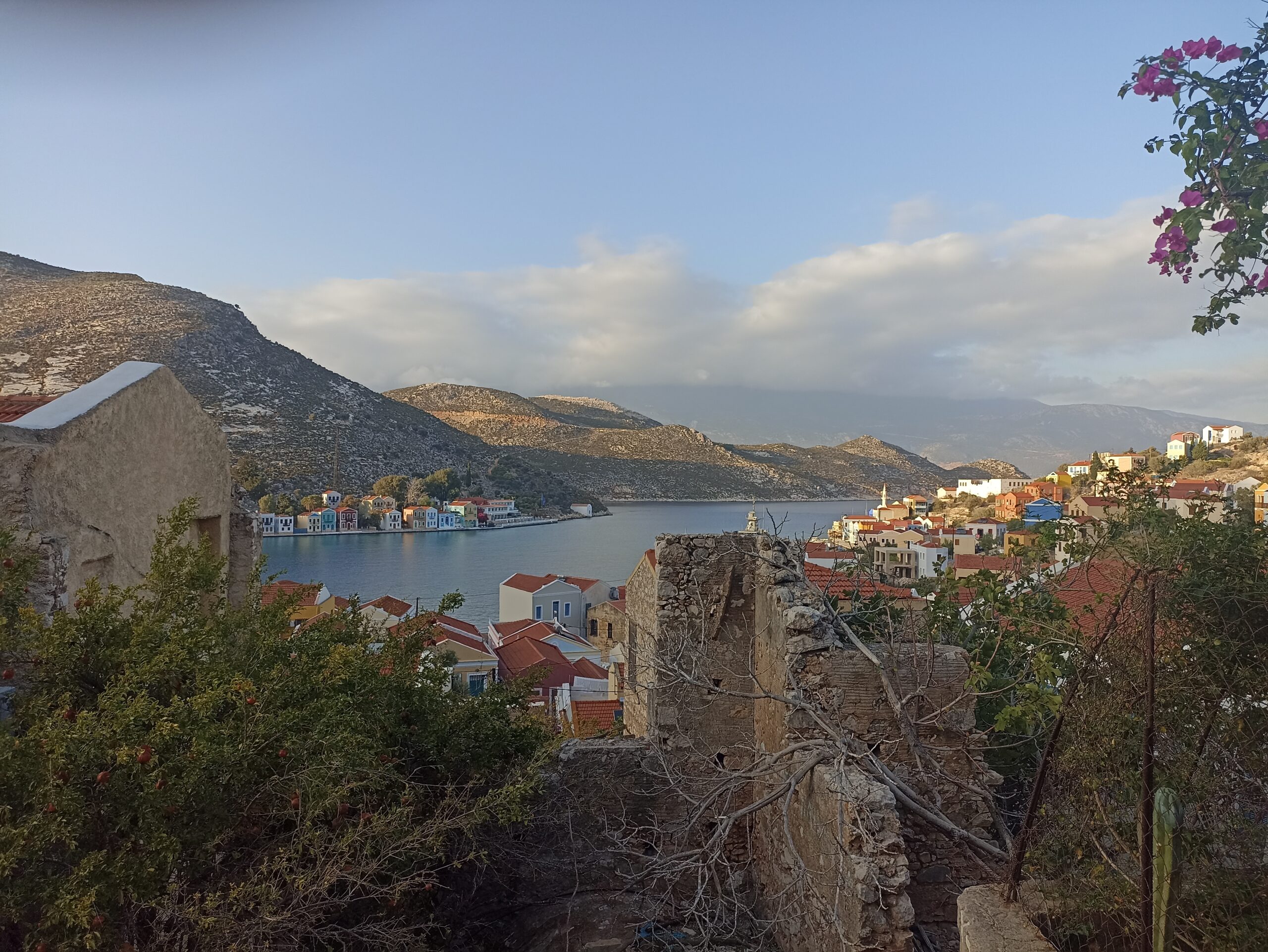 Αμέσως μετά, αφού γυρίσετε στο λιμάνι, μπορείτε να πιείτε καφέ κοιτάζοντας τη θάλασσα ή να «χαθείτε» στα στενά του οικισμού και να περιδιαβείτε σε άλλες εποχές, όπου πολλοί κατακτητές πέρασαν από αυτό το νησί και άφησαν για πάντα εκεί τα ιστορικά χνάρια τους. Πλακόστρωτα ή στενά, χωμάτινα δρομάκια, σκαλοπάτια και πόρτες που θυμίζουν κάστρα υπάρχουν σε κάθε γωνιά, όπως και τα «ματάκια» σε αυλές και φουρούσια που διώχνουν την αρνητική ενέργεια. Μπορείτε να ξαποστάσετε σε κάποια περιποιημένη αυλή, αφού ο δρόμος σε βγάζει σε σπίτια κατοίκων που σε κοιτάζουν και χαμογελούν, ή σε μικρά μπαλκονάκια με ξύλινα ή μεταλλικά υποστυλώματα για να δεις από ψηλά το λιμάνι ή τους «απέναντι». Είναι η στιγμή που αναρωτιέσαι και σε πιάνει δέος από το πόσο μακριά βρίσκεσαι από την Αθήνα και, βασικά, «πόσο κοντά στην Τουρκία;».