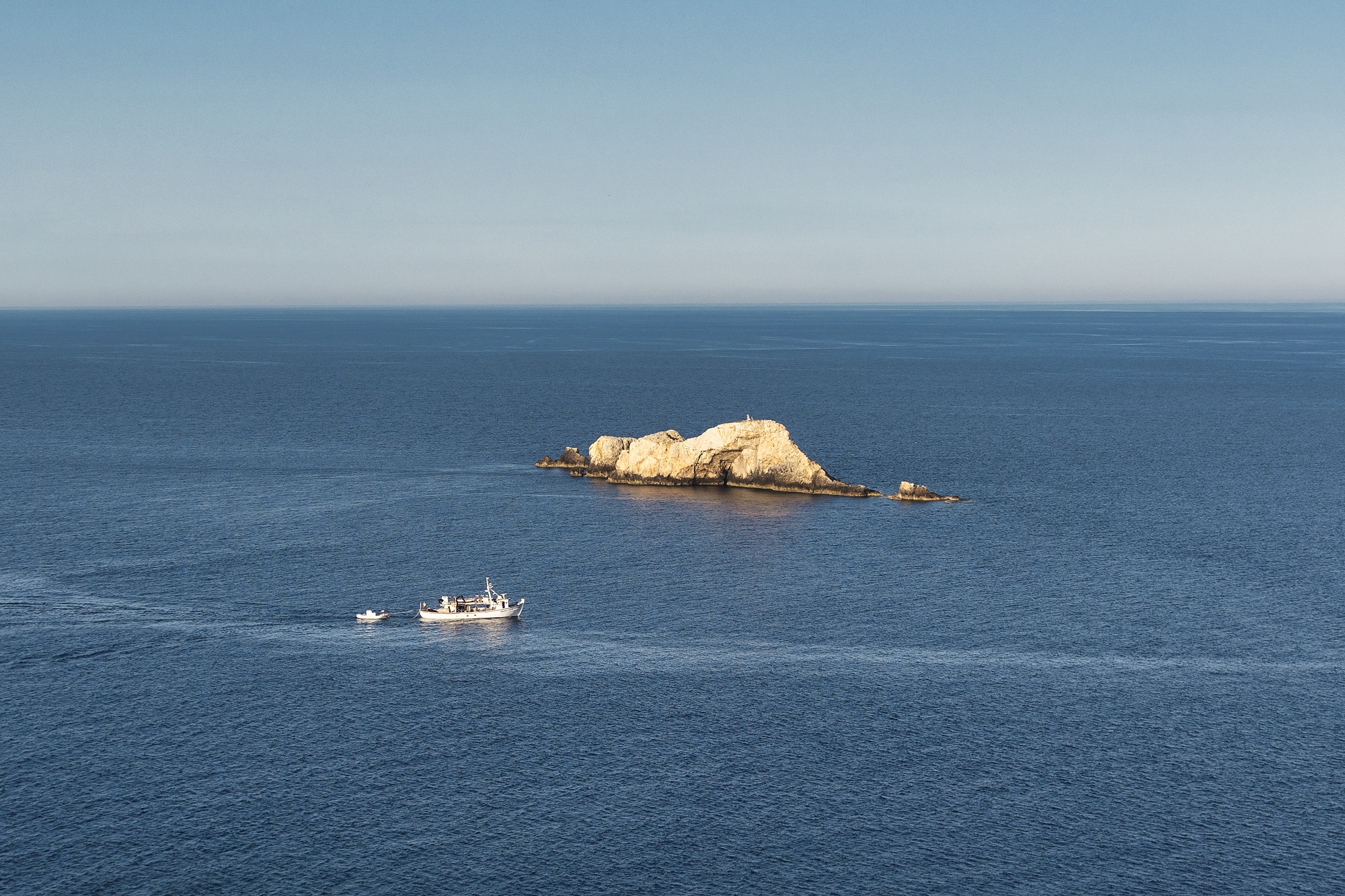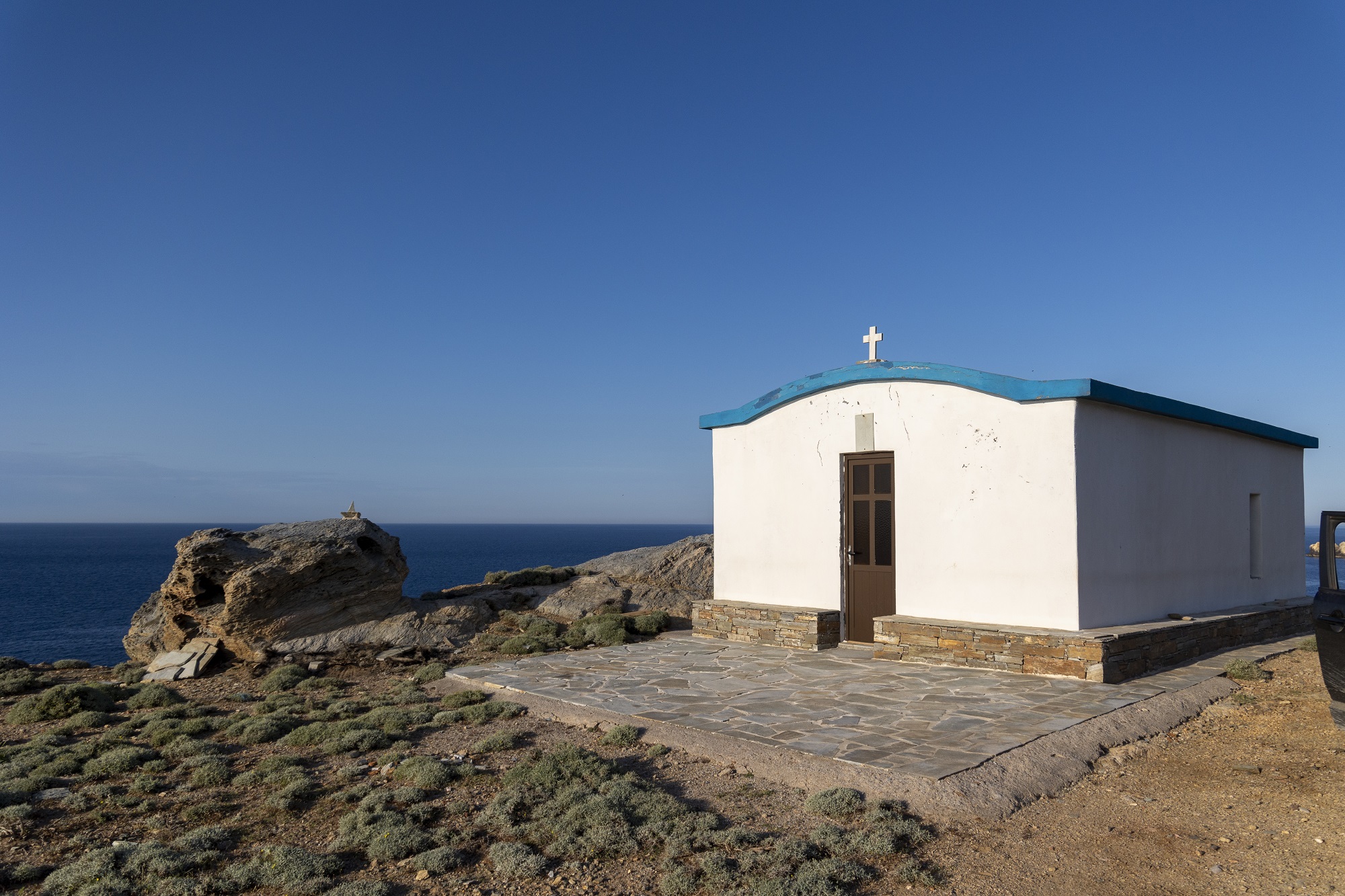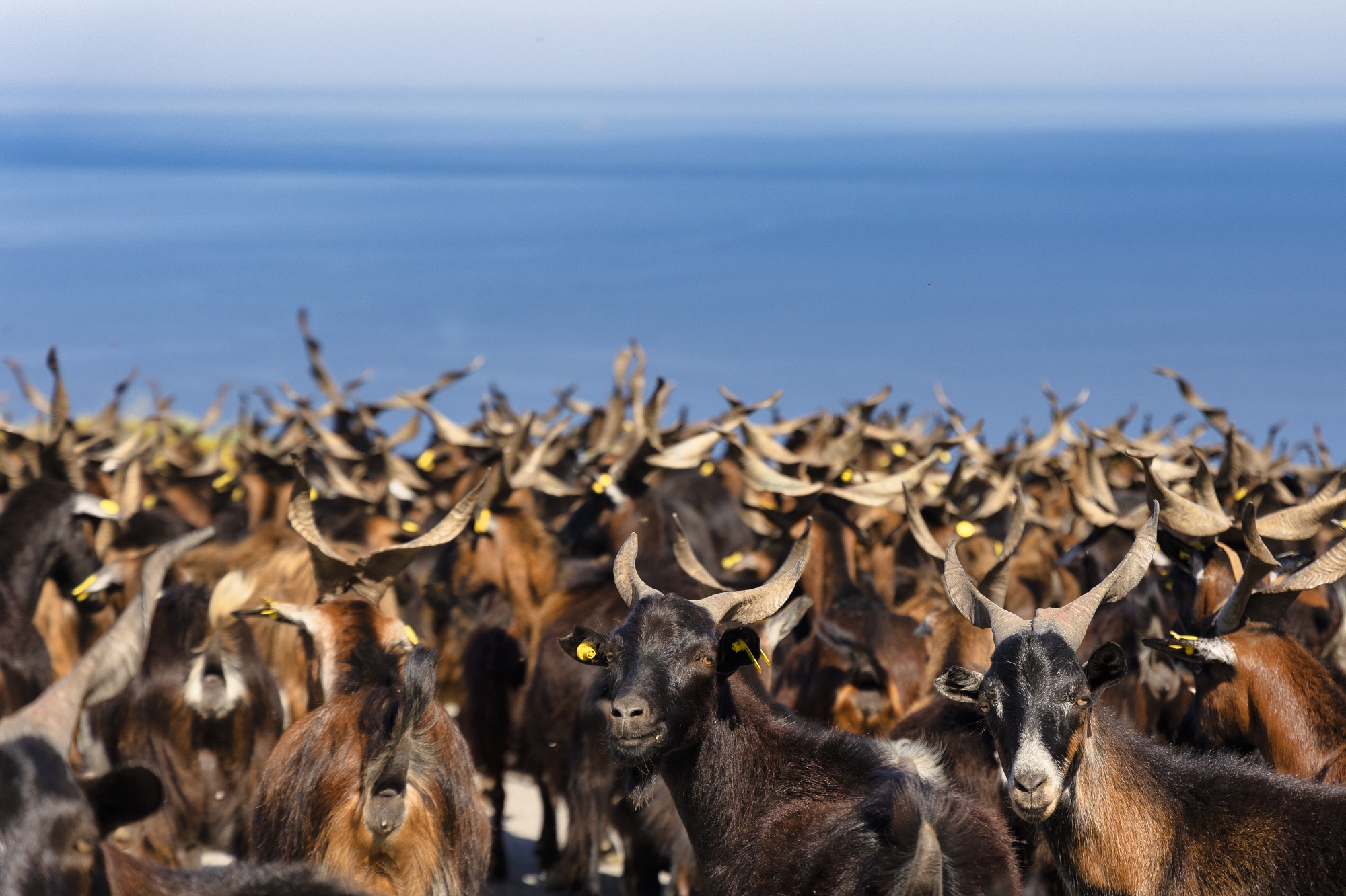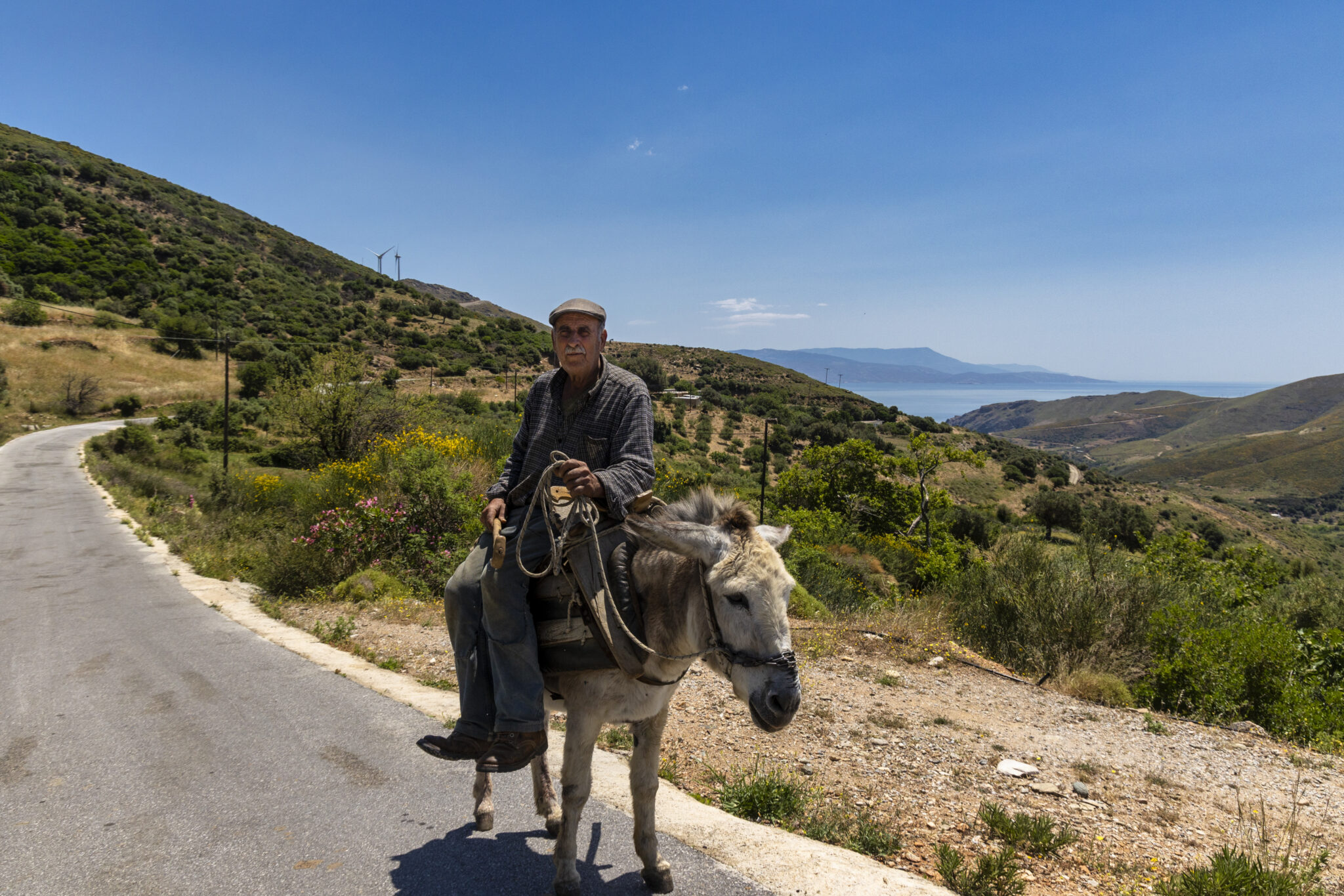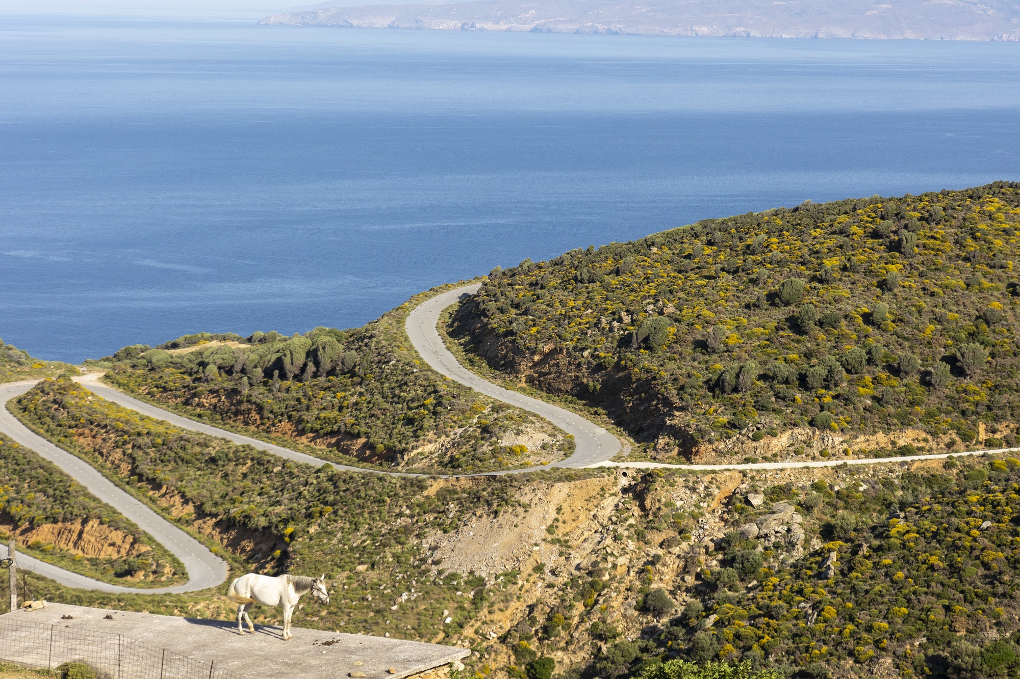 Στη διαδρομή σας, κατόπιν, θα περάσετε ατελείωτες σειρές από γιγαντιαίες λευκές ανεμογεννήτριες –αν φυσάει, ο ήχος τους σκίζει τον ουρανό. Κοπάδια από κατσίκια με τα σκυλιά που τα φυλάνε διασχίζουν εντωμεταξύ τον δρόμο, κατρακυλώντας από τις πλαγιές. Ακούς τα κουδούνια τους πριν τα δεις. Πάνω από το κεφάλι σας, πάλι, εποπτεύουν θαλασσοπούλια. Η απέραντη γαλανή θέα του Αιγαίου σας κυκλώνει αγέρωχα από παντού.