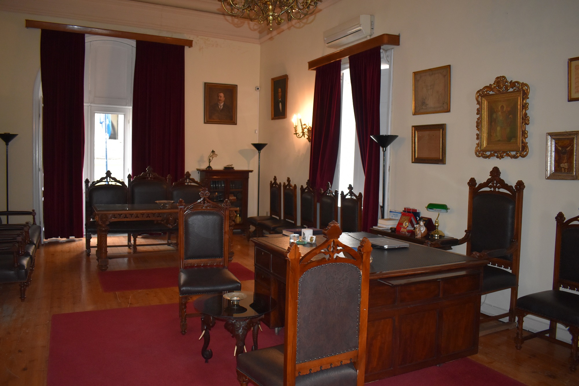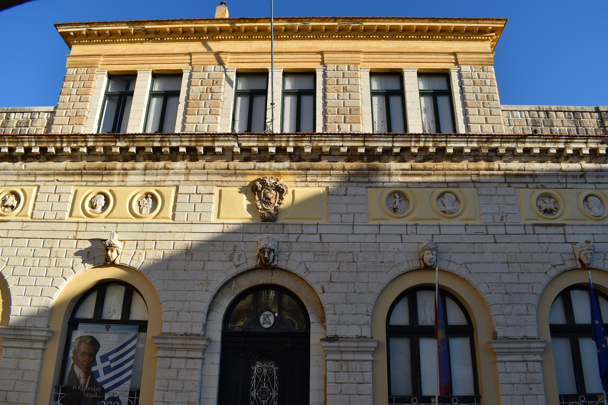 Στο κομψό εσωτερικό υπάρχουν πολλά στοιχεία που υποδηλώνουν το λαμπρό παρελθόν: το γραφείο του δημάρχου με το κόκκινο χαλί, οι νωπογραφίες στο ταβάνι, τα επιμελώς διατηρημένα παλιά έπιπλα. Είναι επίσης γεμάτο πορτραίτα σημαντικών προσωπικοτήτων, που άφησαν το σημάδι τους στην Κέρκυρα και συνέβαλαν στην πολιτιστική μα και πολιτική της άνθιση.