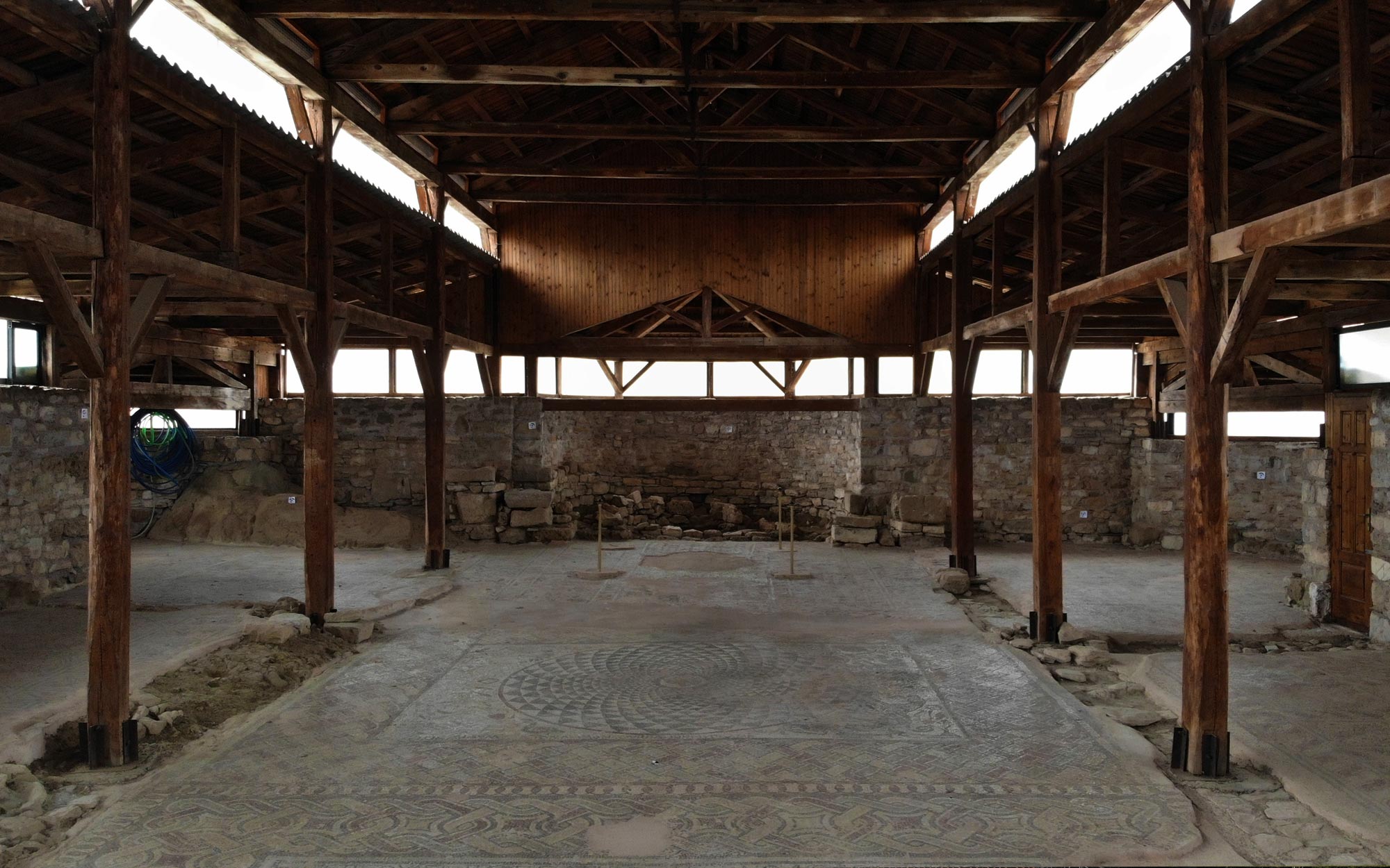 Το αρχικό κτίσμα καταστράφηκε από σεισμό, αλλά οι ανασκαφές αποκάλυψαν το εντυπωσιακό του ψηφιδωτό δάπεδο με πτηνά, ζώα, γεωμετρικά σχήματα και επιγραφές, το οποίο έχει τα δικά του μυστήρια για τους ερευνητές, γιατί ορισμένα σχέδια παραπέμπουν ευθέως στη χλωρίδα και στην πανίδα του Νείλου, στην Αίγυπτο. Όποια κι αν είναι η απάντηση σε αυτό το γοητευτικό αίνιγμα, αξίζει να περάσετε από τον Άγιο Λεωνίδη για να το δείτε από κοντά.