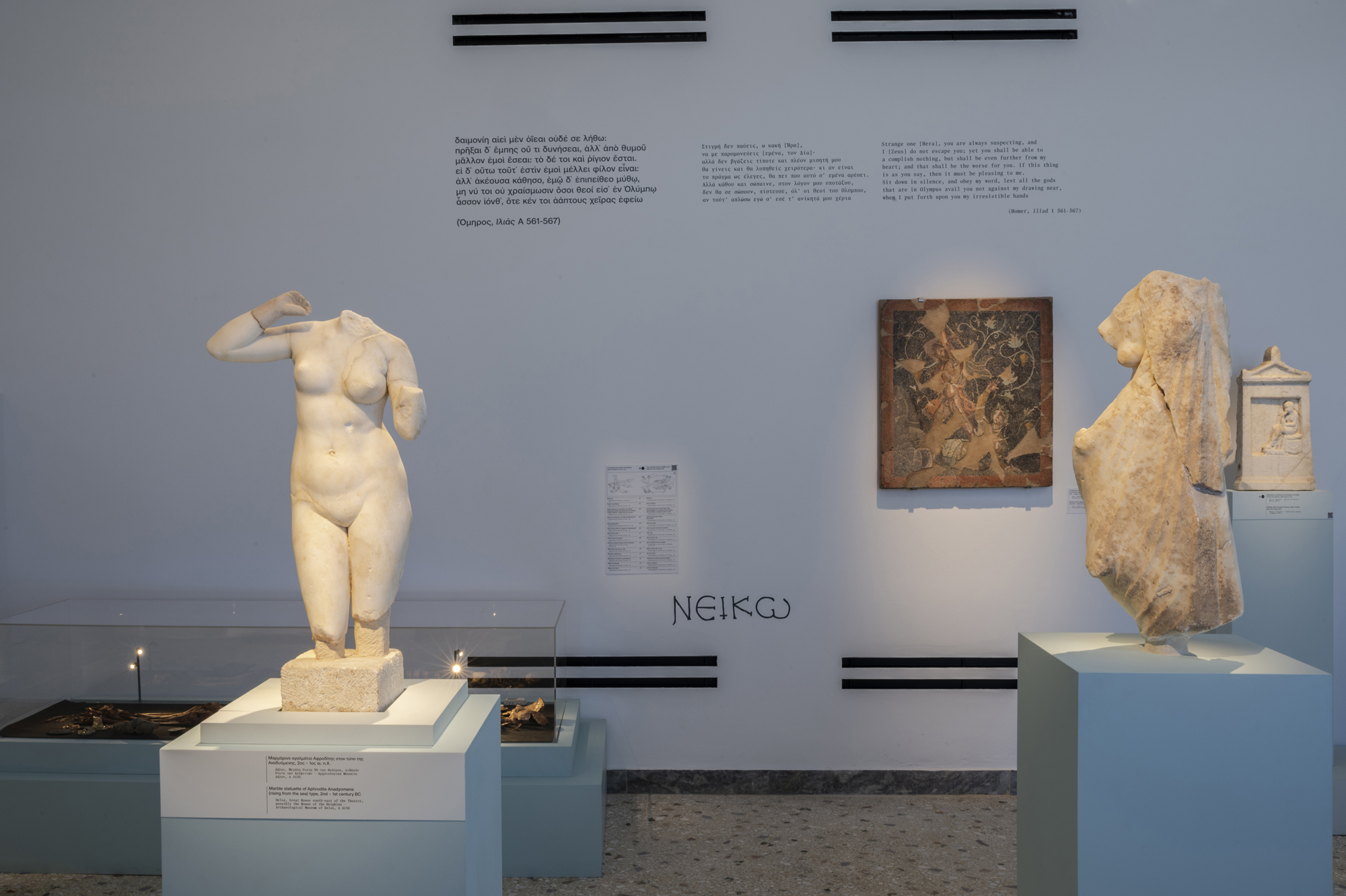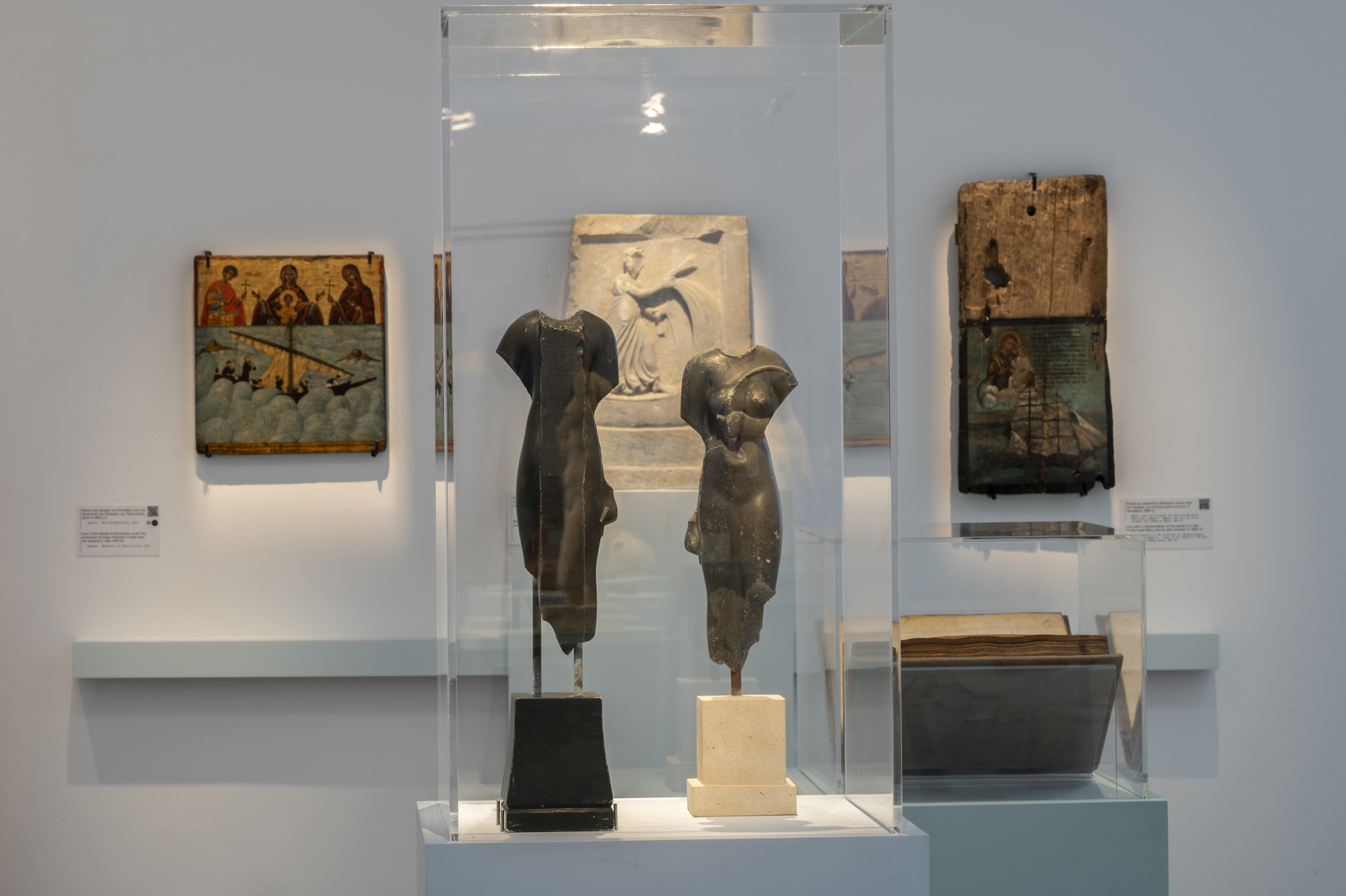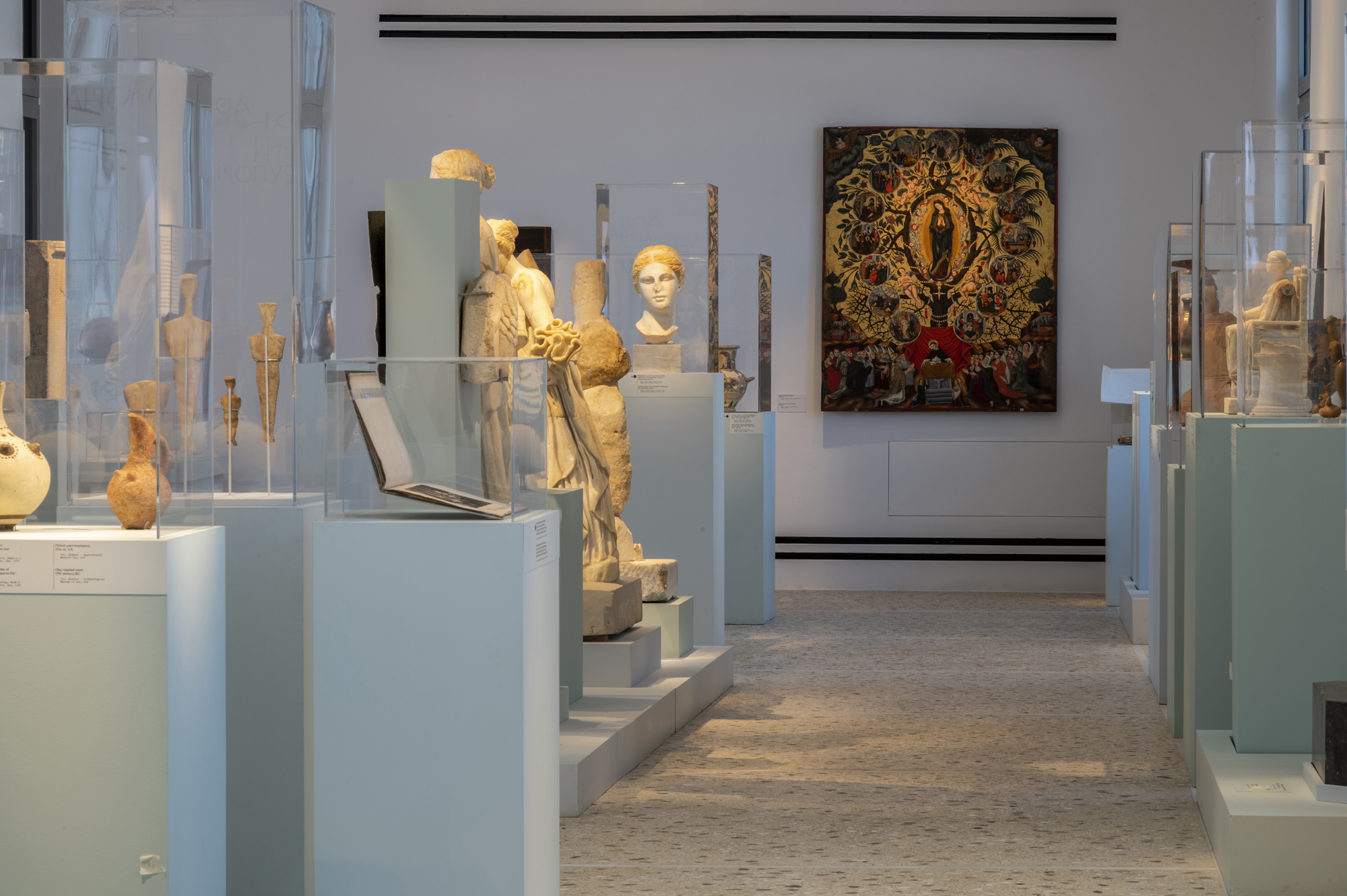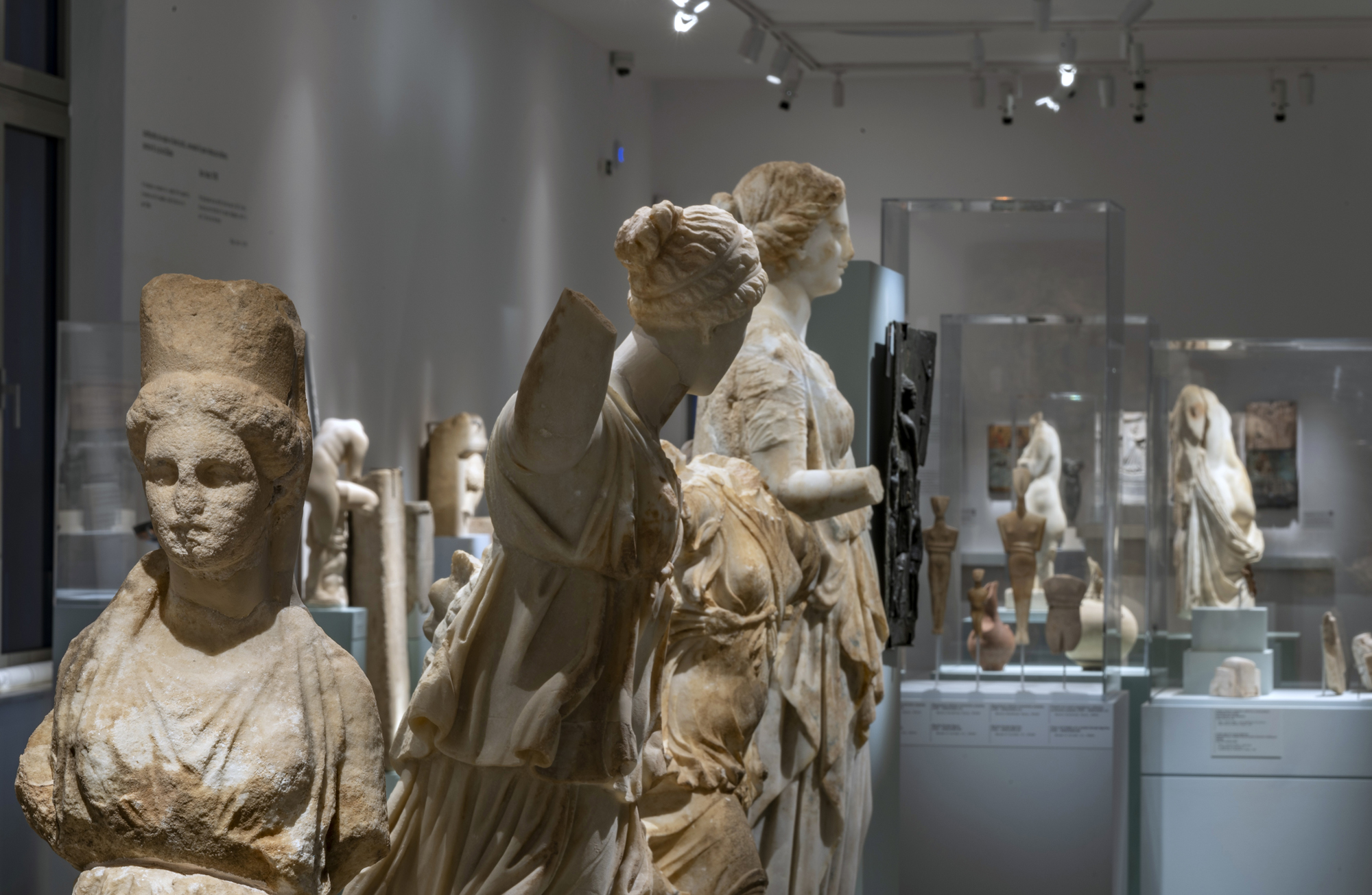 Οι μαρμάρινες, μα συνάμα συναρπαστικές και ολοζώντανες Κυκλαδίτισσες της 3ης χιλιετίας π.Χ., με τα σταυρωμένα χέρια και τα γυμνά σώματα, αποτέλεσαν για δεκαετίες σύμβολα μιας αινιγματικής αισθητικής, πολύ μακριά από ασφαλή συμπεράσματα και σίγουρες ερμηνείες. Μοναδικές στην απλότητά τους και, την ίδια στιγμή, τρομακτικά αμφίσημες. Πότε έρχονταν με τη μορφή σπουδαίας θεάς, πότε με τη μορφή μικρού ειδωλίου ως νεκρική προσφορά, άλλοτε ως πορτρέτο καθημερινών γυναικών των αρχαίων Κυκλάδων. Κάποιες φορές, εμφανίζονται σαν λαβωμένες, πληγωμένες γυναίκες, τσακισμένες από την έμφυλη βία, ένα κομμάτι της έκθεσης που συγκλονίζει, προβληματίζει και επηρεάζει βαθιά. Στην έκθεση, τα ειδώλια συνομιλούν, όμως, και με άλλες γυναικείες μορφές. Ψηφιδωτά από τη ρωμαϊκή εποχή, χειρόγραφα της μεταβυζαντινής περιόδου, τοιχογραφίες που απεικονίζουν ιέρειες και θεότητες γίνονται ένα σε μία προσπάθεια απεικόνισης της πραγματικής εικόνας και υπόστασης της γυναίκας μέσα στο πέρασμα των αιώνων.