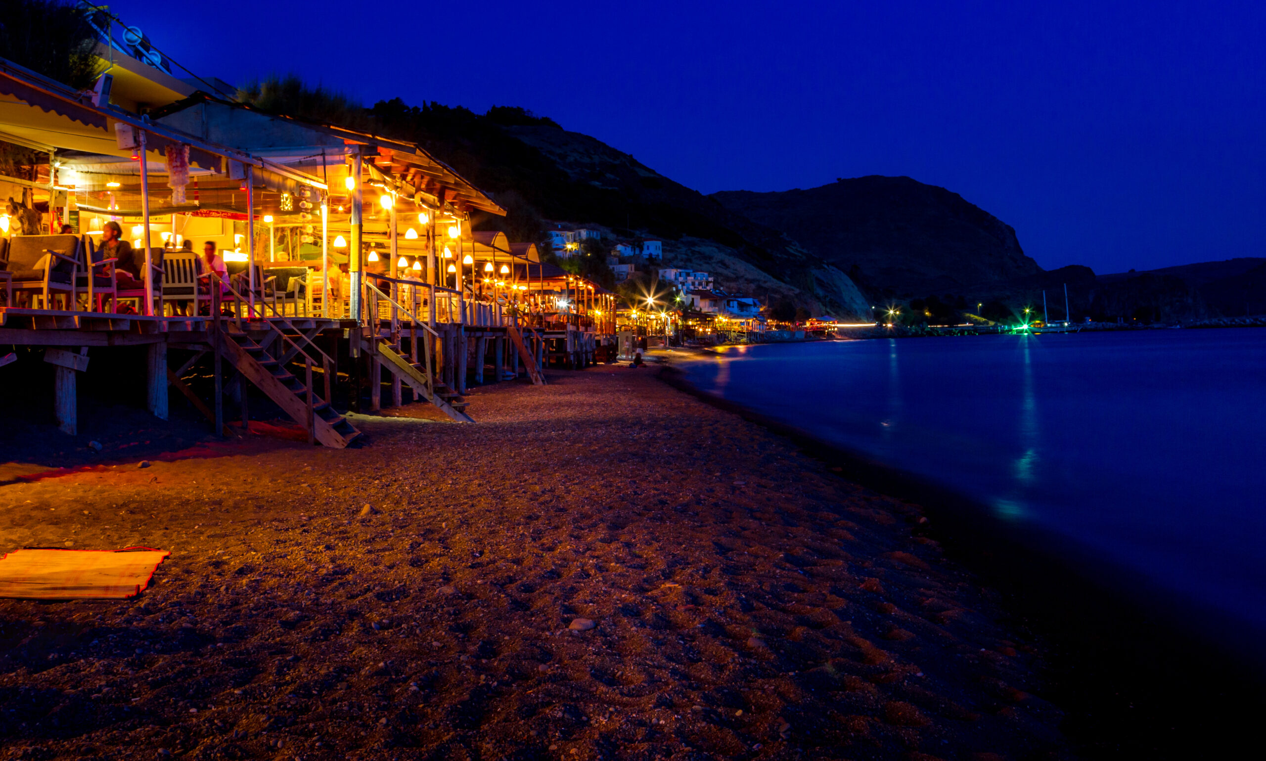 Μερικά χιλιόμετρα νοτιοανατολικά της Ερεσού, ανακαλύπτουμε μια παραλία όπου το σκοτάδι σπάνε ελάχιστα φωτισμένα παράθυρα από τα σπιτάκια που βρίσκονται σκόρπια στα περιβόλια και μια μικρή παραθαλάσσια καντίνα. Σε ένα τραπεζάκι της, φτιαγμένο από ξύλινες παλέτες, πιάνουμε μια μαξιλάρα. Αφήνουμε τη σπιτική λακέρδα και το χωριανό ούζο-δυναμίτη να μας κάψει τα χείλη, τη βρεγμένη άμμο να δροσίσει τα γυμνά μας πέλματα. Μοναδικοί ήχοι, το πλατσούρισμα των κυμάτων, τα τριζόνια και οι συζητήσεις από τις παρέες, χαμηλόφωνες σαν να μη θέλουν να χαλάσουν την ατμόσφαιρα κατάνυξης. Κοιτάμε την αδύναμη φλόγα από το ρεσό που παλεύει με το μελτέμι, σχεδόν με αγωνία λες και εξαρτάται απ’ αυτήν η ψυχή μας. Παντού σκοτάδι γύρω της, αλλά τουλάχιστον απόψε θα νικήσει.