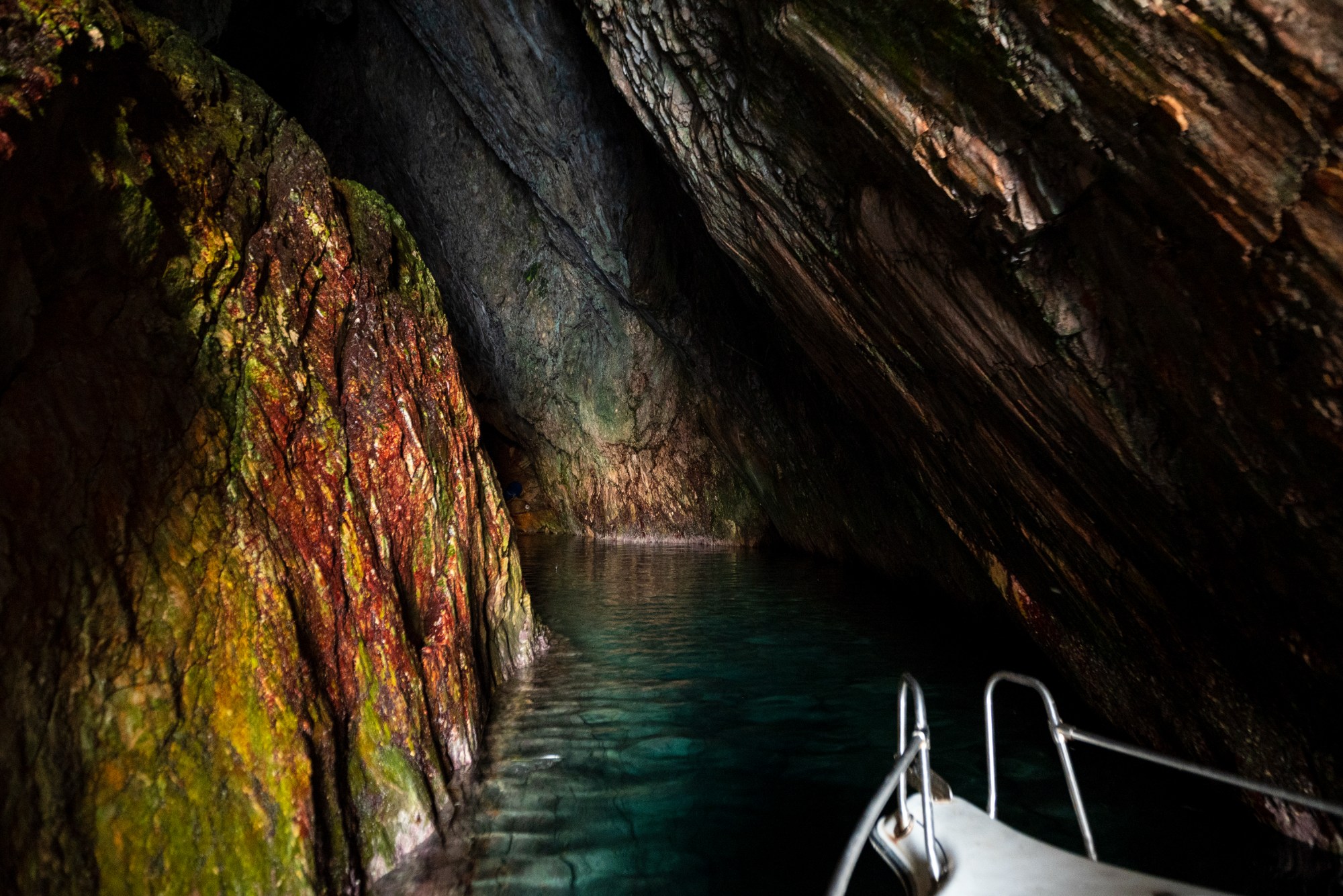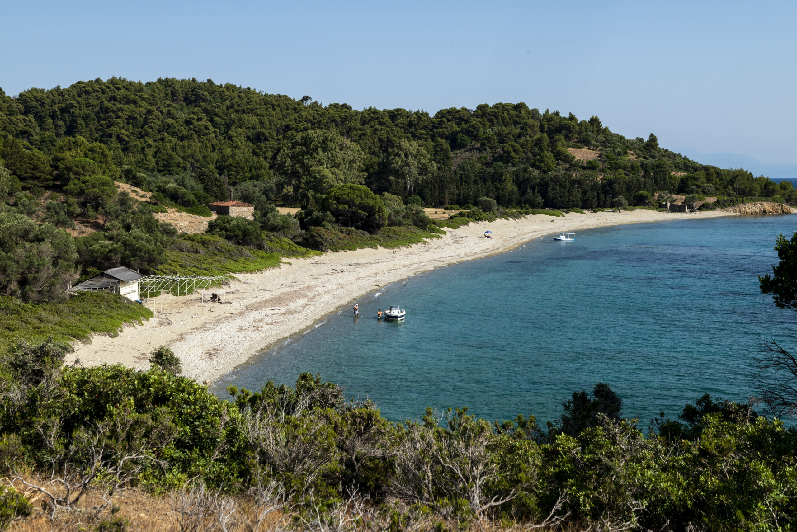 Εμείς κατεβήκαμε από το μονοπάτι και φθάσαμε στη θάλασσα, στην Παραλία του Κάστρου, όπου μας το περίμενε καΐκι για να μας πάει στην παραλία Διαμάντι στην περιοχή Καλαμάκι για φαγητό. Εσείς θα νοικιάσετε το καϊκάκι σας κάτω στο Παλιό Λιμάνι ή θα νοικιάσετε μια βάρκα να σας πάει όπου θέλετε και να επιστρέψει ο θαλασσινός ταξιτζής να σας πάρει όποτε θέλετε. Το δικό μας καϊκάκι, τράβηξε προς τις βορειανατολικές ακτές. Πέρασε από την κάτασπρη παραλία Λαλάρια, από τη Σπηλιά της Φόνισσας, από το Λεχούνι που είχαν κρυφτεί ο αγωνιστές Νικοτσάρας και ο Σταθάς (κάτω από το μοναστήρι του Ευαγγελισμού), από το Μέγα Γιαλό (που περιγράφει ο Παπαδιαμάντης στο διήγημα «Όνειρο στο Κύμα» και από το αεροδρόμιο όπου συγκεντρώνονται οι adrenaline addicted για να βιώσουν την έξαψη της σχεδόν εξ επαφής απογείωσης και προσγείωσης των αεροπλάνων.