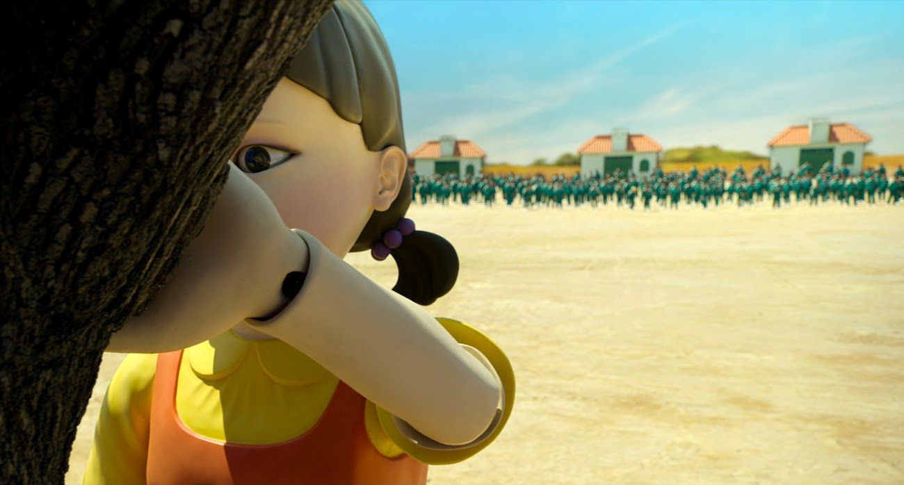 Η πρώτη αρένα στο «Παιχνίδι του Καλαμαριού» -που είναι και η τελευταία του- συνοψίζει τον σουρεαλιστικό χαρακτήρα της σειράς. Ταπεινά καλύβια με στέγες από τερακότα σχηματίζουν εισόδους στην αρένα, που προορίζονται να μιμηθούν τα απλοποιημένα σπίτια που σχεδιάζουν τα παιδιά. Ο ψεύτικος ουρανός καλύπτει και τους τέσσερις τοίχους, θυμίζοντας το θόλο που καλύπτεται από σύννεφα και «τυλίγει» τον κόσμο του Truman Burbank στο The Truman Show (1998). Η αυλή είναι μόνο ένα παράδειγμα του τρόπου με τον οποίο το «Παιχνίδι του Καλαμαριού» αγγίζει το παράξενο φαινόμενο της κοιλάδας για να δημιουργήσει ένα απόκοσμο, άβολο συναίσθημα στους θεατές και ένα (πολύ δικαιολογημένο) προαίσθημα που σου λέει «τώρα θα τα χρειαστώ τα ηρεμιστικά».