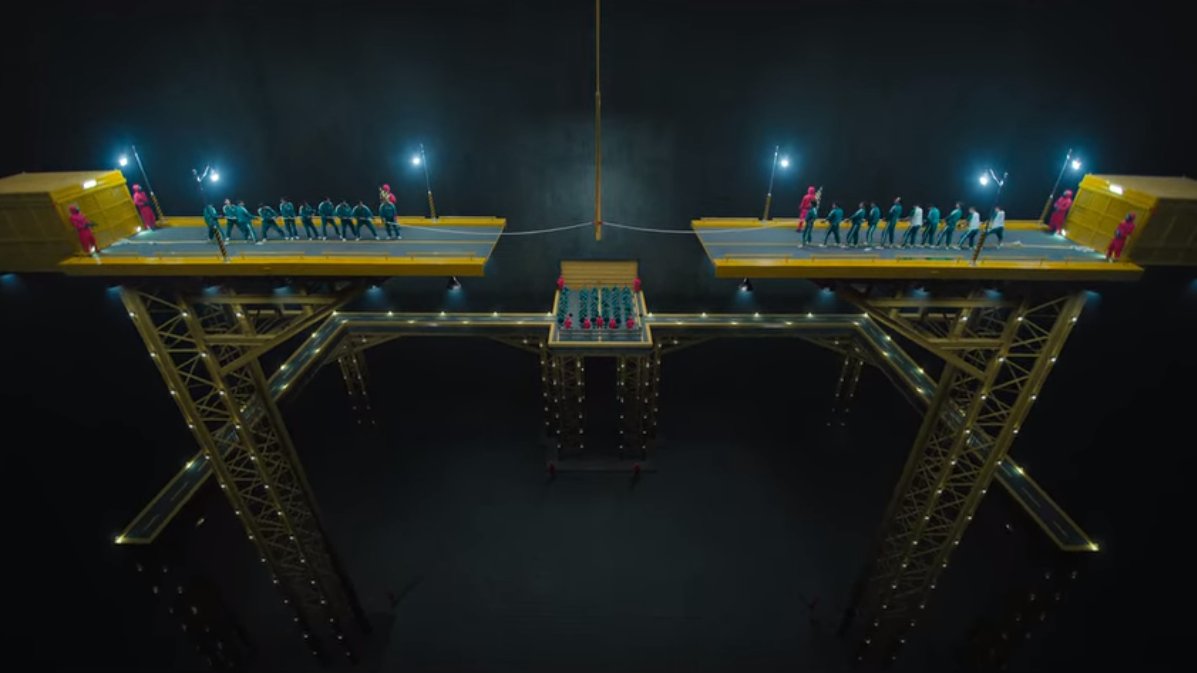 Τα φωτεινά κίτρινα κιβώτια που υποστηρίζουν τις πλατφόρμες μοιάζουν με τα κατασκευαστικά παιχνίδια τύπου lego που παίζουν τα παιδιά. Οι ευρείες γωνίες χρησιμεύουν για να παραμορφώσουν την κλίμακά τους, κάνοντας ολόκληρη τη δομή να μοιάζει με μοντέλο μεγάλης κλίμακας που μειώνει τους παίκτες σε μέγεθος, κάνοντάς τους να μοιάζουν με μικροσκοπικά ειδώλια, σαν παιχνίδια του «συστήματος». Και πάλι, βλέπουμε τους συμμετέχοντες στο Squid Game να ελαχιστοποιούνται από το περιβάλλον τους. Το μίνιμαλ στο μεγαλείο του.