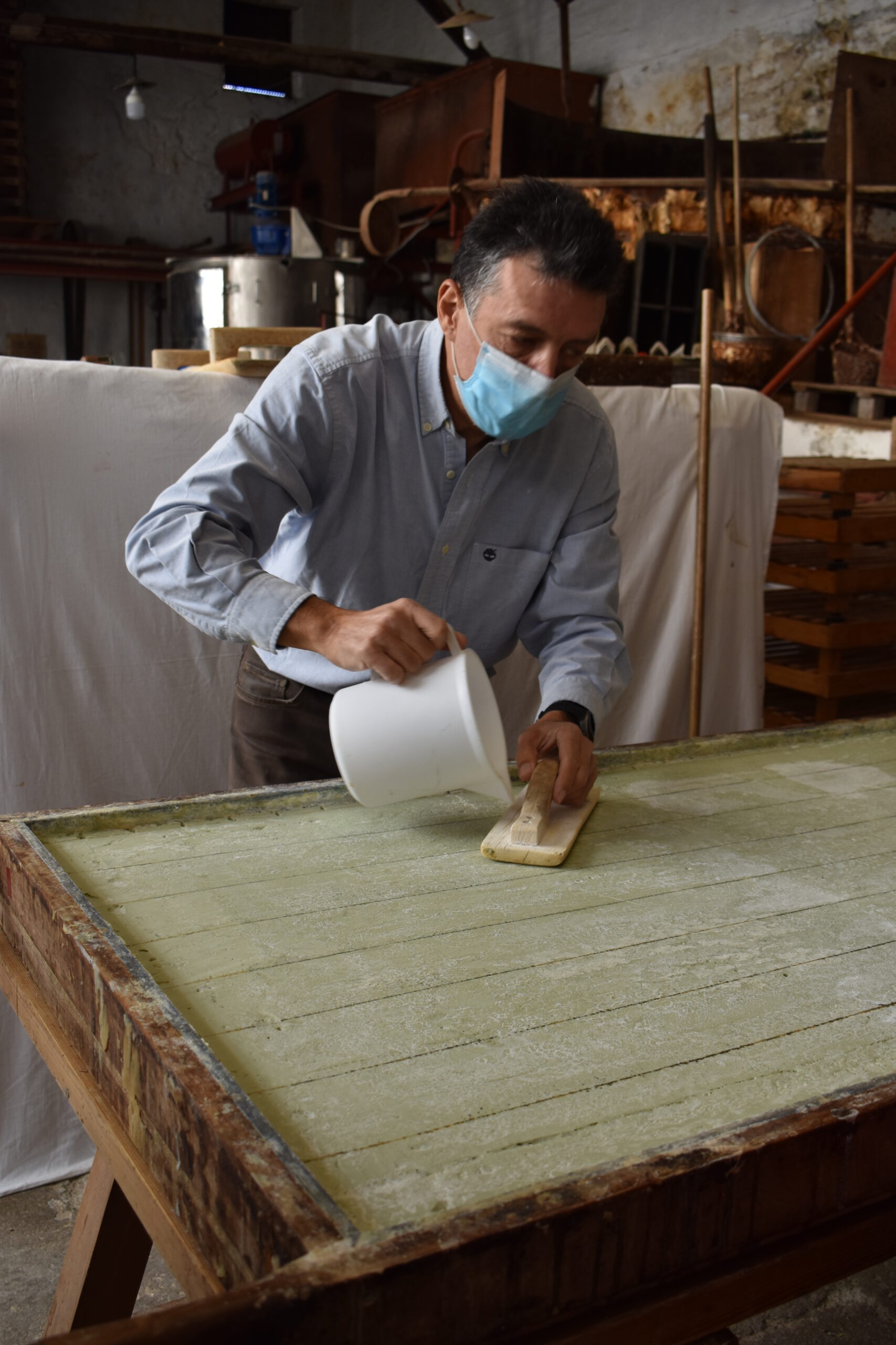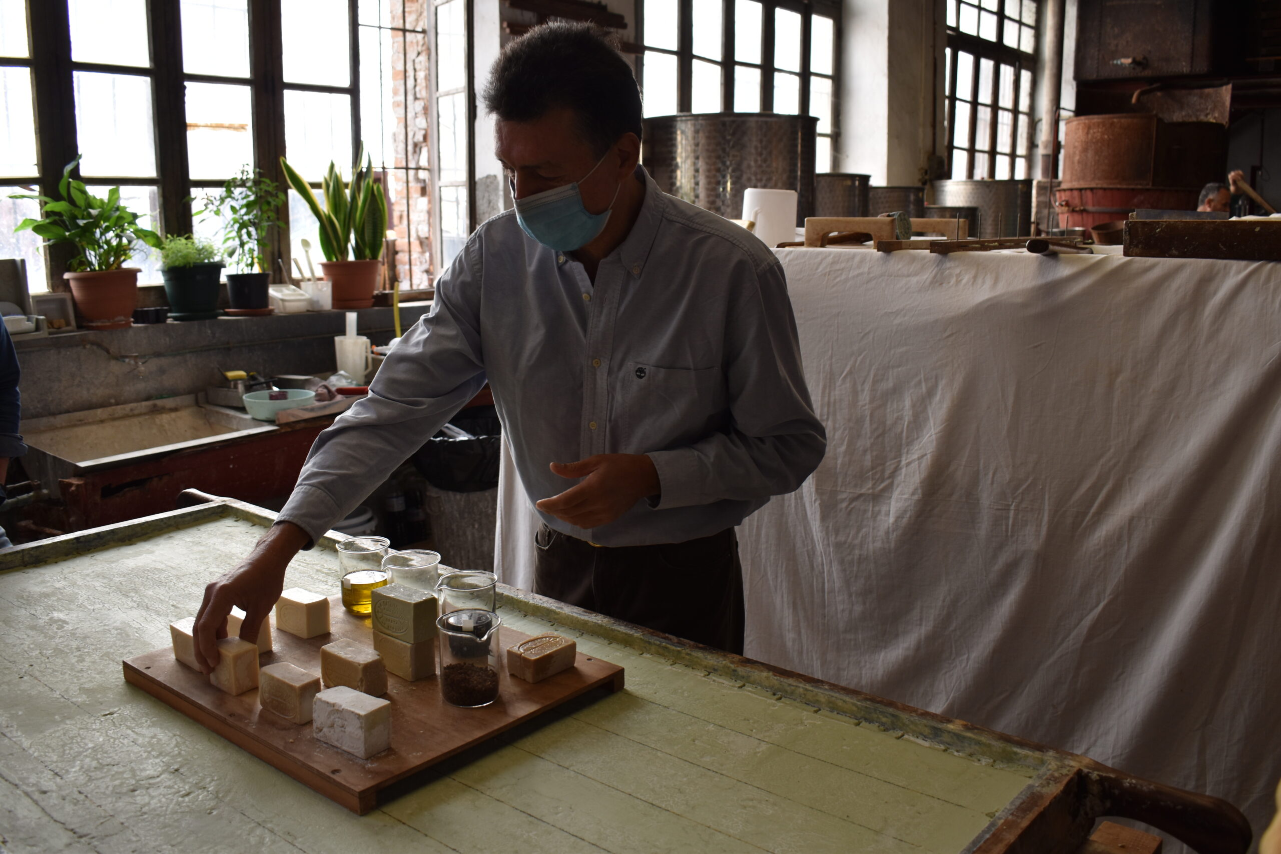 Εκεί λαμβάνουν χώρα καθημερινές, δωρεάν ξεναγήσεις κι εκεί, όσο εσείς μαθαίνετε τα μυστικά και τα οφέλη του αγνού σαπουνιού, στο βάθος οι έμπειροι τεχνίτες εφαρμόζουν τις παραδοσιακές τεχνικές τους: άλλοι ετοιμάζουν τα υλικά στα καζάνια, άλλοι τοποθετούν το μείγμα σε μεγάλα τελάρα και άλλοι ζυγίζουν ένα – ένα τα στεγνωμένα πλέον σαπούνια. Μηχανική παρέμβαση δεν υπάρχει πουθενά. Ούτε στο στάδιο μίξης λαδιού – καυστικής σόδας με το οποίο ξεκινά η διαδικασία παρασκευής, ούτε στο άδειασμα με τεράστιες κουτάλες, του έτοιμου μετά από 10 μέρες μείγματος για στέγνωμα και στερεοποίηση σε μεγάλα καλούπια, ούτε στο μαρκάρισμα, το σφράγισμα και το κόψιμο στα οποία θα κληθείτε να δοκιμάσετε τις δυνάμεις σας. Όσο για τις εκατοντάδες ξύλινες παλέτες με σαπούνια γύρω σας, είναι στην ουσία τα φυσικά ξηραντήρια, όπου τα σαπούνια θα μείνουν 4 μήνες για να ωριμάσουν. Γιατί, όπως εξηγεί ο κος Πατούνης, «όσο παλαιότερο είναι ένα αγνό σαπούνι, τόσο καλύτερο γίνεται».
