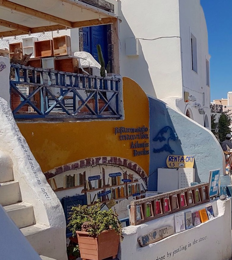 Επίσης, το βραβευμένο βιβλιοπωλείο Aτλαντίδα στην Οία θεωρείται από πολλούς το «ωραιότερο βιβλιοπωλείο στον κόσμο» λόγω της τοποθεσίας του. Θα βρείτε πολλά αγγλόφωνα και γαλλόφωνα βιβλία, πανέμορφα λευκώματα, τελευταίες κυκλοφορίες και βιβλία που σχετίζονται με την ιστορία του νησιού. Τους καλοκαιρινούς μήνες στην Ατλαντίδα θα βρείτε πραγματικό συνωστισμό οπότε οπλιστείτε με υπομονή. Αξίζει.