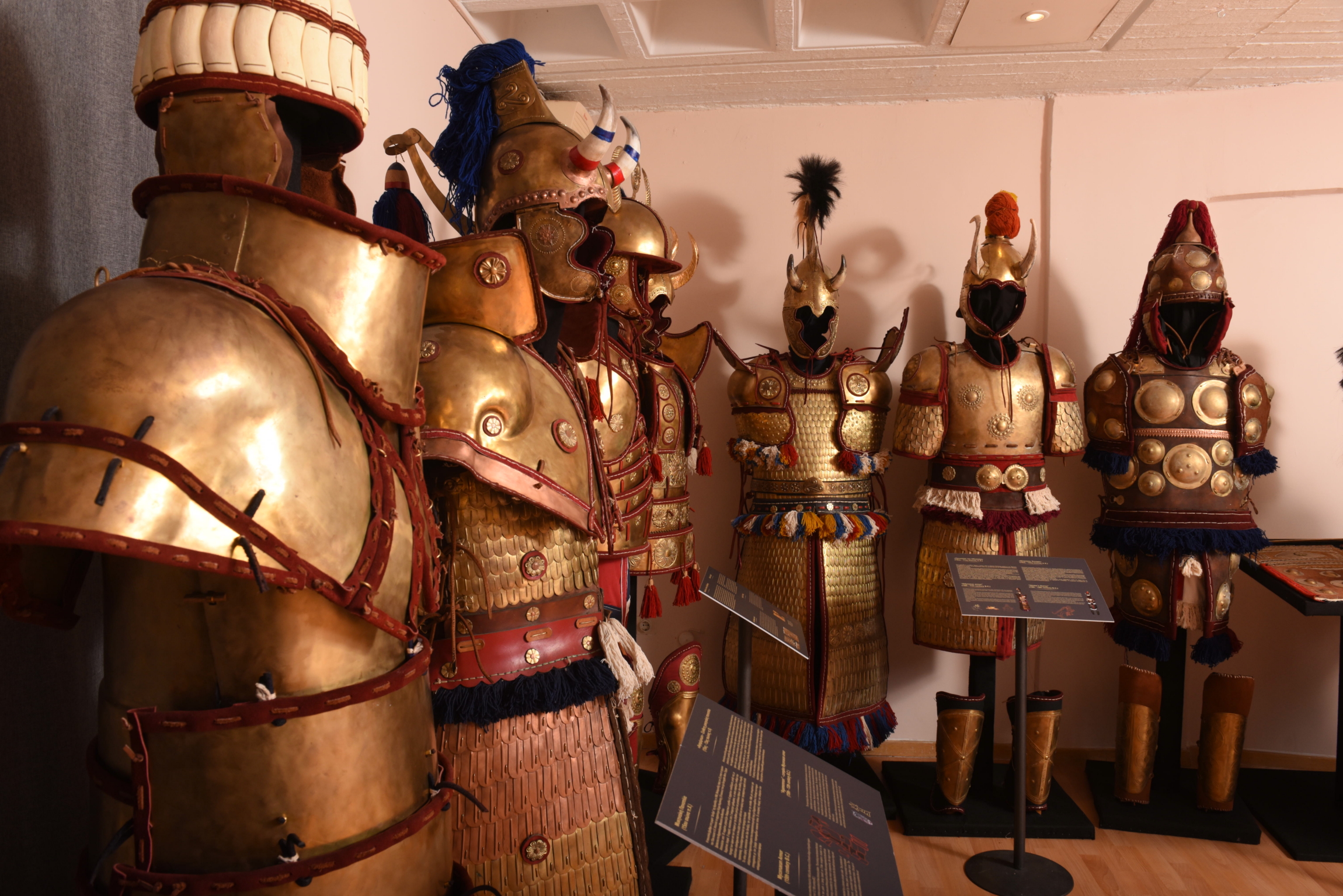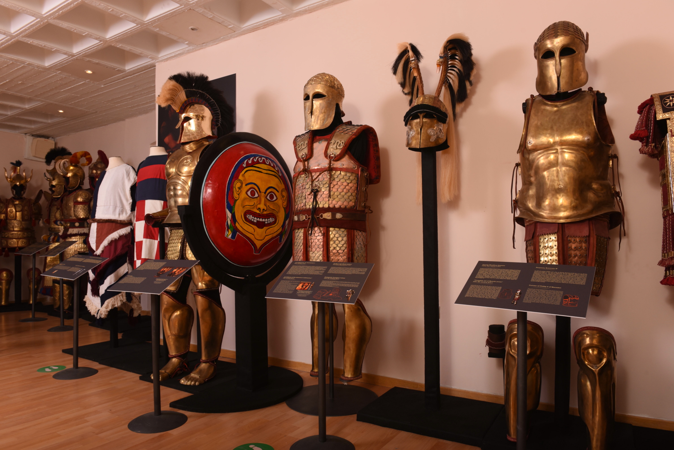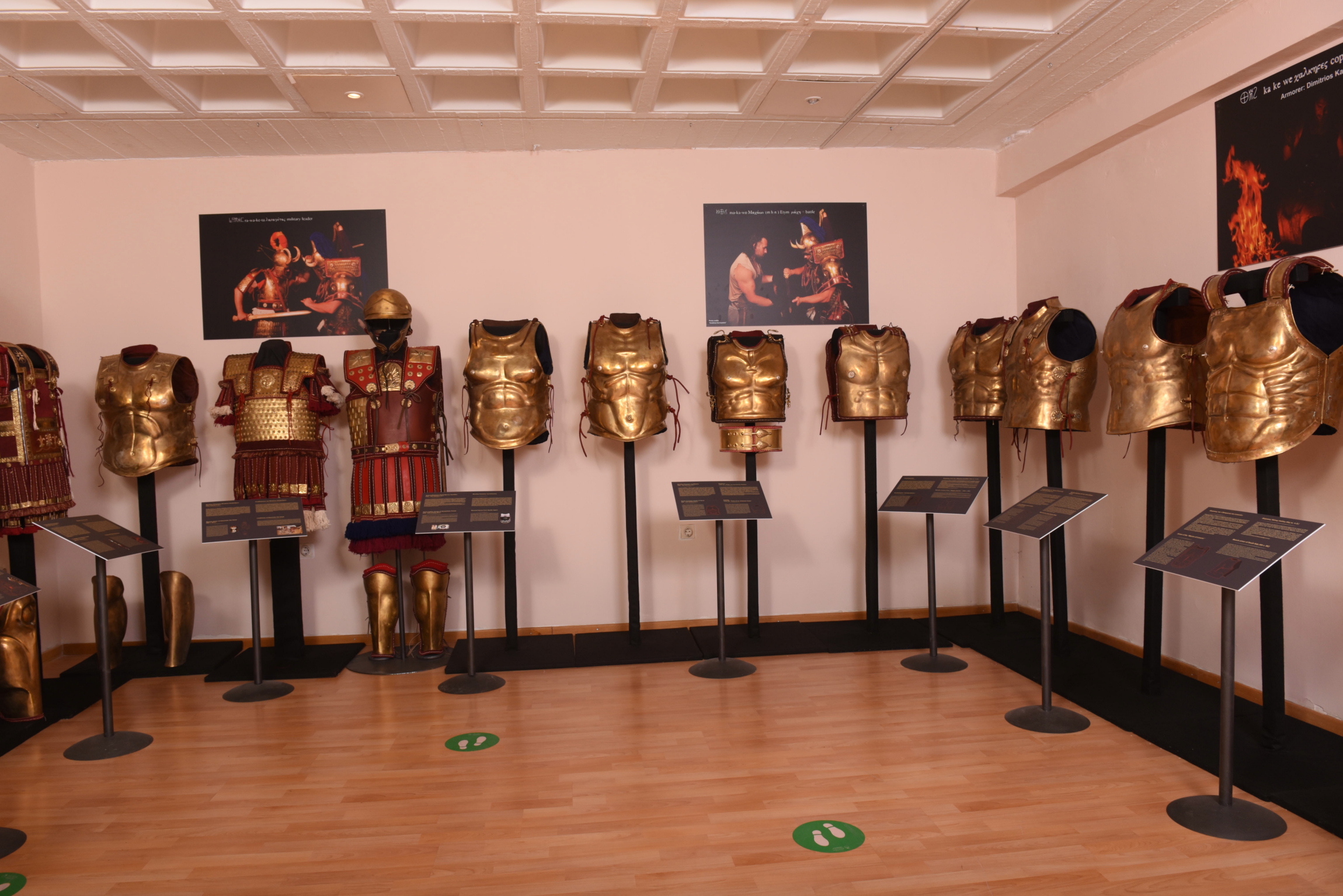 Στην έκθεση, που θα διαρκέσει έως τις 7/1/2023, ο επισκέπτης θα έχει την ευκαιρία να δει και να παρατηρήσει από κοντά φυσικού μεγέθους λειτουργικές πανοπλίες Μυκηναίων Ανάκτων («to-ra-ke»), λινοθώρακες, κωδωνόσχημους και μυώδεις θώρακες οπλιτών της Αρχαϊκής, Κλασσικής και Ελληνιστικής περιόδου, καθώς και Κατάφρακτων που ήταν μονάδα βαρέος ιππικού του βυζαντινού στρατού και όχι μόνο.