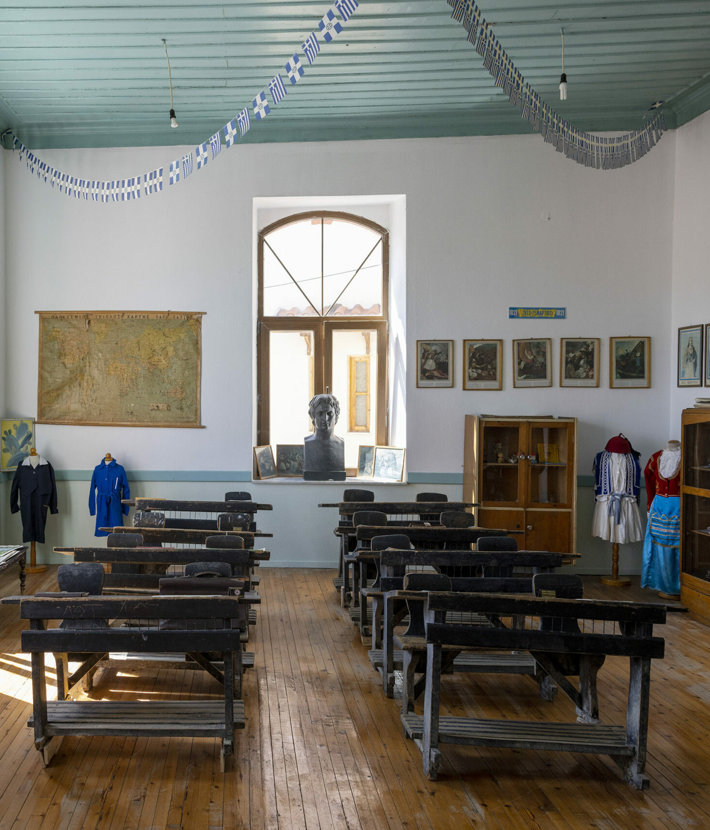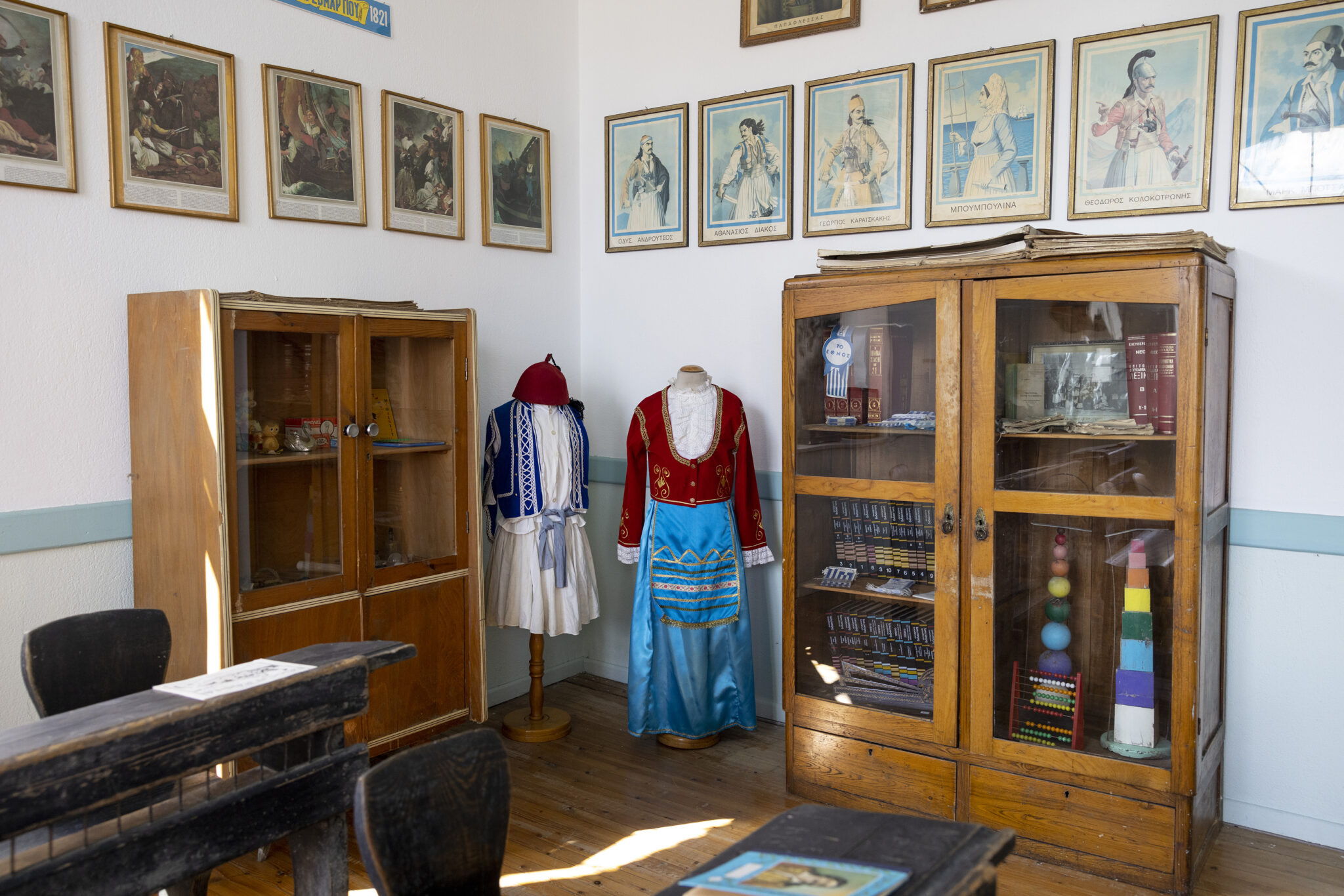 Στη μία πλευρά του σχολείου σώζονται τα θρανία των μαθητών, κάποιες στολές τους, βιβλία τους αλλά και αντικείμενα του δασκάλου όπως η πένα του, ο χαρτοφύλακας του και το καμπανάκι που χρησιμοποιούσε για το διάλειμμα. Στην άλλη πλευρά σώζονται αντικείμενα εκείνης της εποχής από τους ντόπιους όπως ο αργαλειός, οικιακά σκεύη και παραδοσιακές στολές.