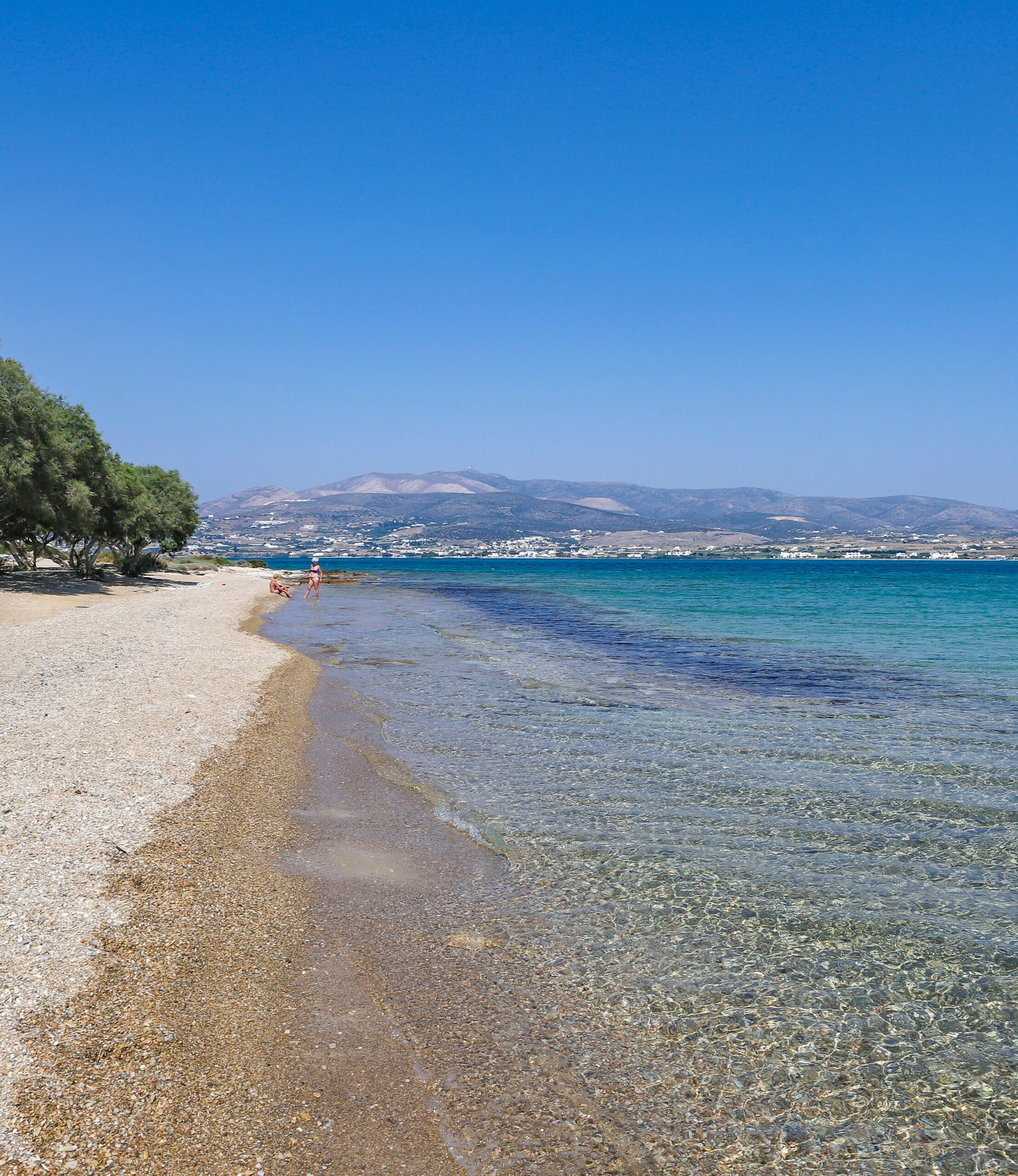 Ωστόσο, μπορείτε να απλώσετε την πετσέτα σας στα αρμυρίκια που είναι στο πίσω μέρος της παραλίας. Καταπληκτική παραλία και το Απάντημα λίγο πιο πάνω με γαλαζοπράσινα νερά και μπόλικα αρμυρίκια, η οποία είναι επίσης οργανωμένη. Αγαπημένη και η μικρή αμμουδερή παραλία του Αγίου Γεωργίου με τα ωραία ψαροταβερνάκια παραδίπλα. Στα δυτικά, εάν έχετε αυτοκίνητο 4Χ4, μπορείτε να δοκιμάσετε να φθάσετε μέχρι την απομονωμένη, μη οργανωμένη, παραλία Μοναστήρια. Αμμουδερή και μη οργανωμένη και η παραλία Λιβάδια, λίγο πιο πάνω όπου μπορείτε να μείνετε μέχρι να δύσει ο ήλιος, ιδανική για ηλιοβασίλεμα και πιο μεγάλη με εύκολη πρόσβαση και η παραλία Σιφνέικο. Πιο κοντά στην πόλη, βρίσκεται η παραλία Ψαραλυκή με ρηχά νερά και αρκετά αρμυρίκια για υπέροχη σκιά, η Παναγιά και η Γλυφά. Κοντά στην πόλη επίσης είναι η παραλία Καλούδια που είναι πολύ ρηχή και ιδανική για μικρά παιδιά και υπάρχει πάντα και η παραλία γυμνιστών για όσους αρέσκονται στο σπορ. Σημειώστε όσοι δεν το γνωρίζετε ότι το νησί -όπως και η γειτονική Πάρος- είναι προορισμός για τους απανταχού λάτρεις των windsurf και kitesurf τους οποίους θα δείτε κυρίως στην Ψαραλυκή και τα Γλυφά.