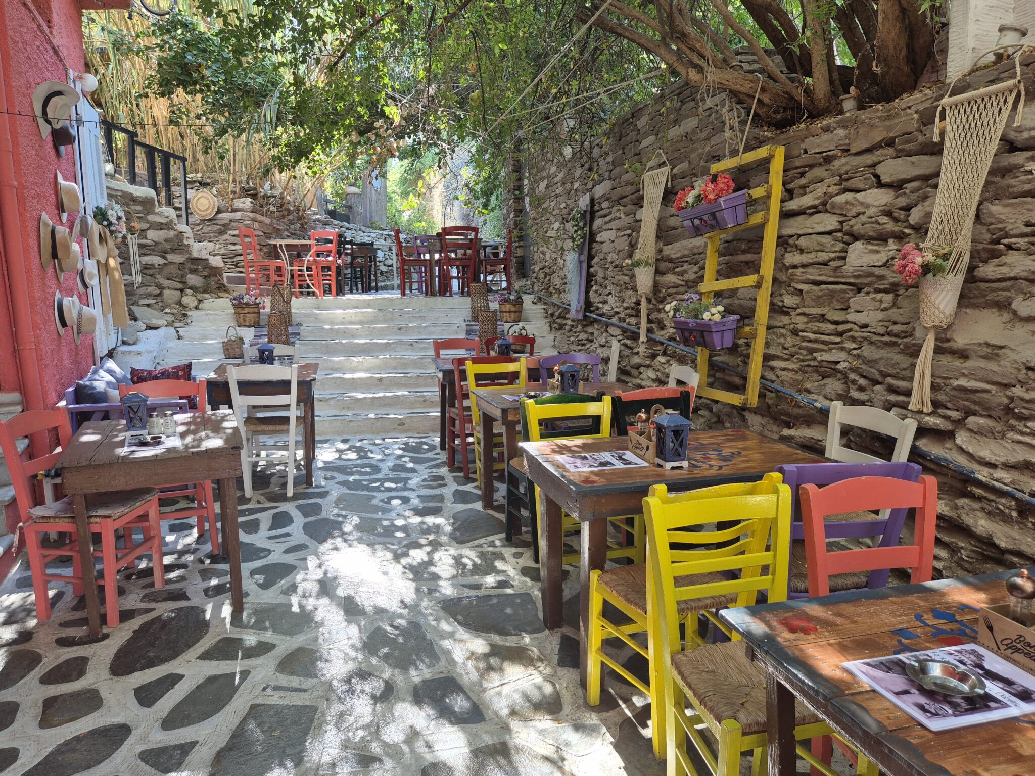 Είναι πραγματικά δύσκολο να απαρνηθεί κανείς έστω και για λίγο τόσο όμορφα ακρογιάλια, γι’ αυτό και αφθονούν οι επιλογές εστίασης στην αμμουδιά της κεντρικής παραλίας. Όσο εσείς γευματίζετε, μπορείτε άνετα να επιβλέπετε τα μικρά παιδιά που παίζουν στην άμμο και, χωρίς να απομακρυνθείτε, να συνεχίσετε τη μέρα σας στην παραλία. Για ένα διαφορετικό, πιο ήρεμο σκηνικό κι ένα χαλαρό γεύμα με ουζάκι και θαλασσινά μεζεδάκια, αναζητήστε το απλωμένο σε διαφορετικά επίπεδα «Καφενεδάκι της Ελένης», με το ελαφρώς μποέμ περιβάλλον και την ξεχωριστή διακόσμηση που έχει επιμεληθεί η ιδιοκτήτρια, στολίζοντας με φαναράκια και κουρελούδες τα σκαλιά που οδηγούν στο σοκάκι της Πίσω Βρύσης και διαμορφώνοντας μια βεράντα σαν πραγματικό κήπο με ζωγραφισμένα από την ίδια παλιά τραπέζια που στήνονται κάτω από σκιερά δέντρα, αφήνοντας την πολυκοσμία και τους έντονους ρυθμούς του υπόλοιπου χωριού να μοιάζουν για λίγο πολύ μακρινοί.