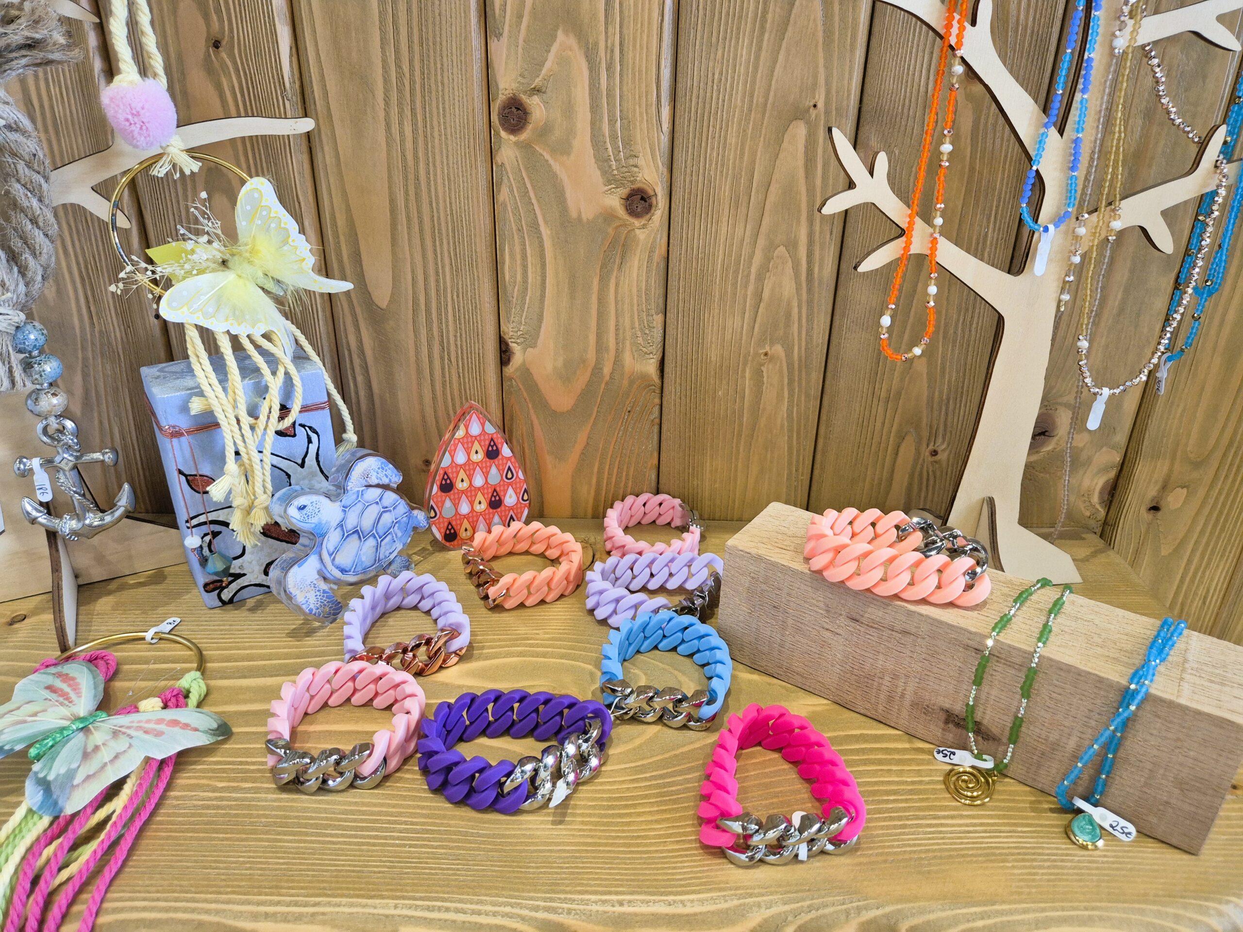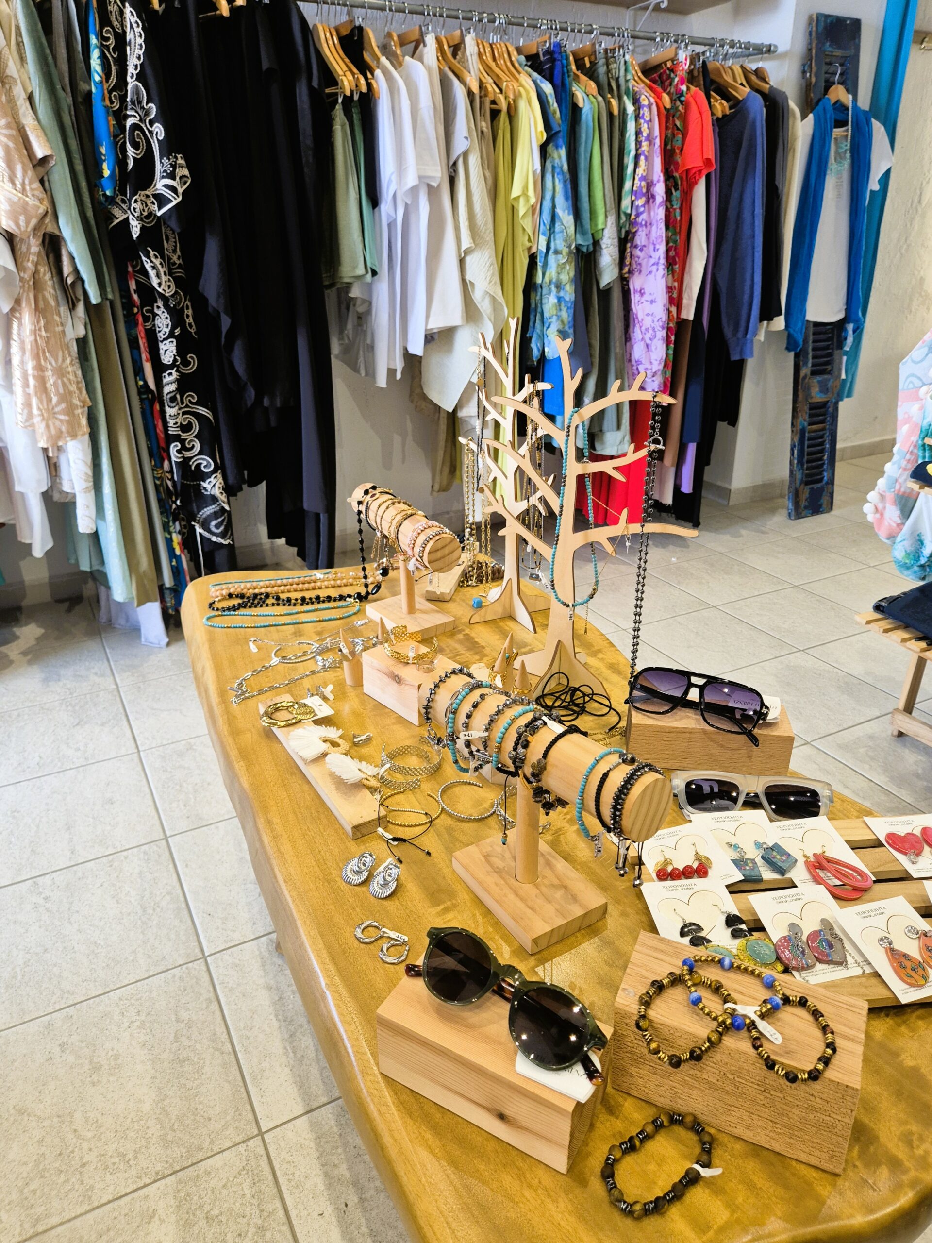 Σε διαφορετικό ύφος, στο «Demode», που θα εντοπίσετε από τα στιλάτα αξεσουάρ που απλώνονται κάτω από τη μεγάλη μουριά μπροστά από το κατάστημα, αναζητήστε τα πολύχρωμα μεταξωτά φορέματα που φτάνουν στις βιτρίνες του αποκλειστικά από τη Νάξο, σε ένα καλειδοσκόπιο καλοκαιρινών τόνων, ιδανικά για να ντύσουν τις βραδινές εξόδους σας στα νησιά, και ολοκληρώστε με αντίστοιχα κομψές εσάρπες, καπέλα από φυσικά υλικά αλλά και μοναδικά, θεαματικά κοσμήματα, όλα επιλεγμένα από την Αθηναία ιδιοκτήτρια, στο γούστο της οποίας αποτυπώνονται οι σπουδές της στη Σχολή Καλών Τεχνών της Βενετίας. Στιλάτα ρούχα και αξεσουάρ γεμίζουν και τον απέριττο χώρο του «Φιλότεχνο», με την υπόσχεση να δώσουν μια νησιώτικη νότα στο ντύσιμό σας, με αέρινα καφτάνια, χειροποίητες τσάντες, κομψά σανδάλια και διακριτικά κοσμήματα. Ακριβώς δίπλα, στο «Ιδιόρυθμο», θα βρείτε την ιδιοκτήτρια να ξεδιπλώνει τη φαντασία της, δημιουργώντας χειροποίητα κοσμήματα σε διακριτικά σχέδια ή εντονότερα μοτίβα, αλλά και εμπνευσμένα από την Άνδρο ζωγραφικά έργα πάνω σε ξύλο, όλα ανάμεσα σε μια ακόμη συλλογή από ενδύματα και τσάντες καλοκαιρινού ύφους.